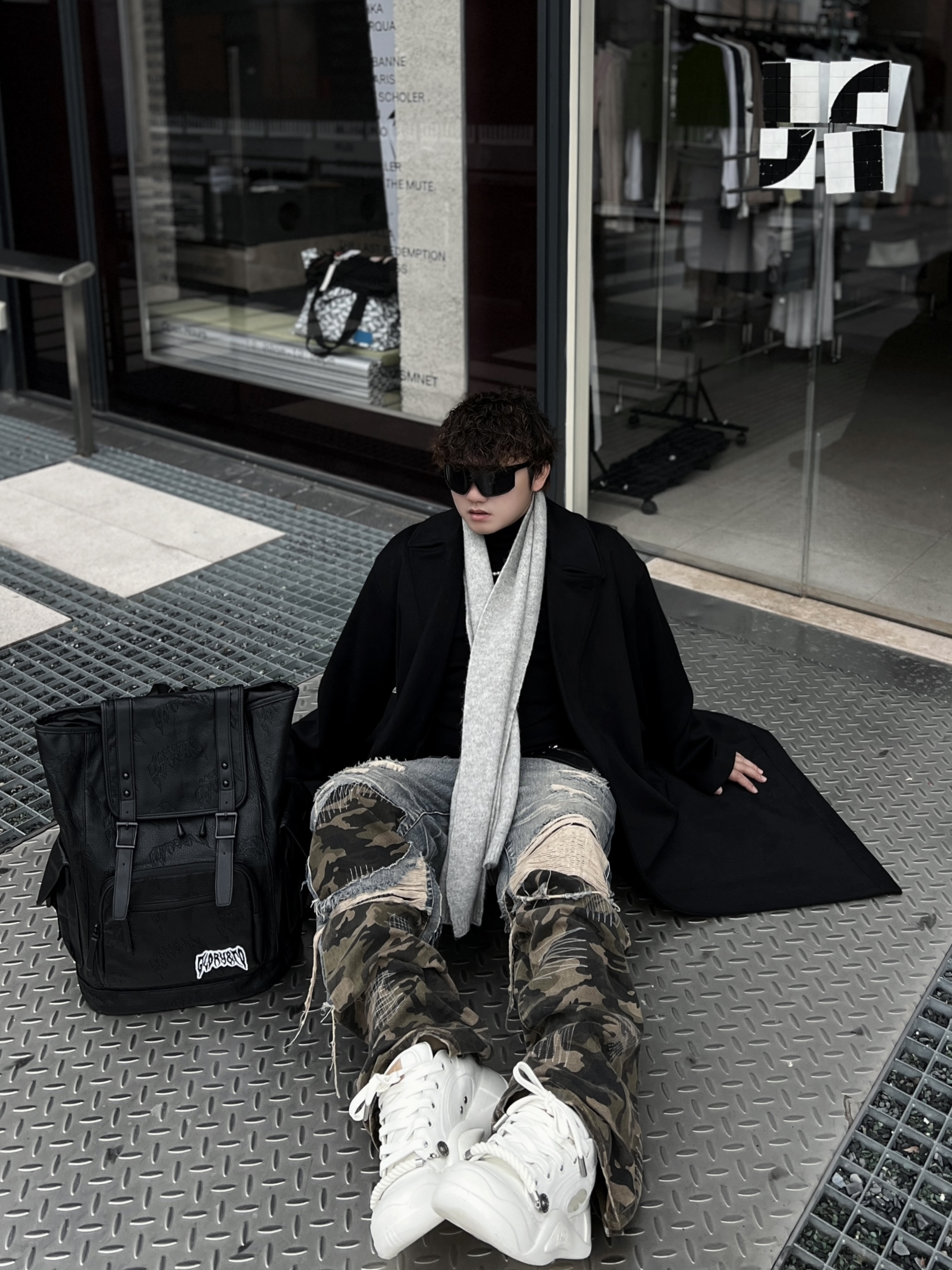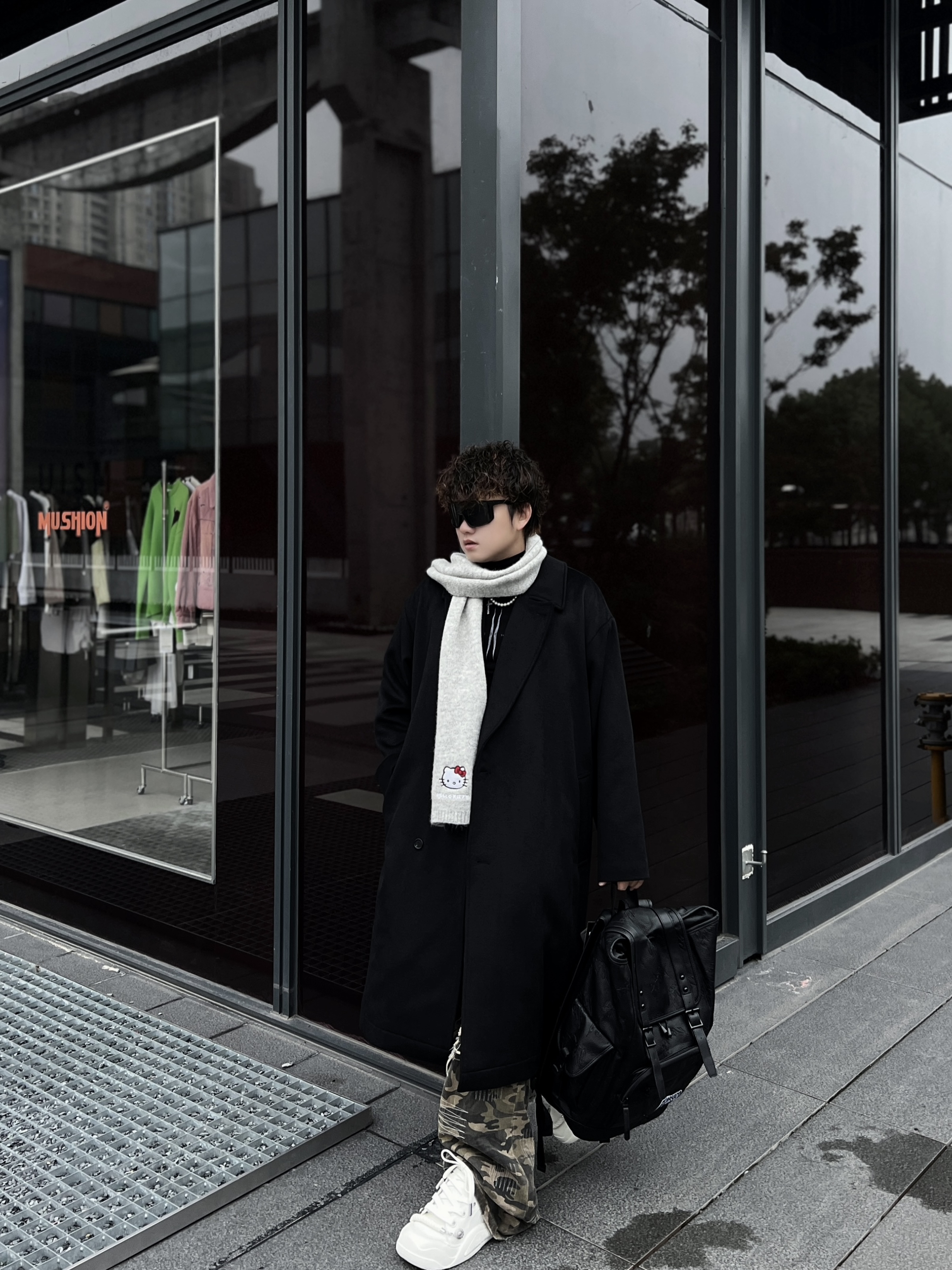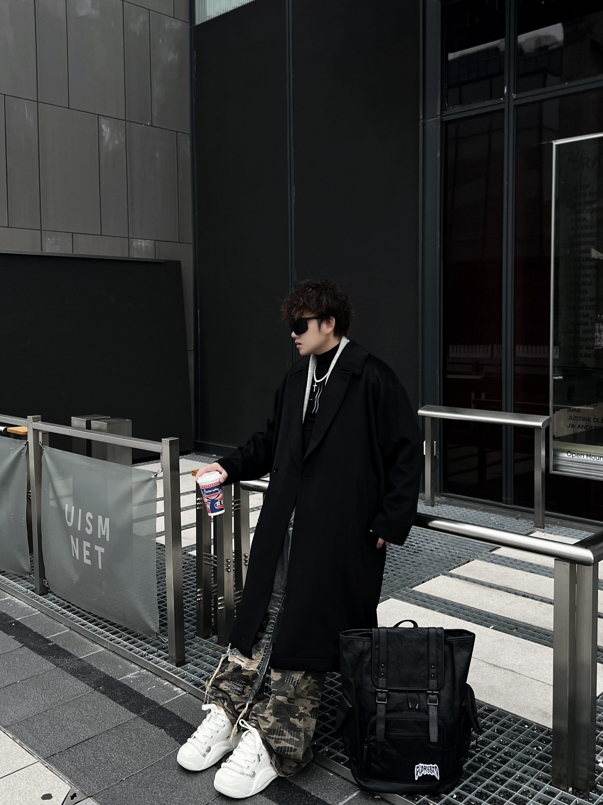 ‼️秋冬的时尚感总是来的要早一点📸 大衣🧥真的能改变穿搭品味 长款黑色就算是小个子也能轻松驾驭 自己要你选对单品叠加就Ok了☝️ 💥迷彩拼接长裤与白色面包鞋的叠加 在色调上真的是完胜了!
