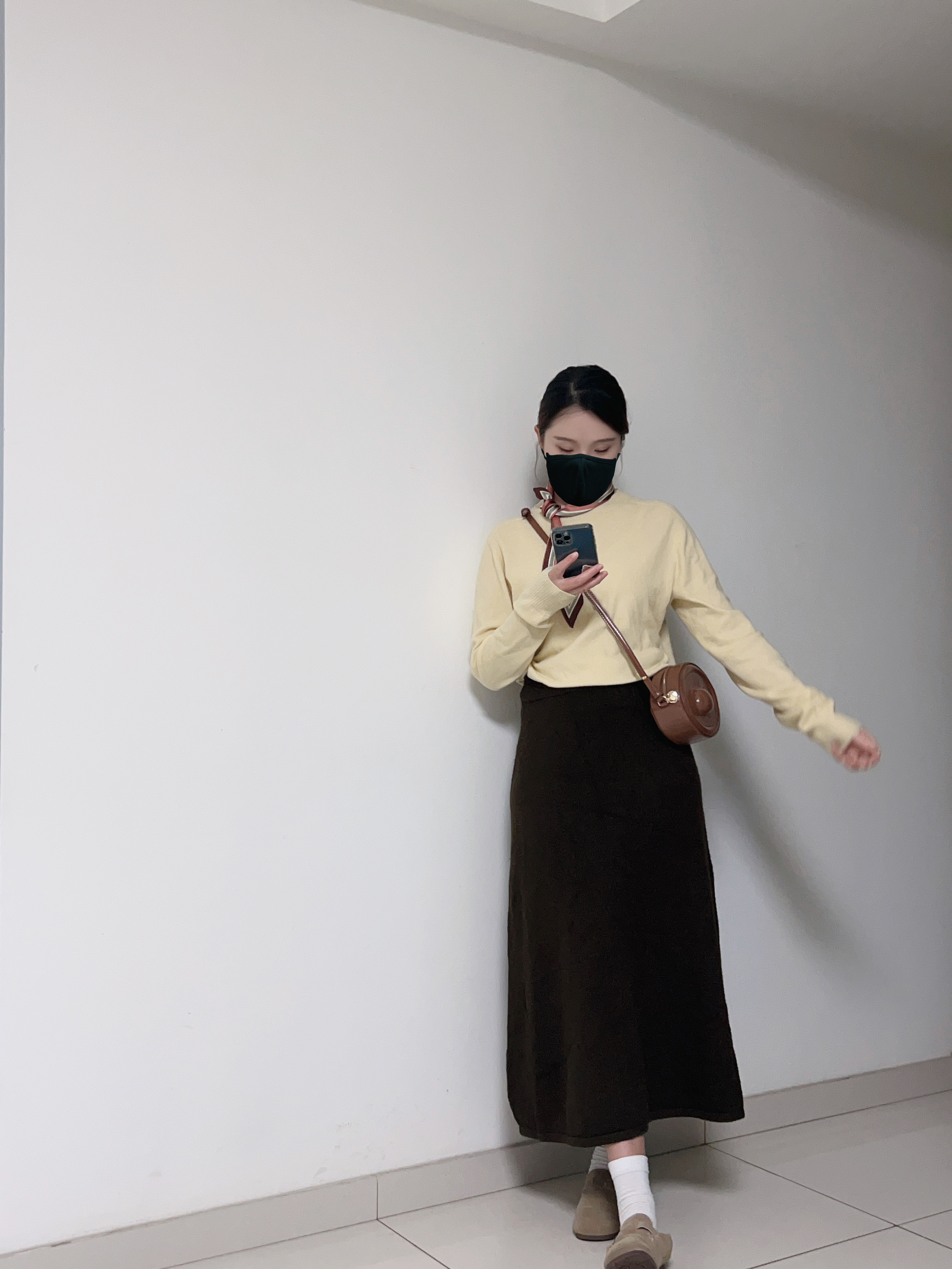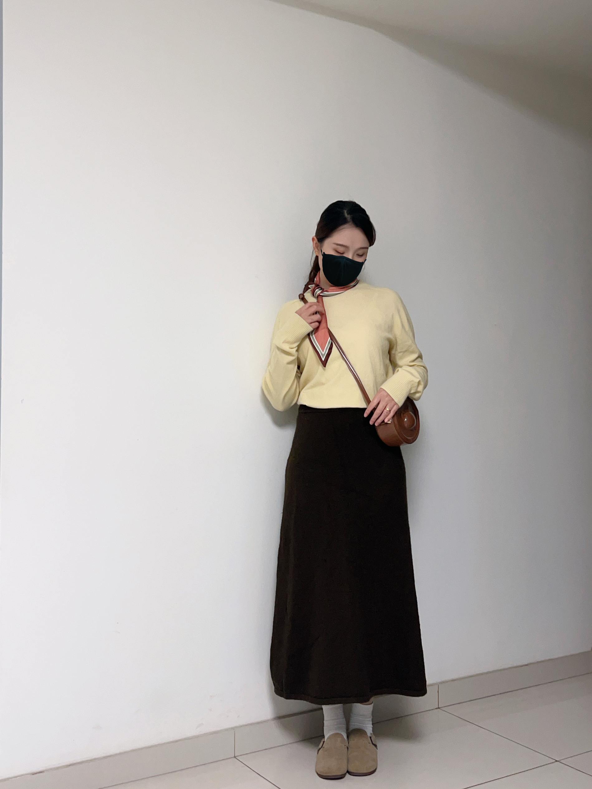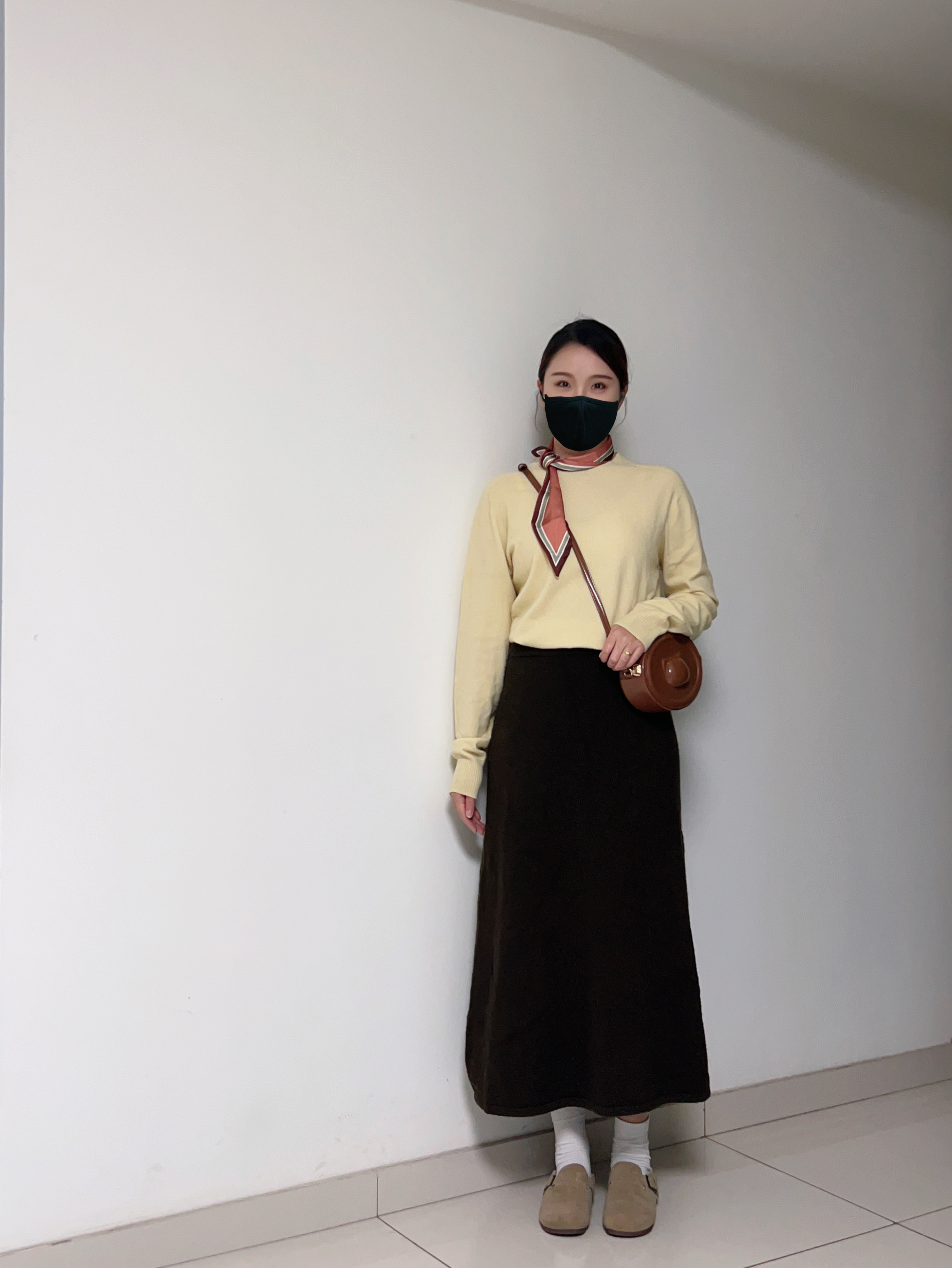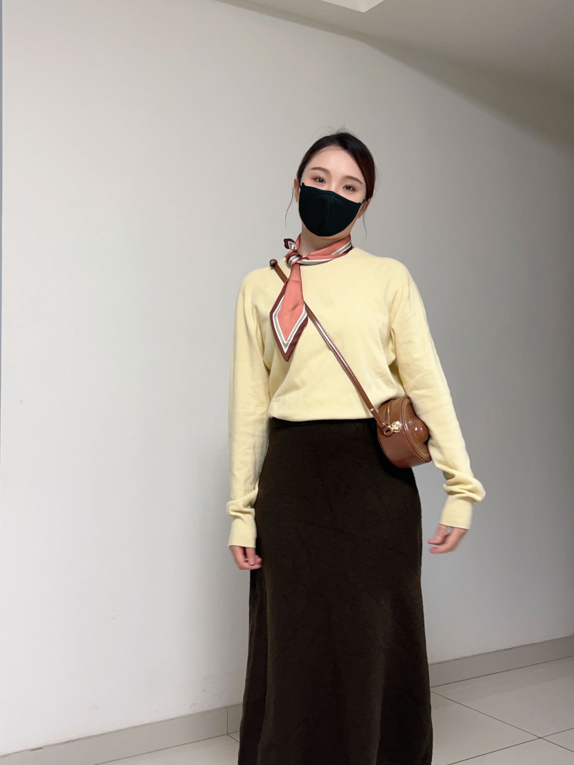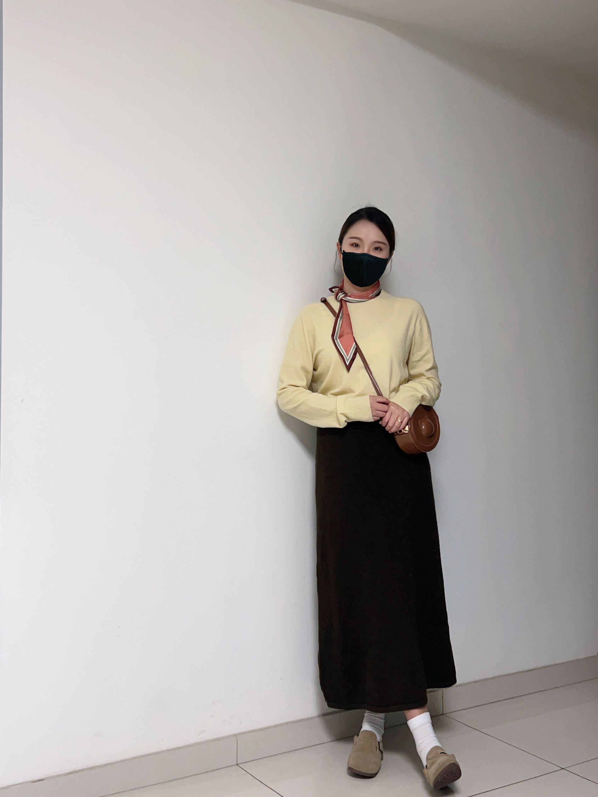 一衣多搭赋予了衣服本身更多的意义 这件鹅黄色毛衣出场多次了 今天分享的是韩系温柔的感觉 搭配思路: 1、下半身搭配一条深棕色长款毛线伞裙,深棕与鹅黄色的碰撞协调又不失可爱。 2、毛衣本身是基础款款式,扎进去穿可以更好的体现身材比例,再来一条红柚色与巧克力色相间的丝巾系在脖颈,整个人看起来瞬间夺目了。 3、鞋子选择了百搭勃肯,松驰又自然。 OK,小姜的韩系温柔穿搭➕1。