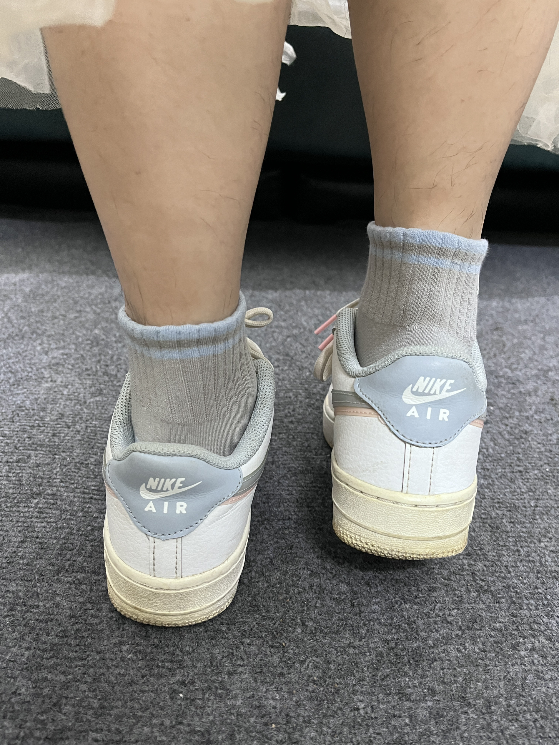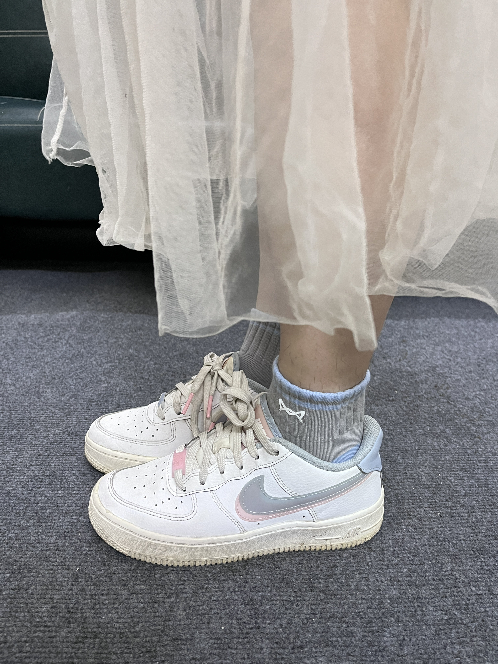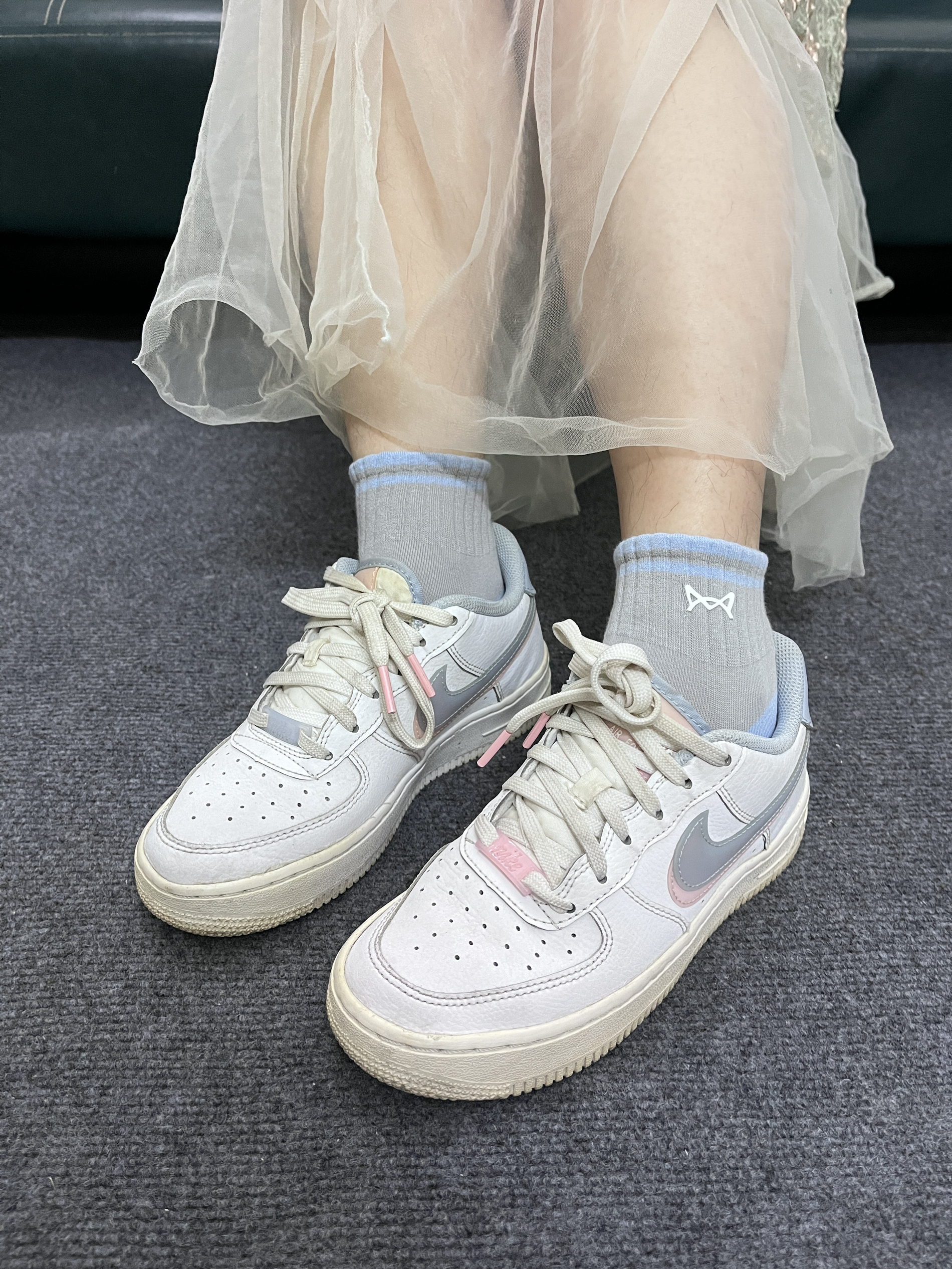 女友脚上的这白粉蓝空军一号, 可以说是标准的小白鞋, 特别之处是鞋侧的粉蓝双钩logo, 看起来清爽干净又有小仙女范👍 女友说穿上脚之后感觉很贴合, 走路跑跳都不会掉跟, 日行万步也觉得轻松舒适, 厚底还有些增高效果呢, 配上裙子👗简直太赞了👍