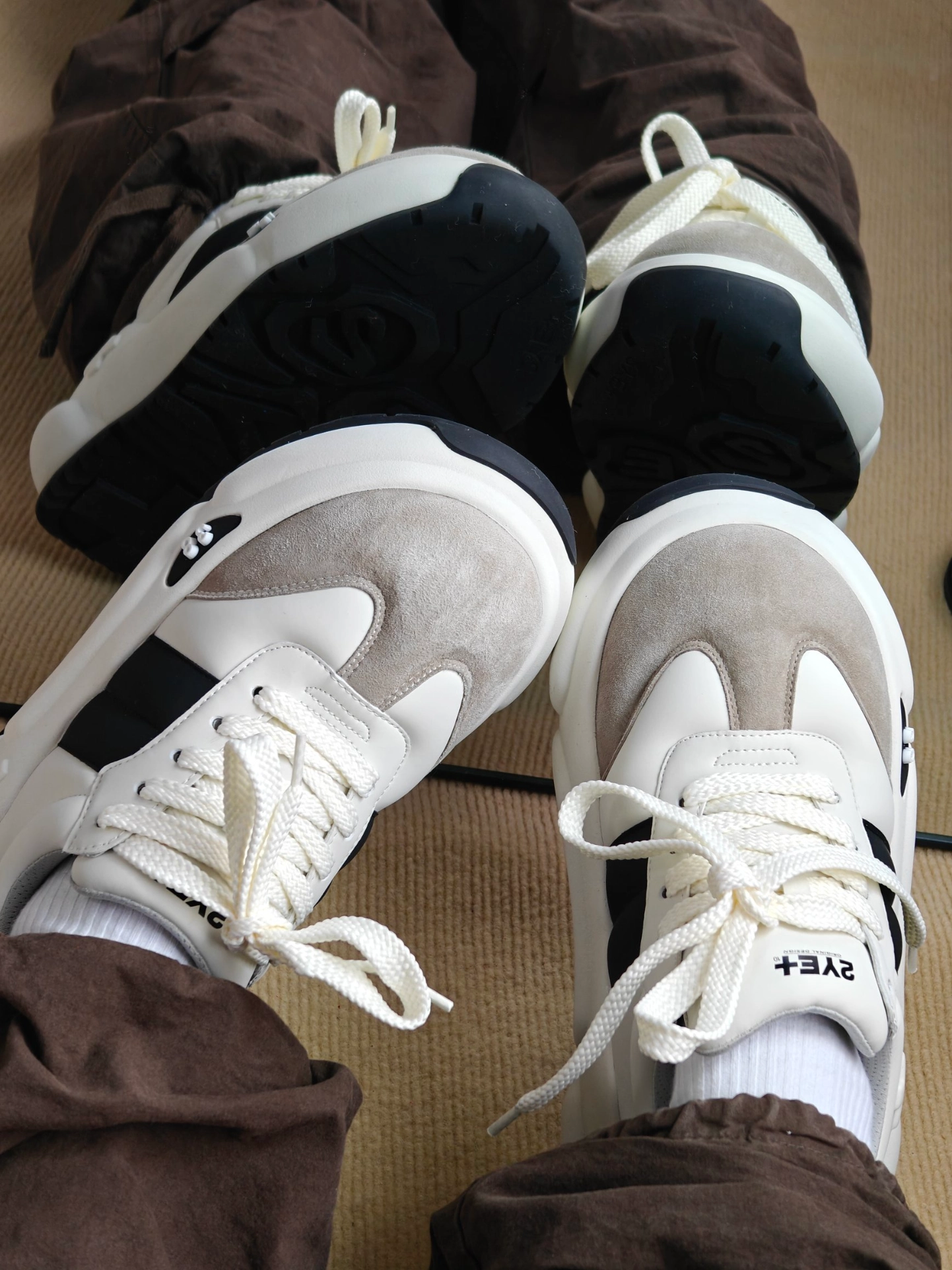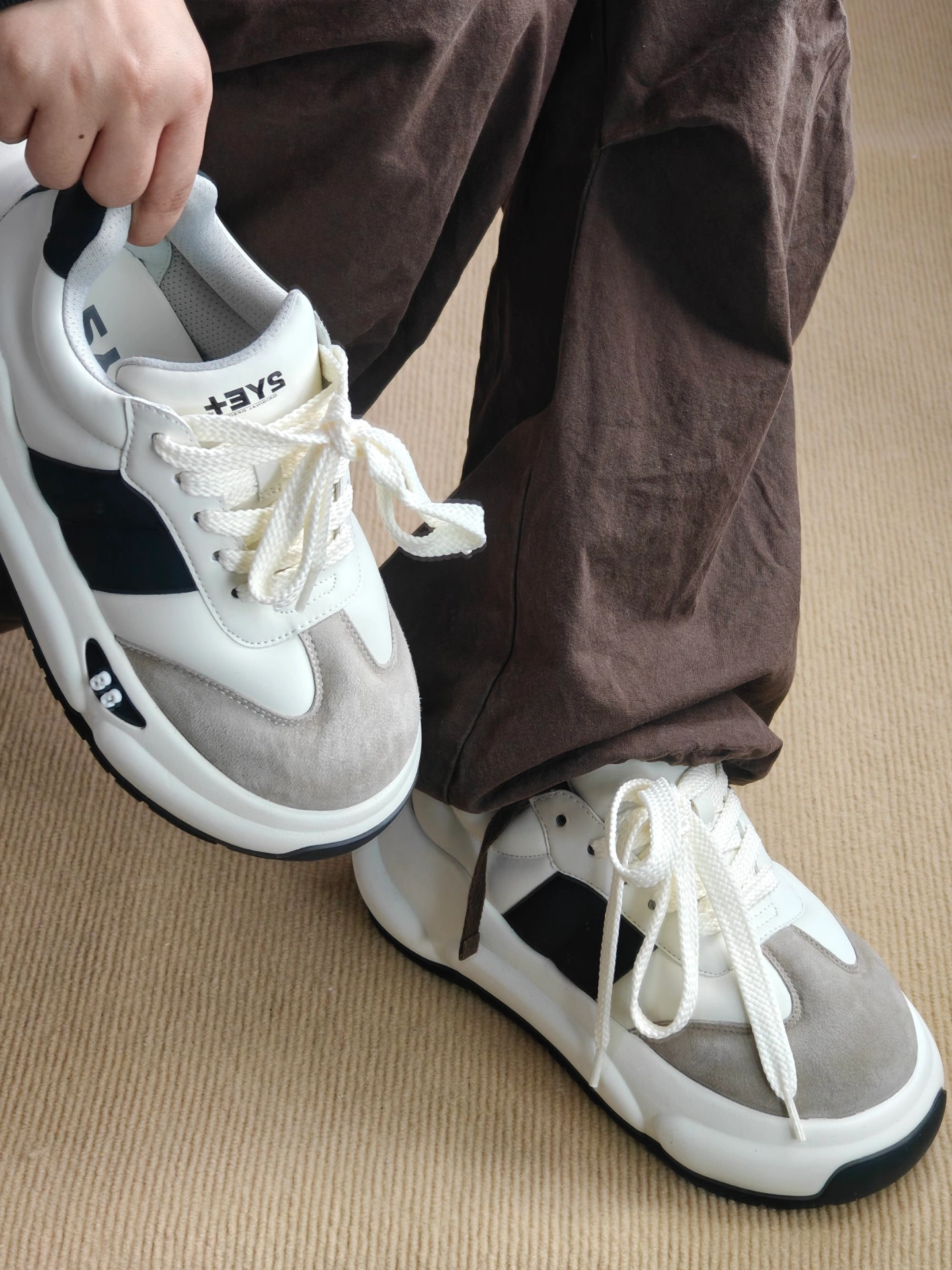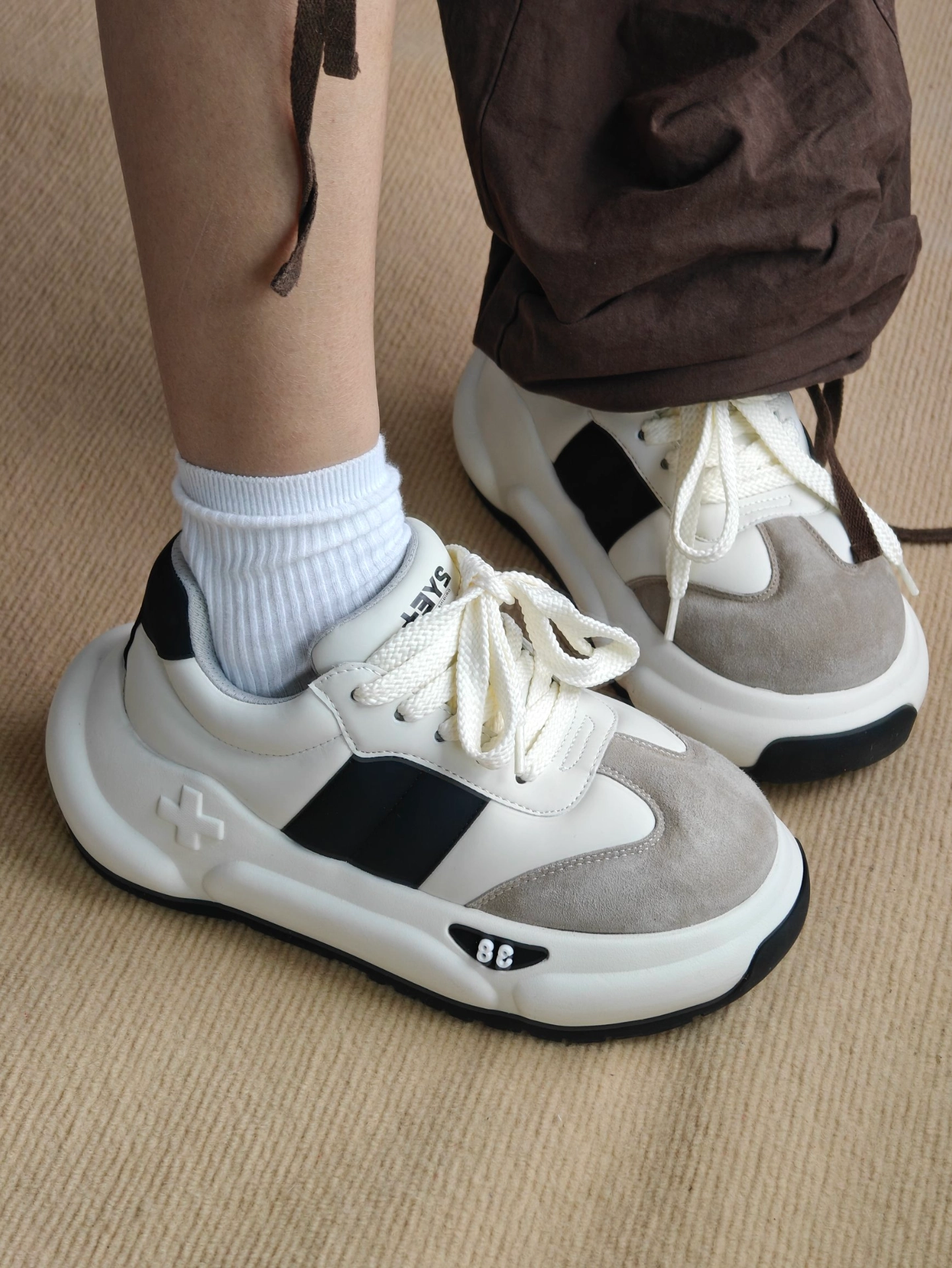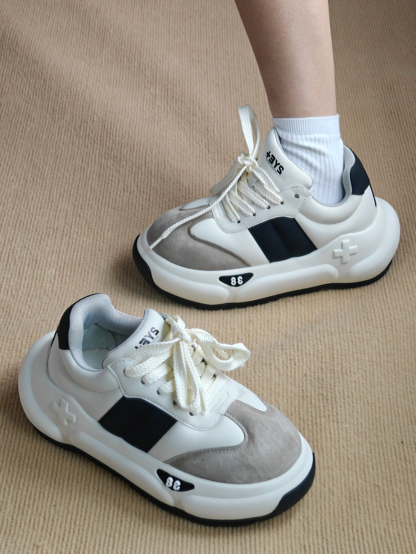 😍今天分享一款超酷的墩墩鞋-2YE+!👏 💥这款鞋的设计真的绝了,它是白色、灰色和黑色的拼接款,三种颜色搭在一起超级时尚,满满的潮流感🤩。鞋头是绒面材质的,摸起来手感超棒,整体鞋面是皮革材质的,而且很有质感🧐。 👀鞋舌和鞋跟处的品牌标志简直是点睛之笔,低调又不失个性😏。鞋底厚厚的,穿起来超级舒服,日常出行、逛街什么的完全没问题,走再多路也不会累脚哦👣 💕真的爱惨了这款2YE+墩墩鞋,上脚非常舒适软...