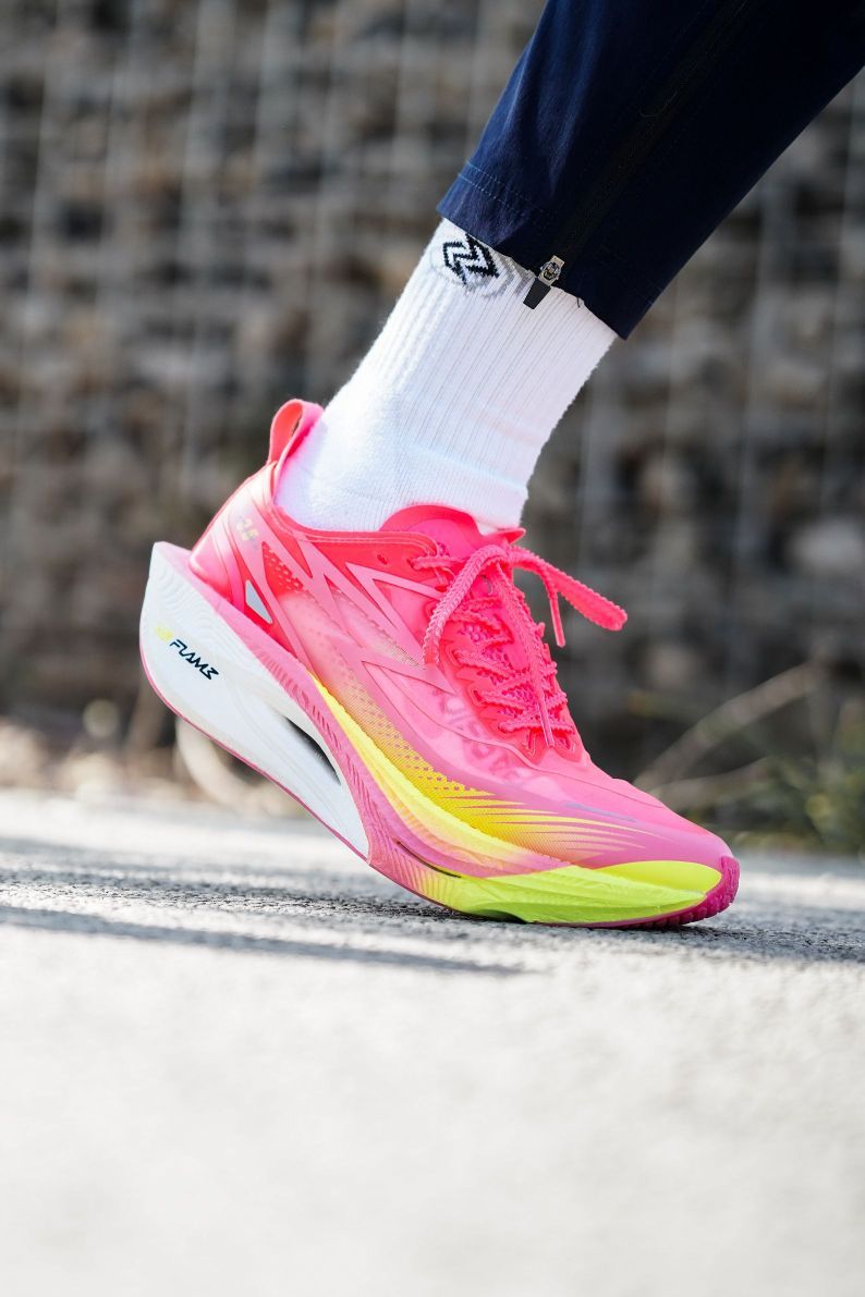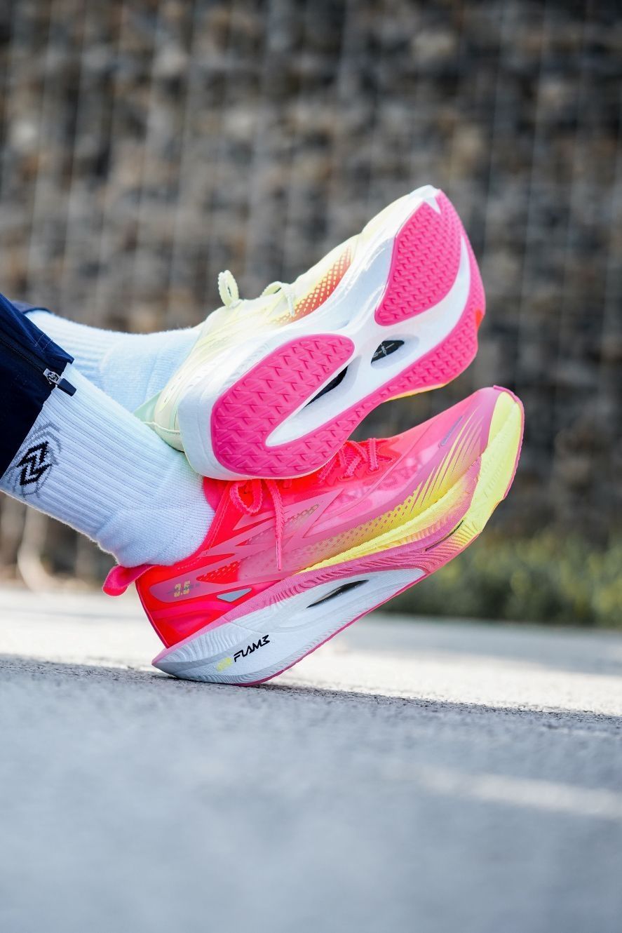 飞燃3.5的反转鸳鸯配色来了 这粉色饱和度调的有点怪怪的 但是整体上颜值还算是可以的 飞燃3.5的鞋面相比3改变挺大 我个人还是更喜欢3的鞋面 上脚感受几乎是一模一样的 4开价位整体上还是挺值的