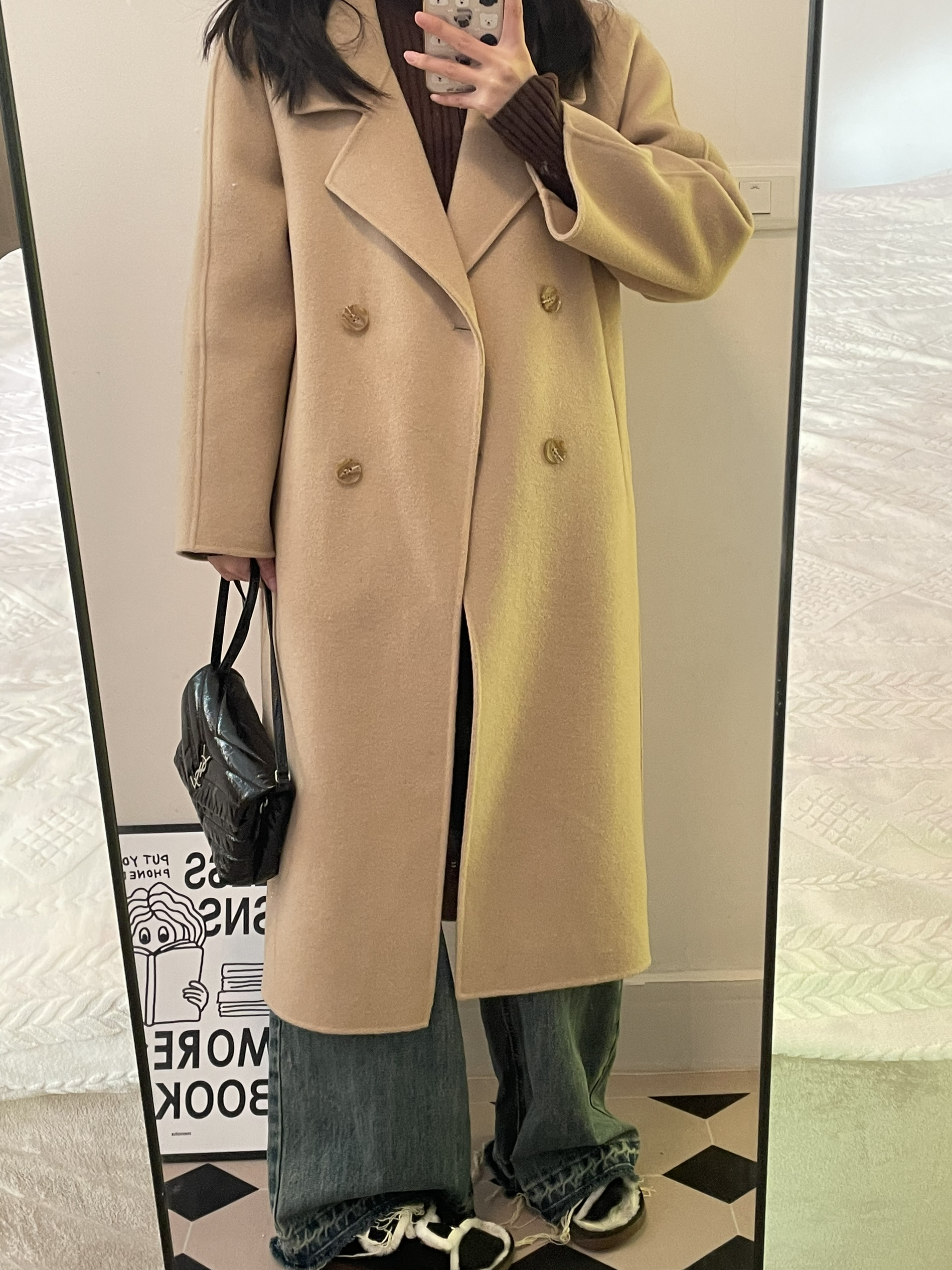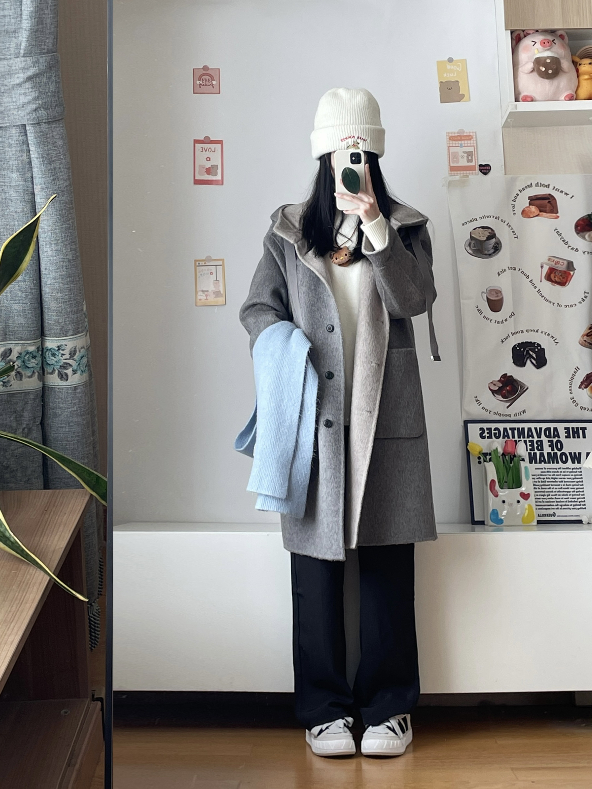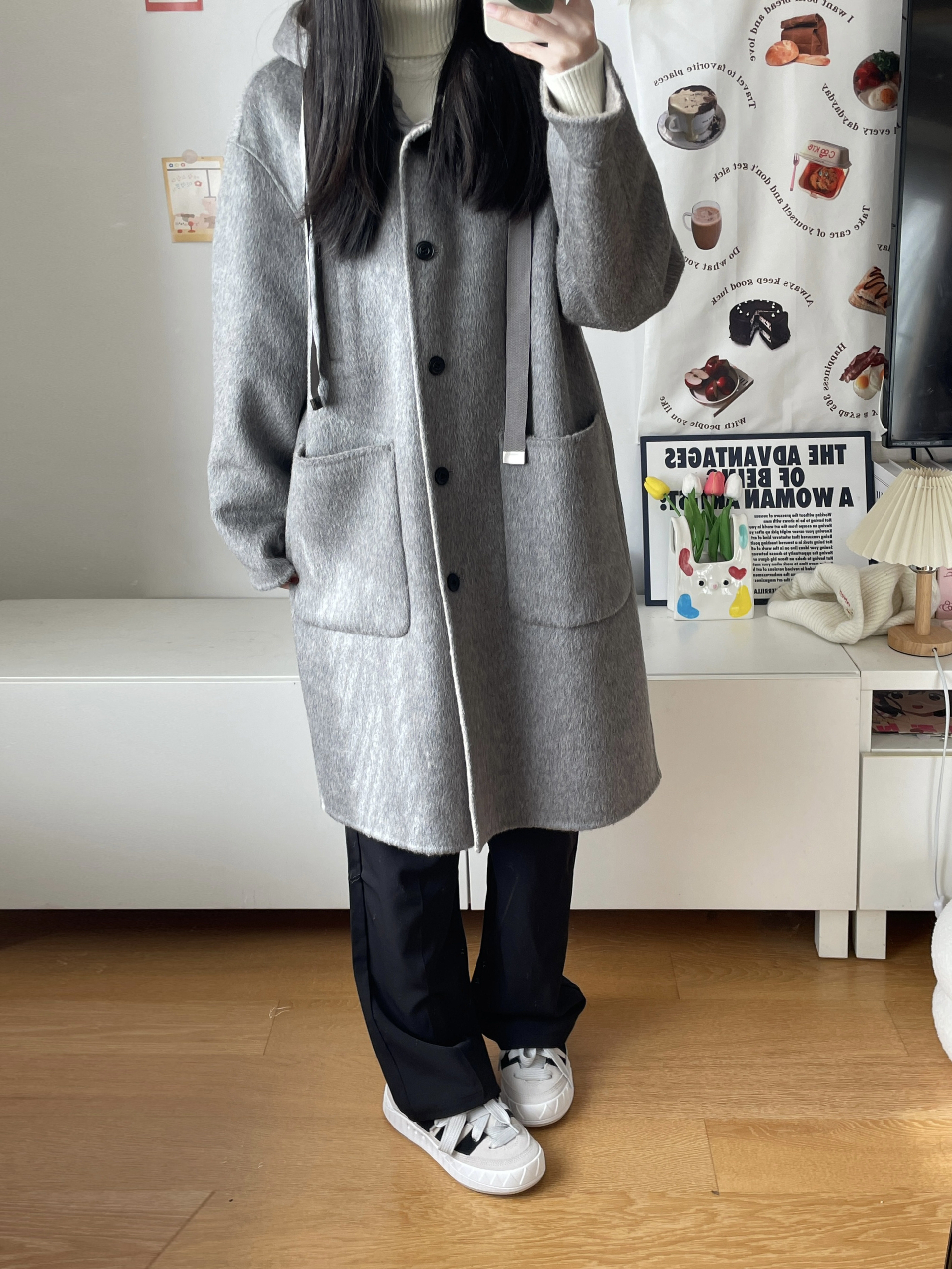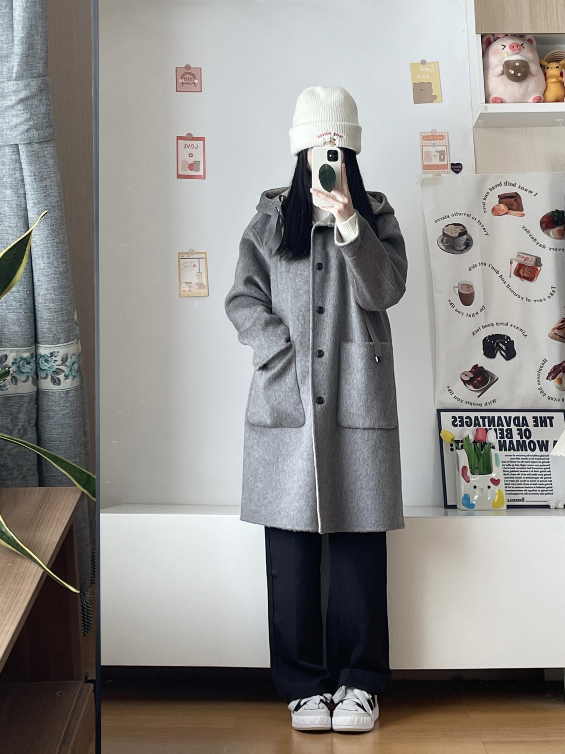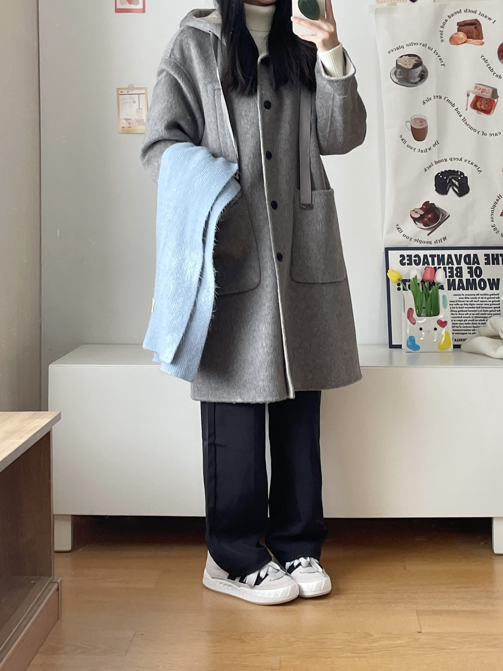 到了可以穿大衣的季节 基础款的灰色系真的好显白! 这件还是绵羊毛的材质 软软的垂感挺不错的 内搭了高领毛衣 搭了条黑色休闲裤 简单好穿的一身~