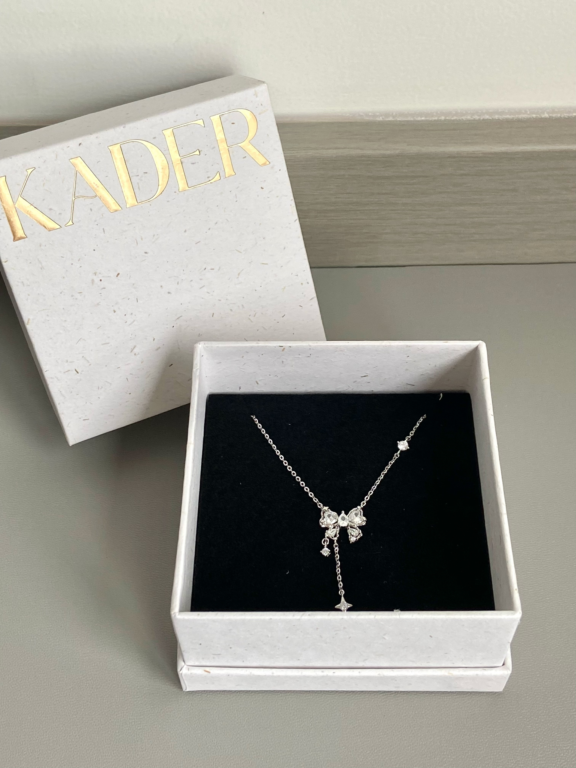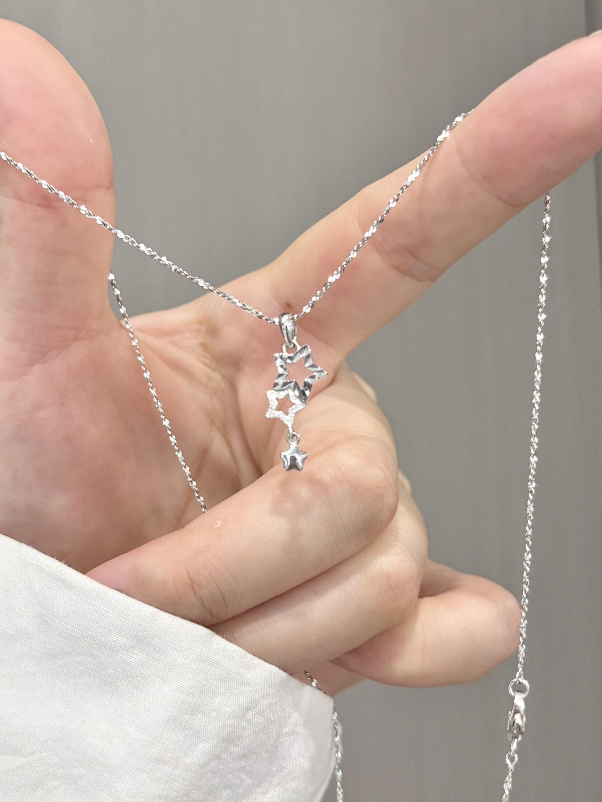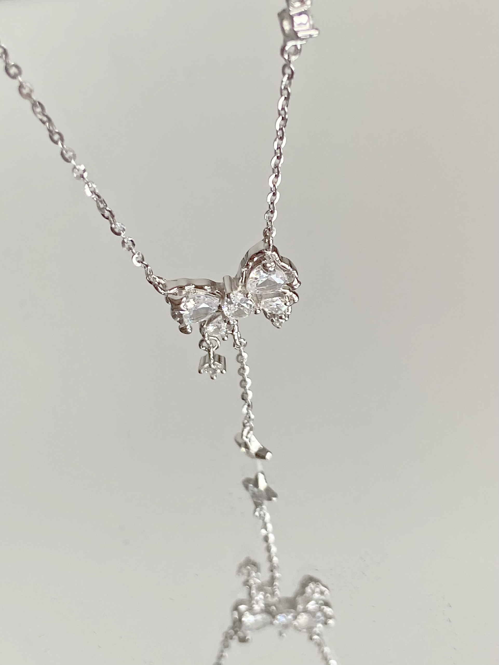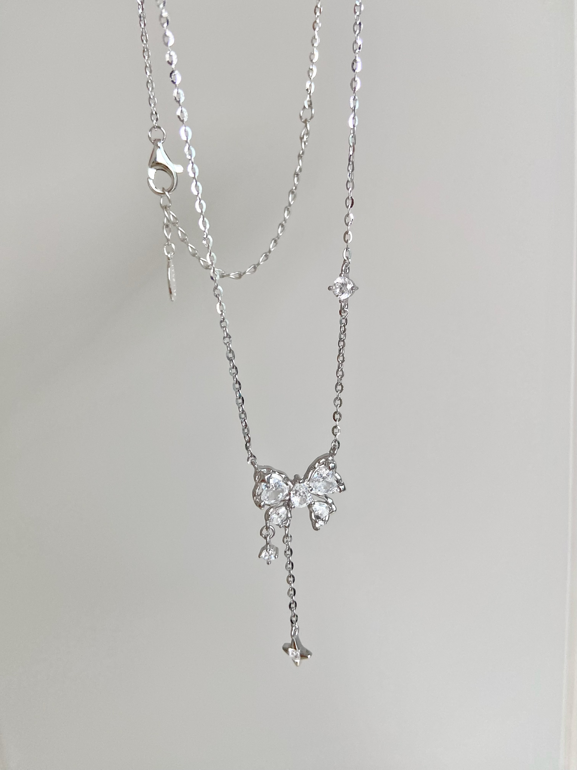 会永远为蝴蝶结心动!! 精致小巧的蝴蝶结🎀 下面还有两个小吊坠 都镶嵌了钻石 超级灵动~ blingbling✨的真的超爱! 链子上还有一颗钻和一个小星星 细节做到位了☺️ 搭配衣服真的超好看啦! S925银的材质戴着很舒服 而且不易氧化