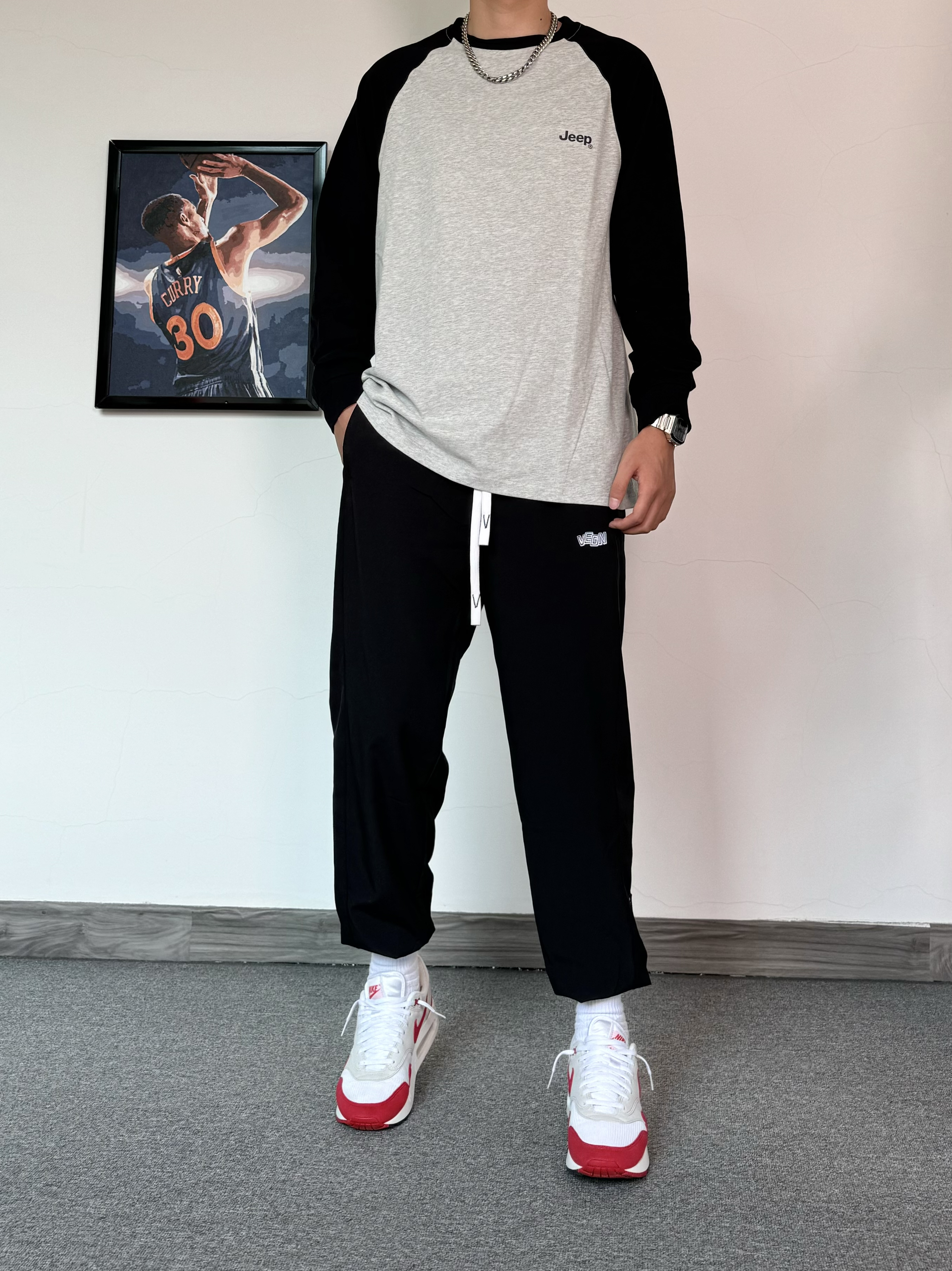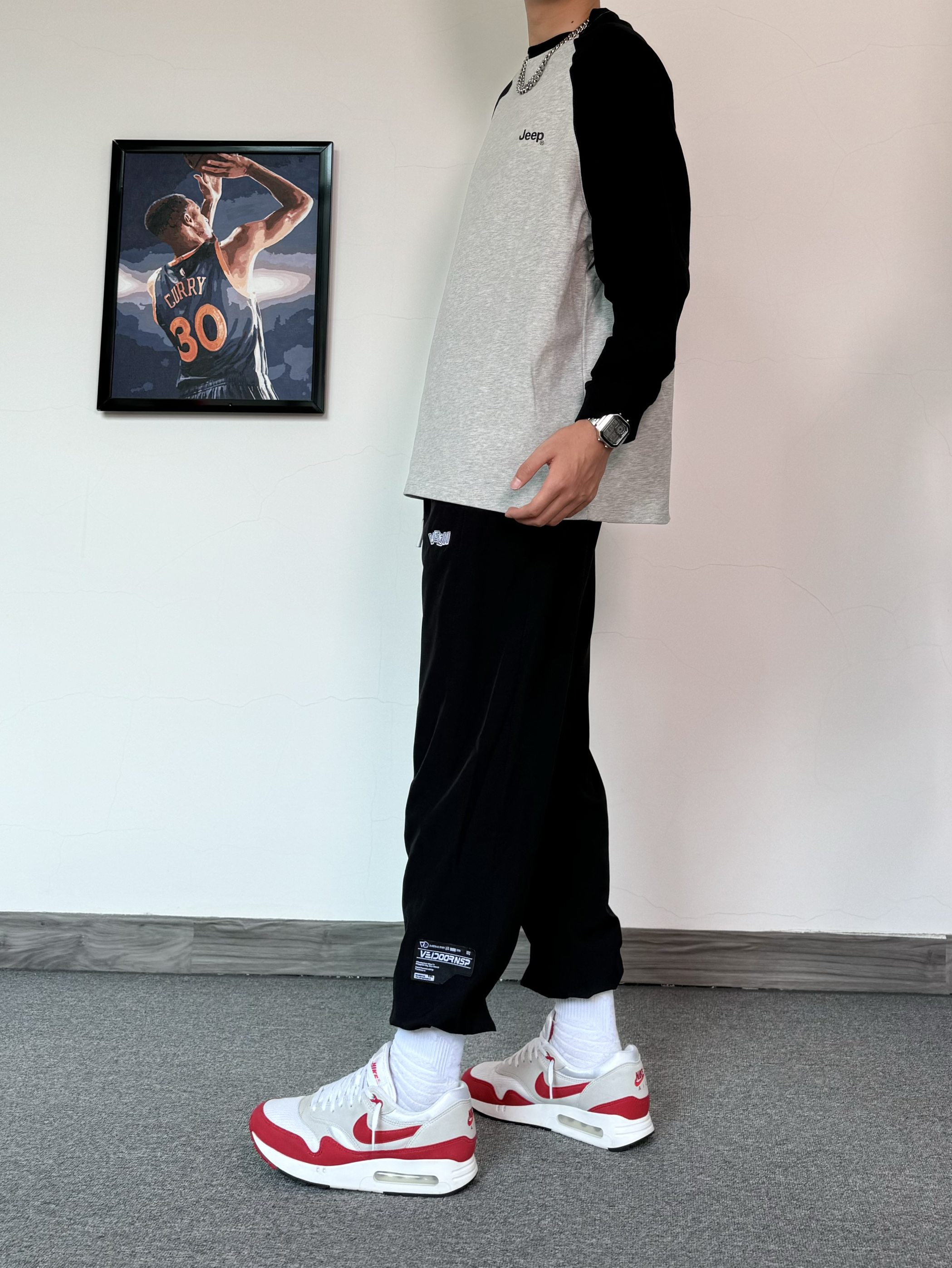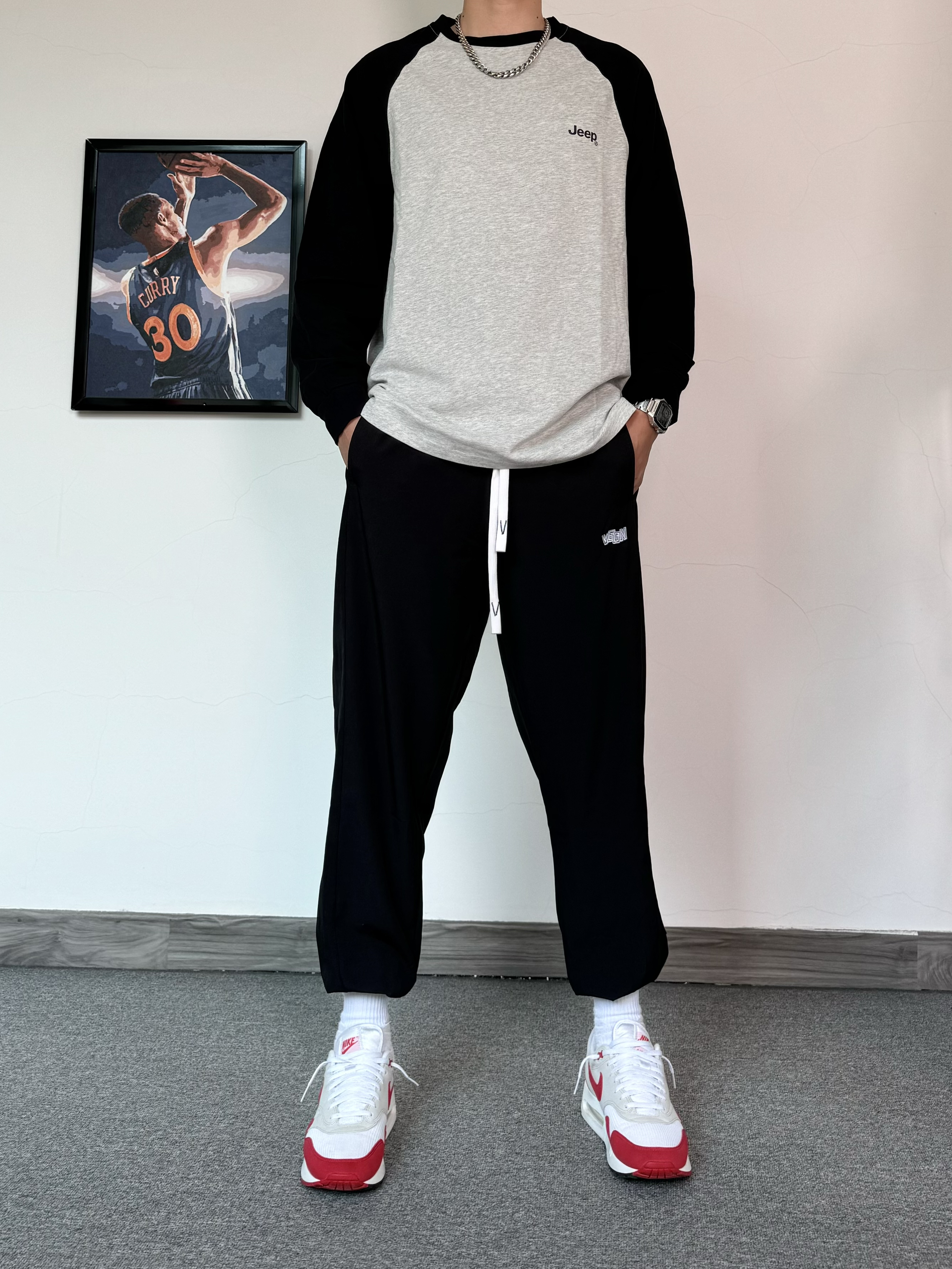插件T恤上身真的帅 黑灰拼接配色主打一个百搭 面料真心不错 很贴肤 搭配黑色束脚裤➕白红配色运动鞋 一身更有运动感咯