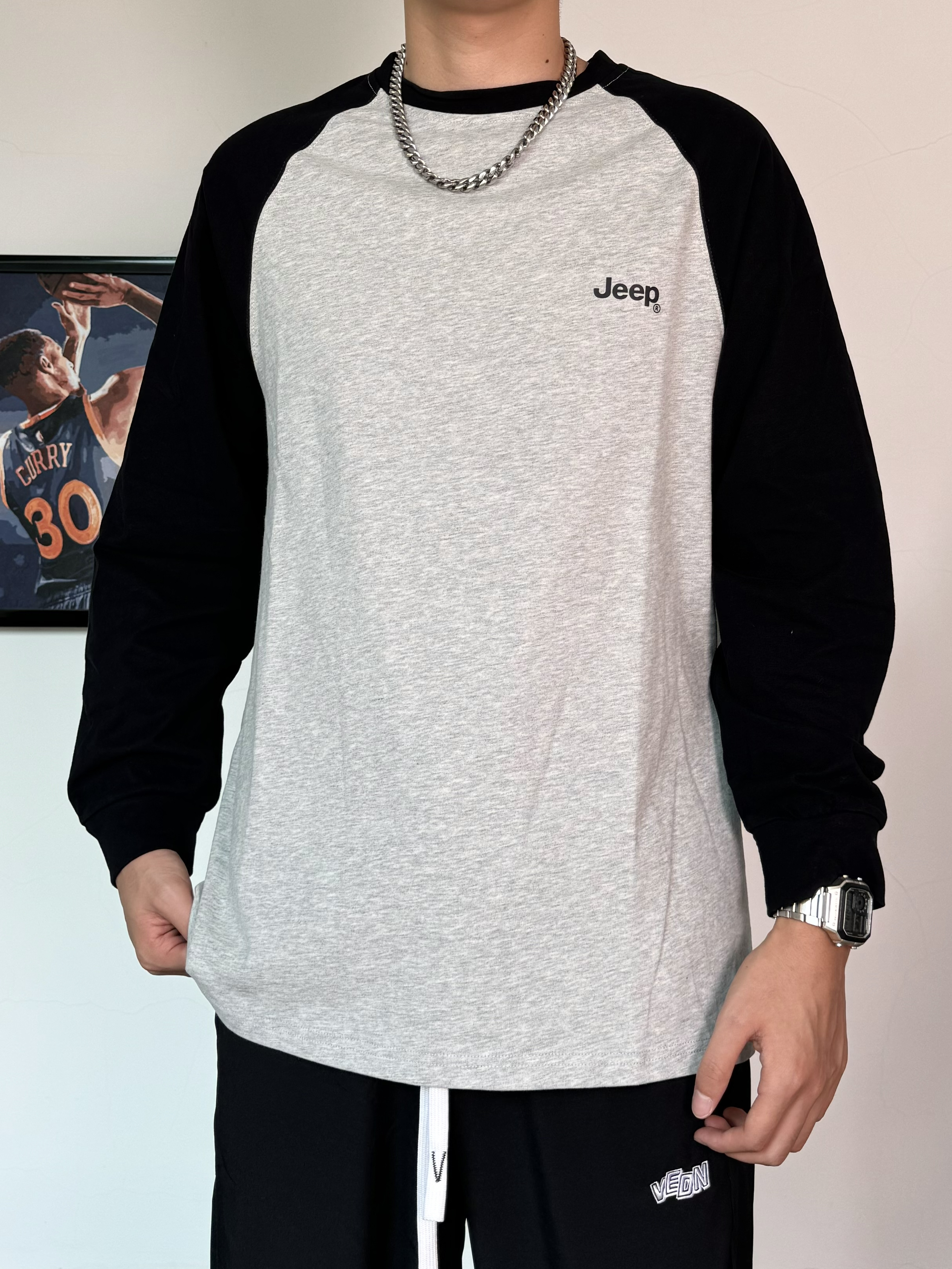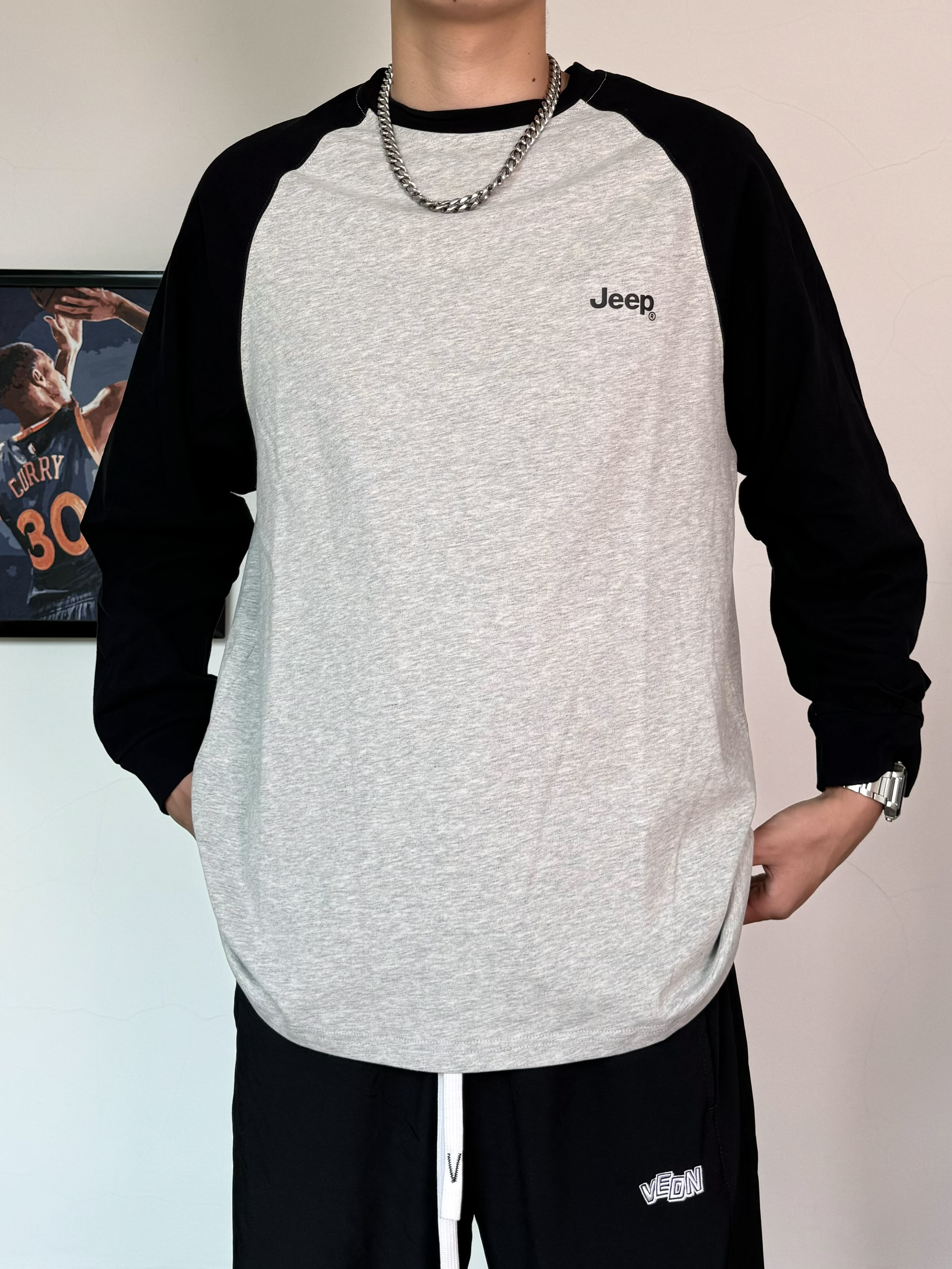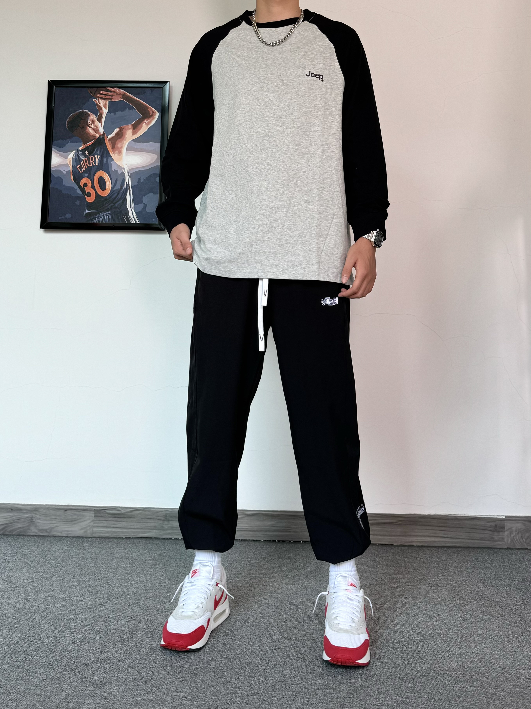 插件T恤上身真的帅 黑灰拼接配色主打一个百搭 面料真心不错 很贴肤 搭配黑色束脚裤➕白红配色运动鞋 一身更有运动感咯