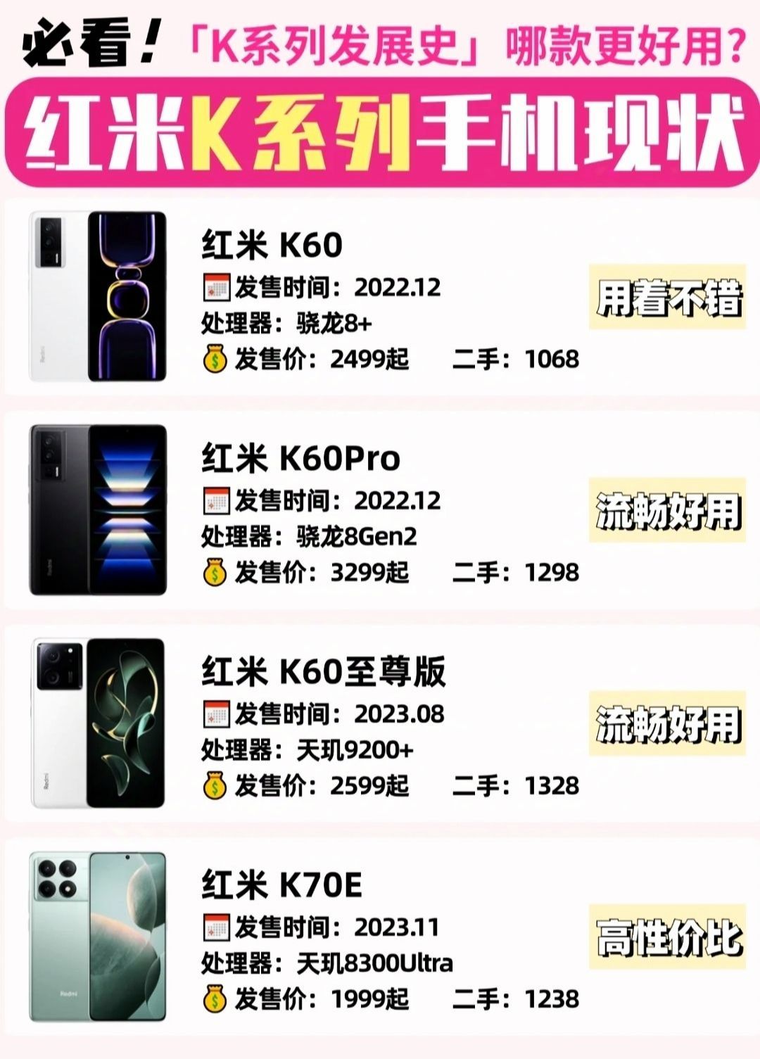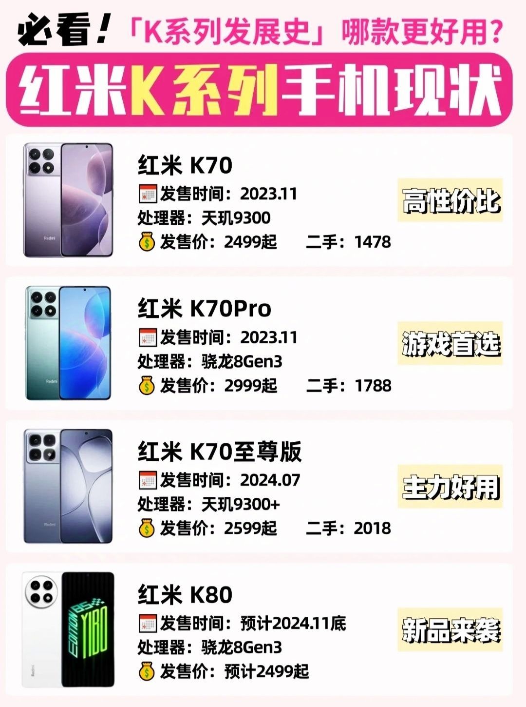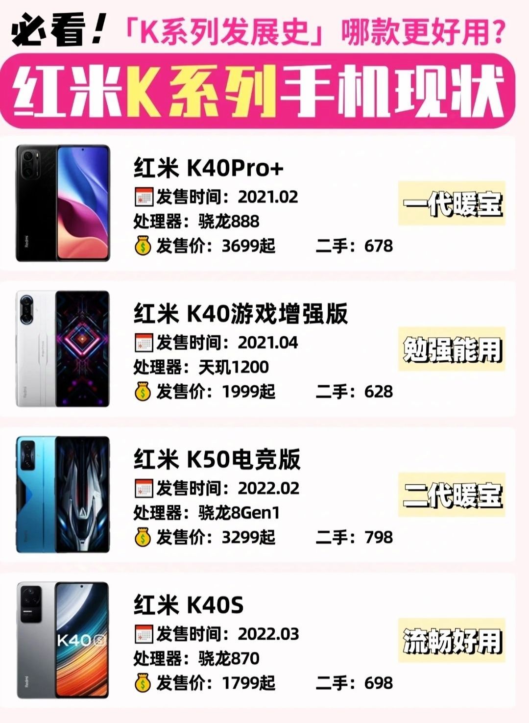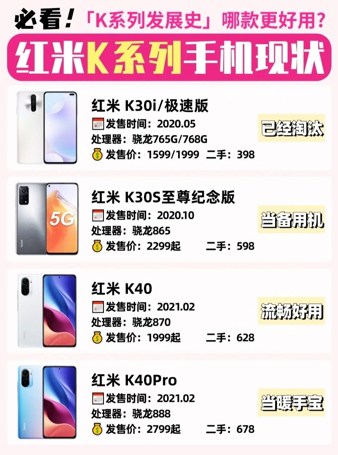 红米K系列手机现状,有你用过的吗❓ 红米K系列手机是红米的旗舰机型📱,主打的就是年轻人的性价比手机,✅适合追求性能但对拍照要求不高的姐妹,或者预算不多的学生党,一部顶配手机可以流畅使用四五年 👉🏻给兄弟们整理了红米K系列各代手机,里面有你用过的嘛❓ 📱红米K20 骁龙730,可以说是电子古董了 📱红米K20Pro 骁龙855,现在应该还能开机,但基本已经淘汰了 📱红米K30 骁龙730,基本也...