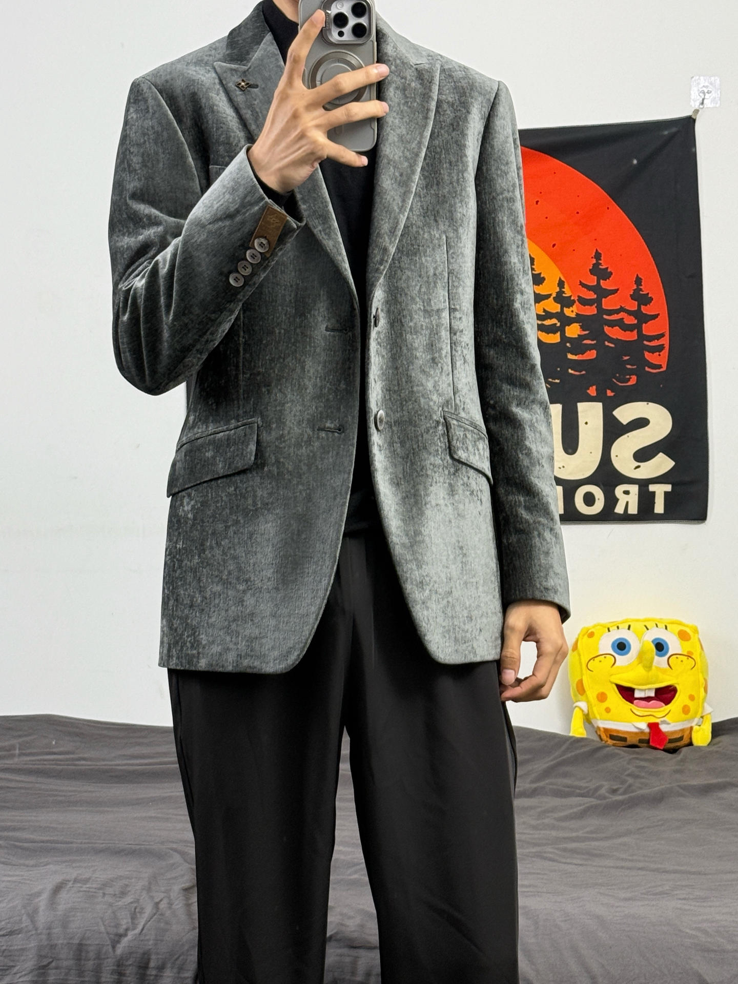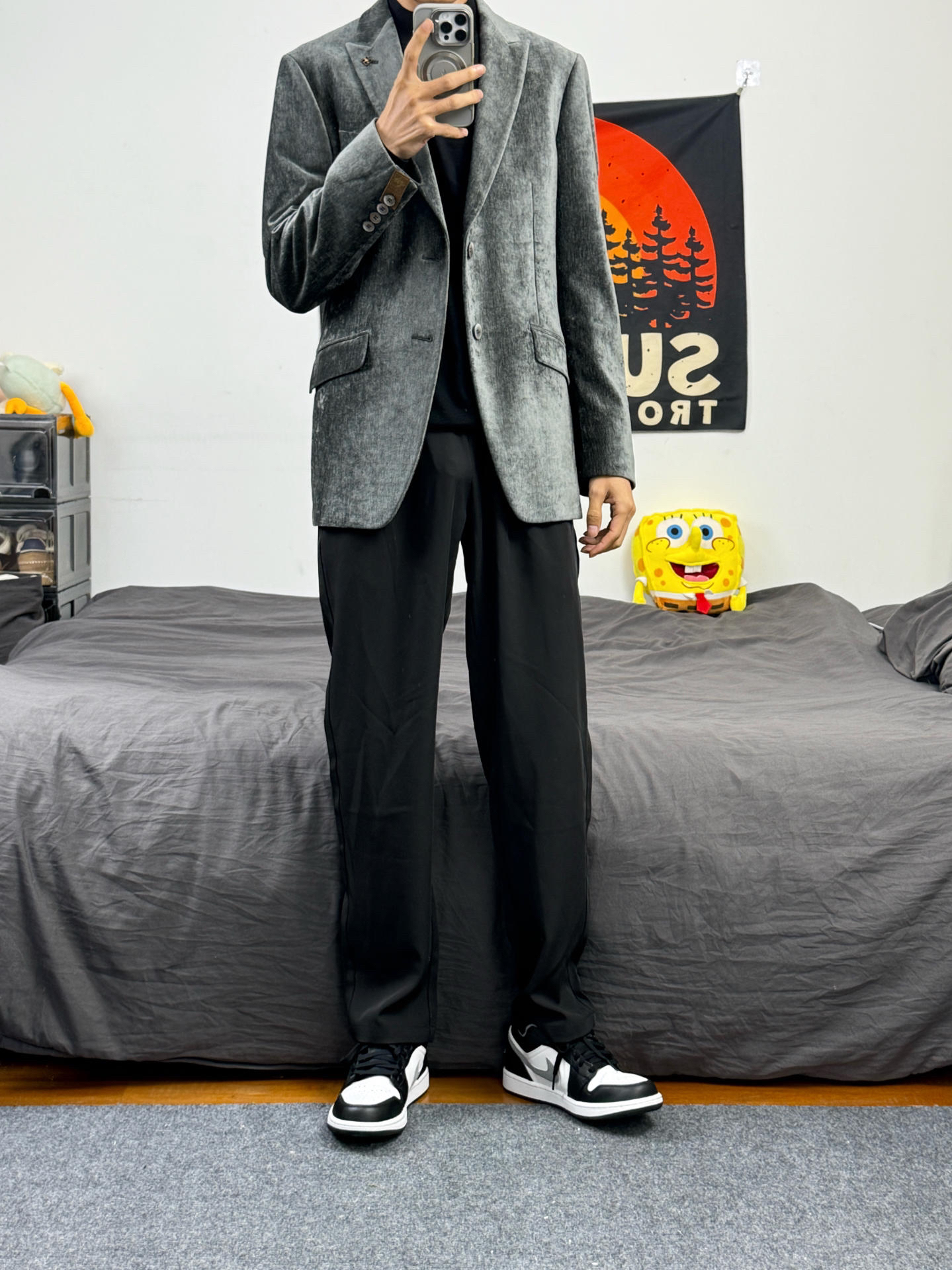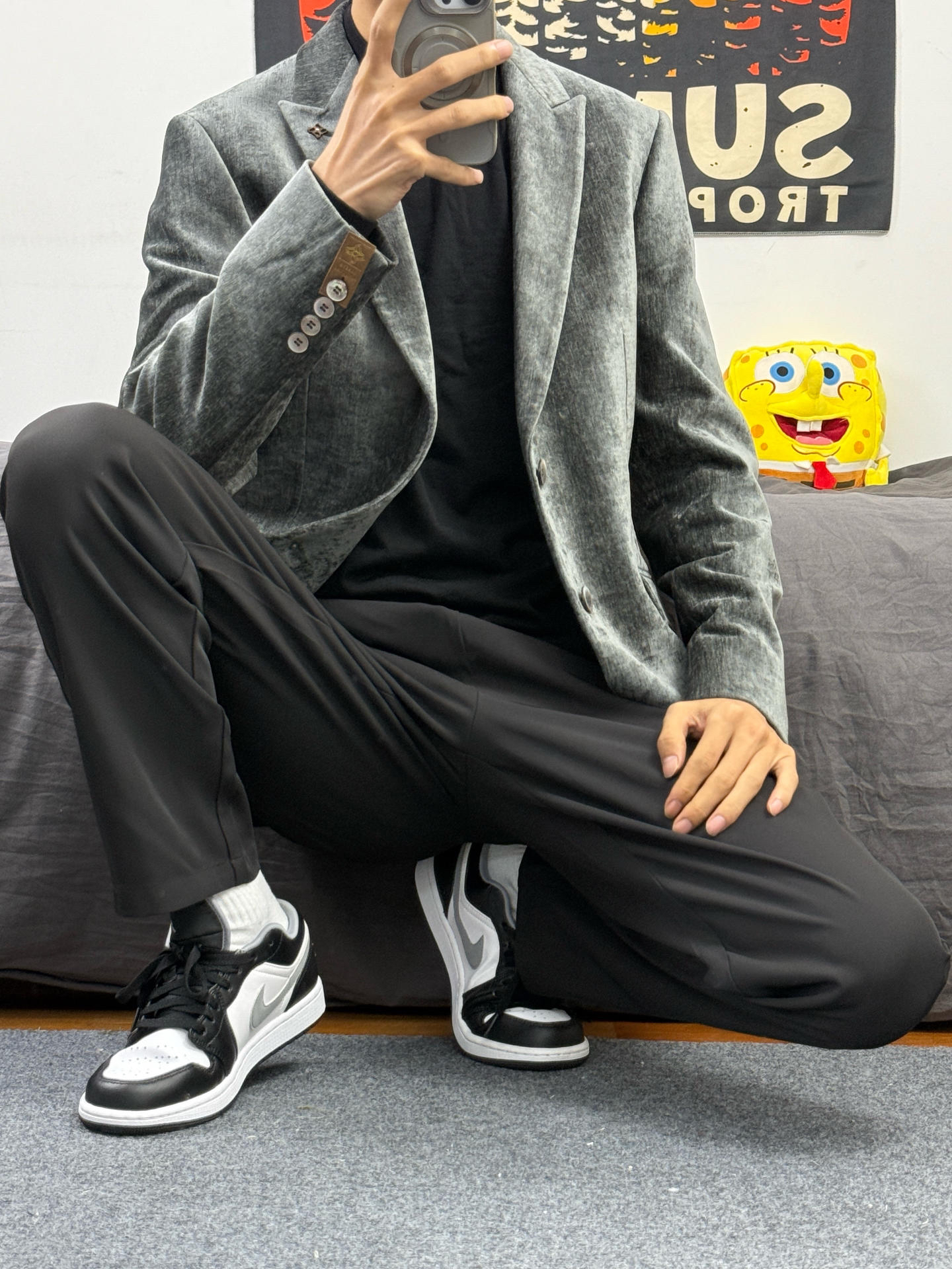 身高174体重48kg 今日上身 商务西装+黑色休闲裤+aj1影子灰 👔是 #DIDIBOY 迪迪博迩 家的商务西装 款式偏复古 搭配比较少见的灰绿色 上身吸睛也不失稳重 小骨架穿着也非常立挺 上身尺码48 内搭一件羊毛衫刚刚好 👖搭配的休闲西裤 垂坠的版型,对骨架小比较友好 能很好修饰体型 👟是aj1影子灰 百搭鞋子 怎么穿都不易出错 #雪季穿搭 #冬季实穿主义 #时髦与温度并存 ...