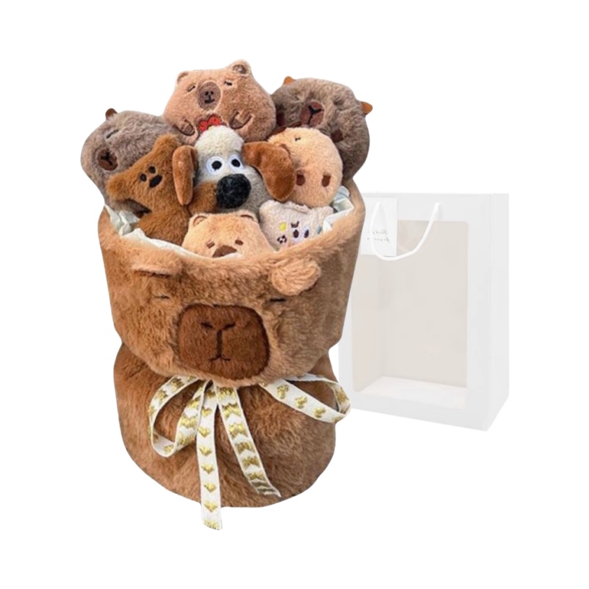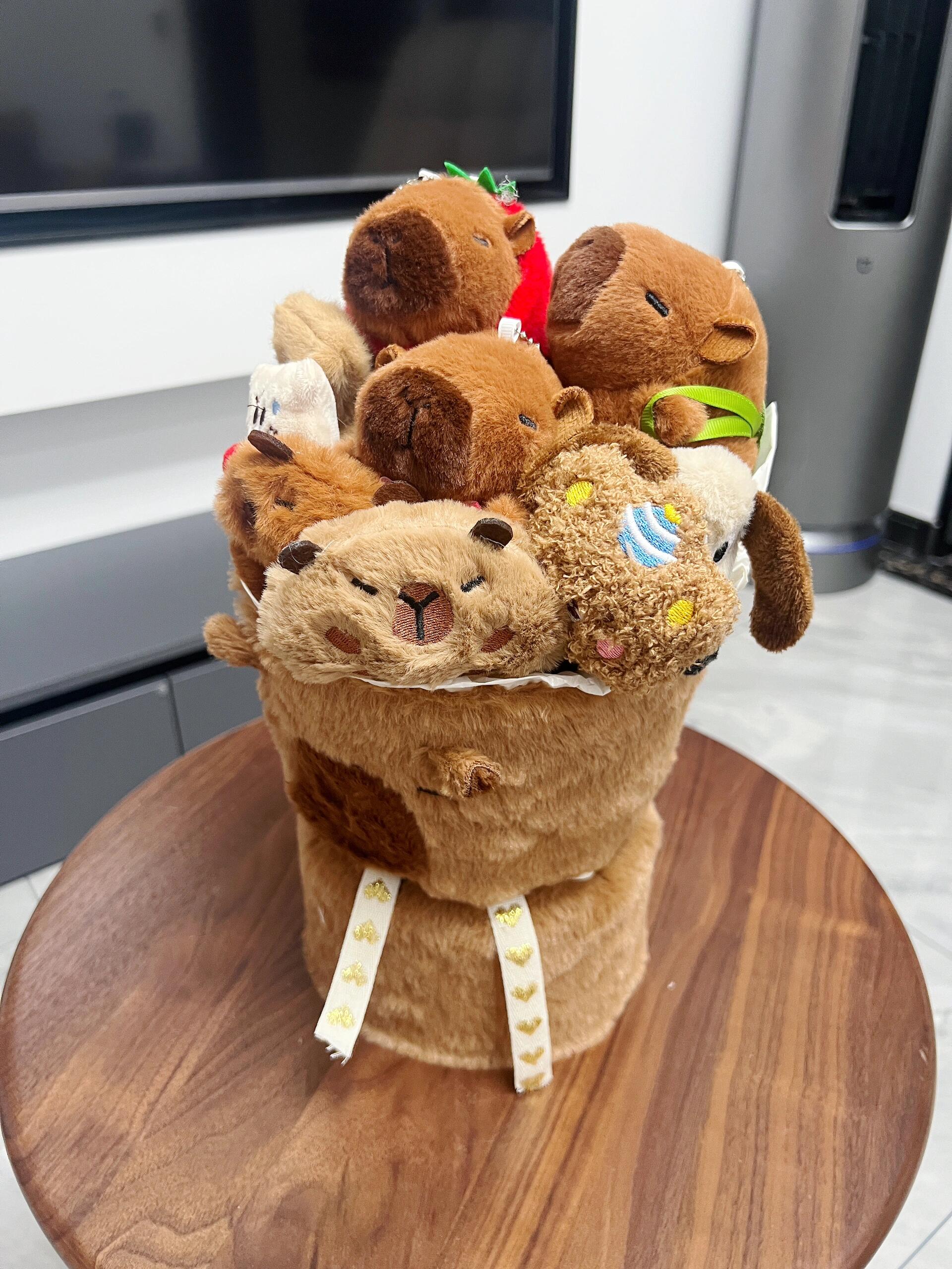 👑买一束可爱的玩偶花束放在办公桌上吧,最近小火的卡皮巴拉~累的时候捏捏上面的卡皮巴拉,听它叽叽叫的声音,好像工作的疲惫也能减轻一些呢 (图源网络侵删)