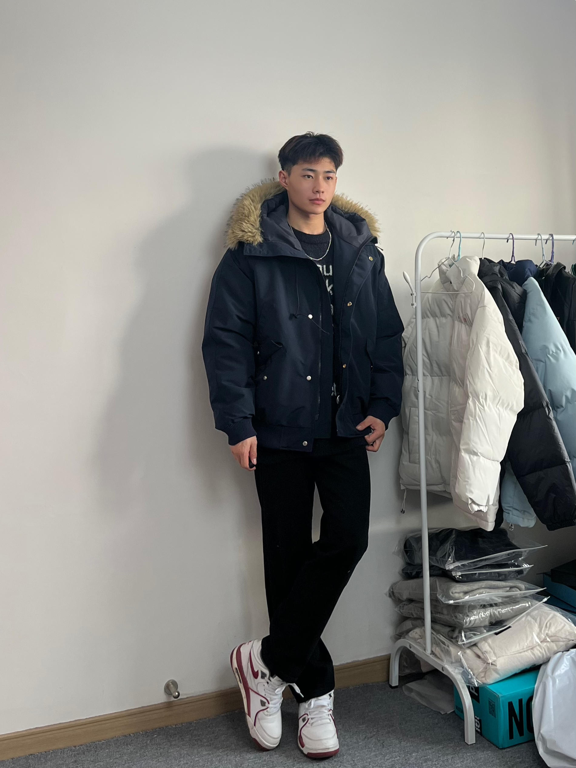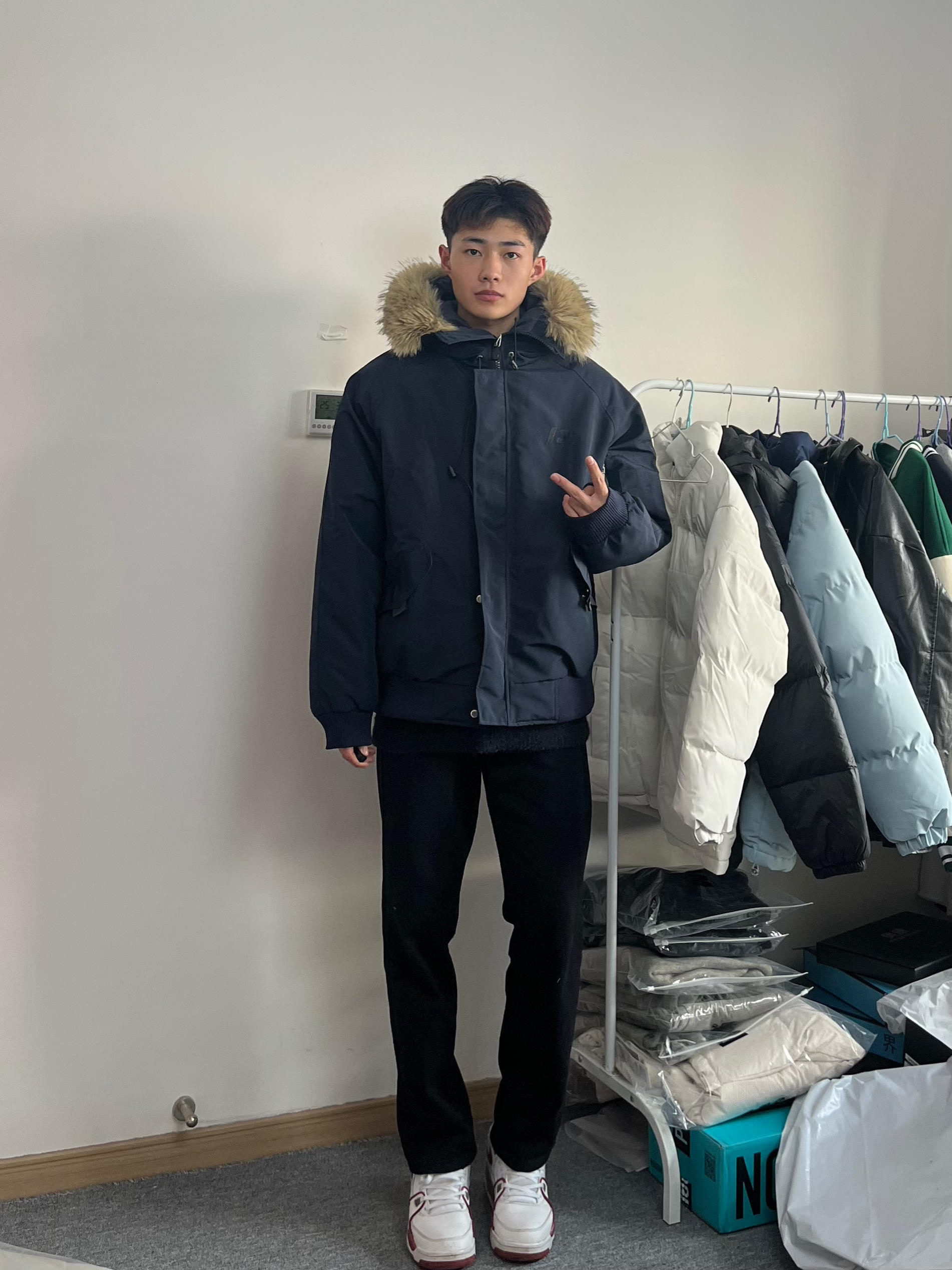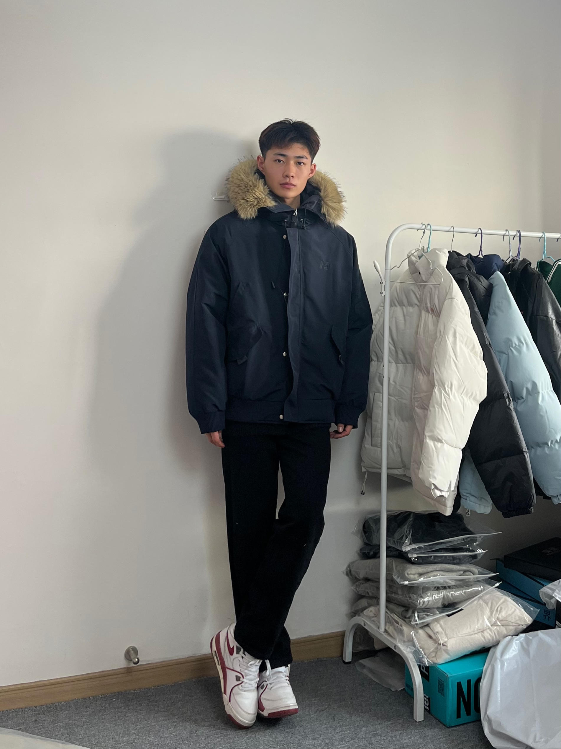 这毛绒绒的帽领真的不错,毛领很软糯很舒服,复古工装的款式,胸前有品牌标识,藏青的颜色很显白内里棉料填充的很饱满,嘎嘎暖和,版型宽松很显高,是真的很帅