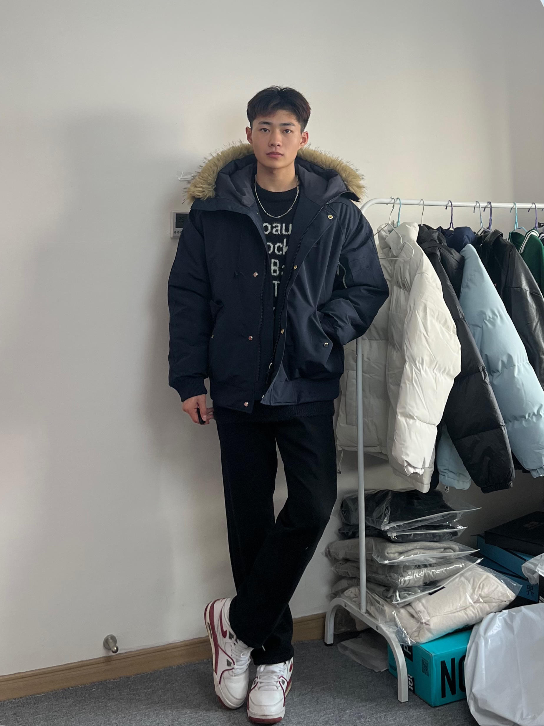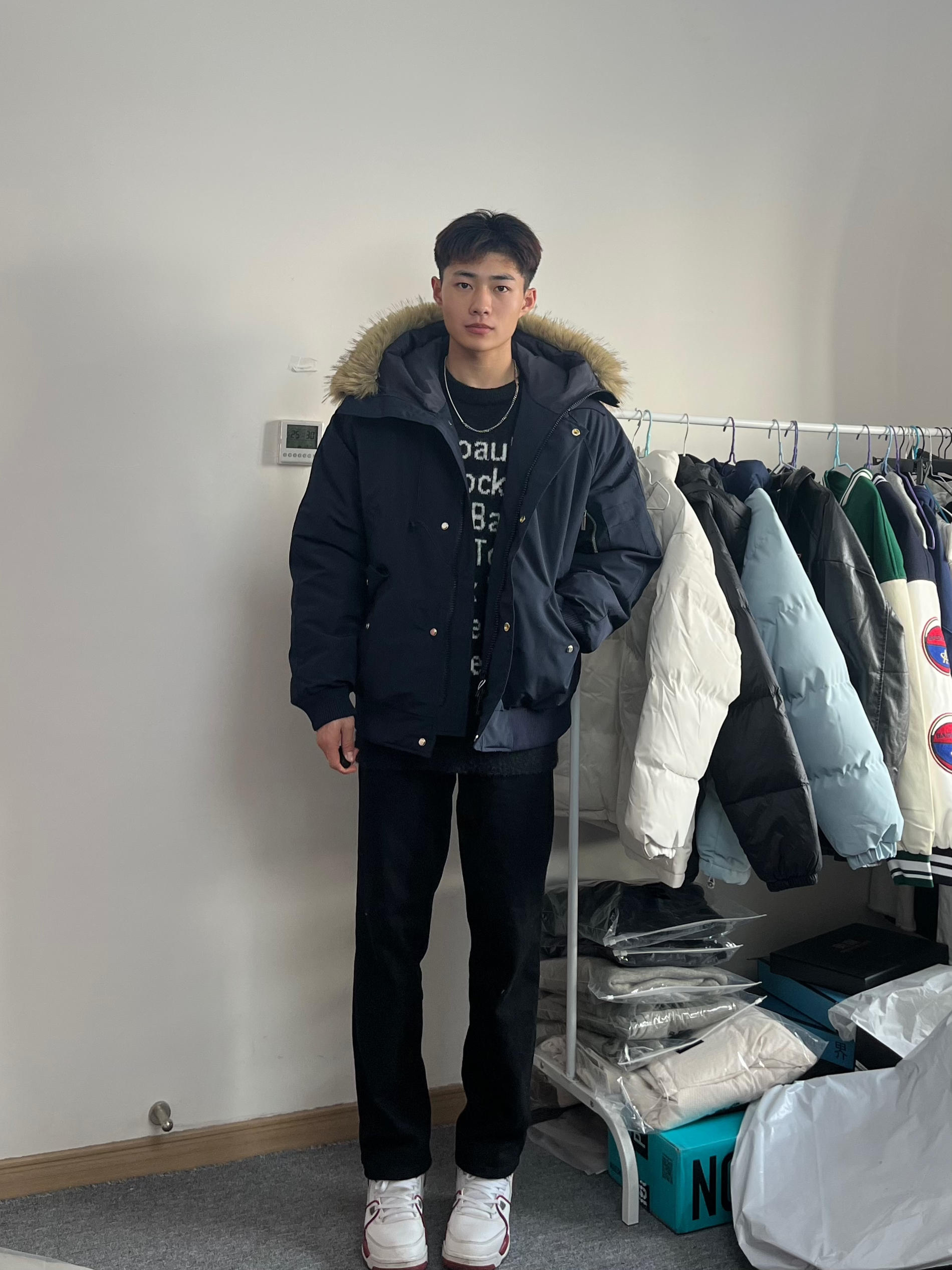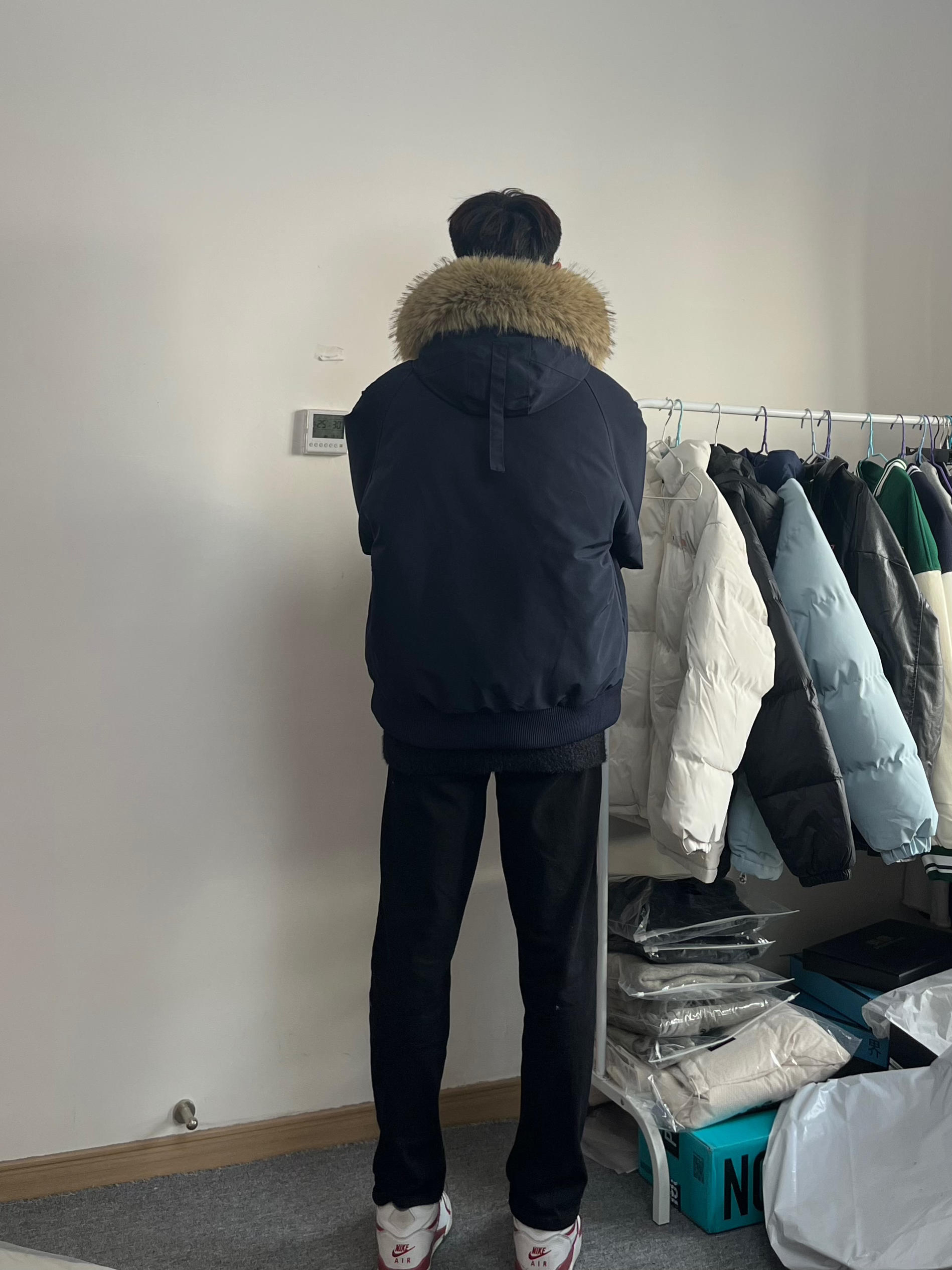 这毛绒绒的帽领真的不错,毛领很软糯很舒服,复古工装的款式,胸前有品牌标识,藏青的颜色很显白内里棉料填充的很饱满,嘎嘎暖和,版型宽松很显高,是真的很帅