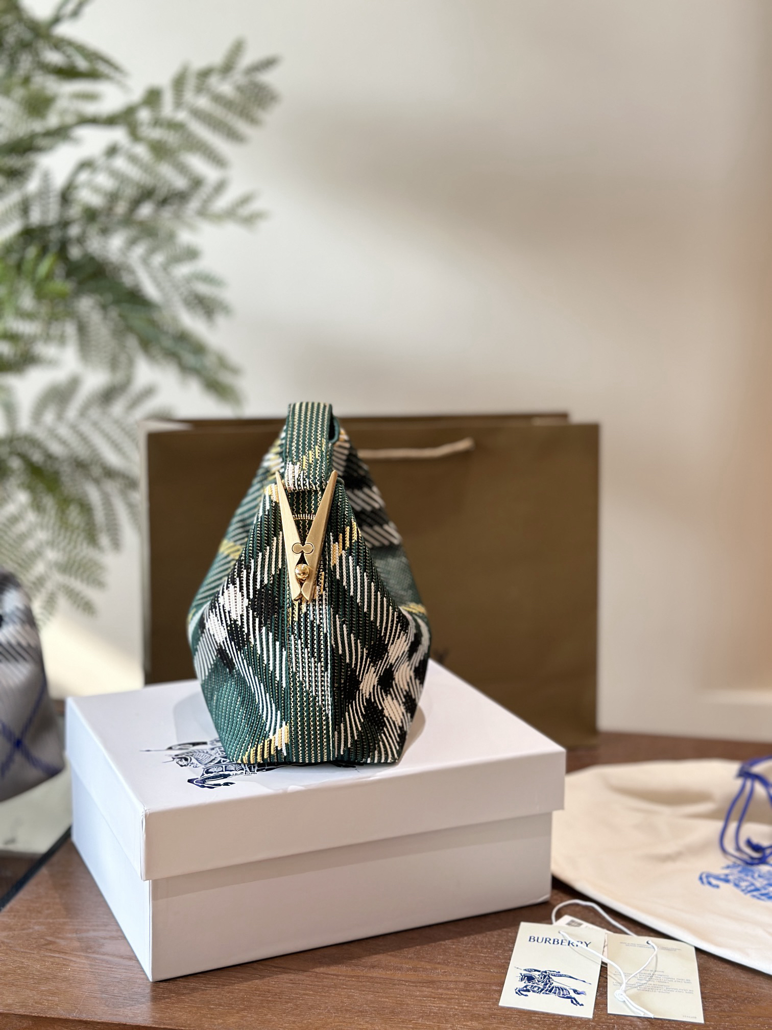 Burberry最新包款,peg 系列手提包+国柔软立挺包款,于意大利针织打造, 装饰Burberry格纹。质地轻盈,采用无内衬设计;衣夹造型挂扣镌刻Burberry徽标,可轻松固定弧形顶部提柄。