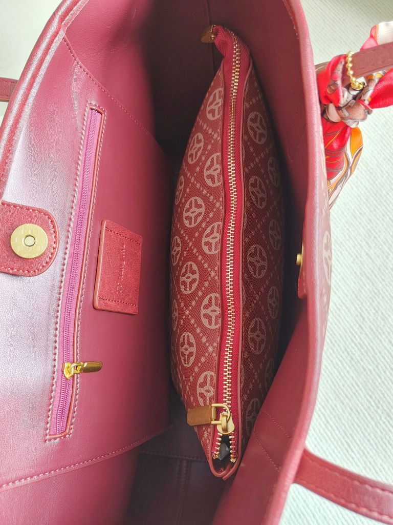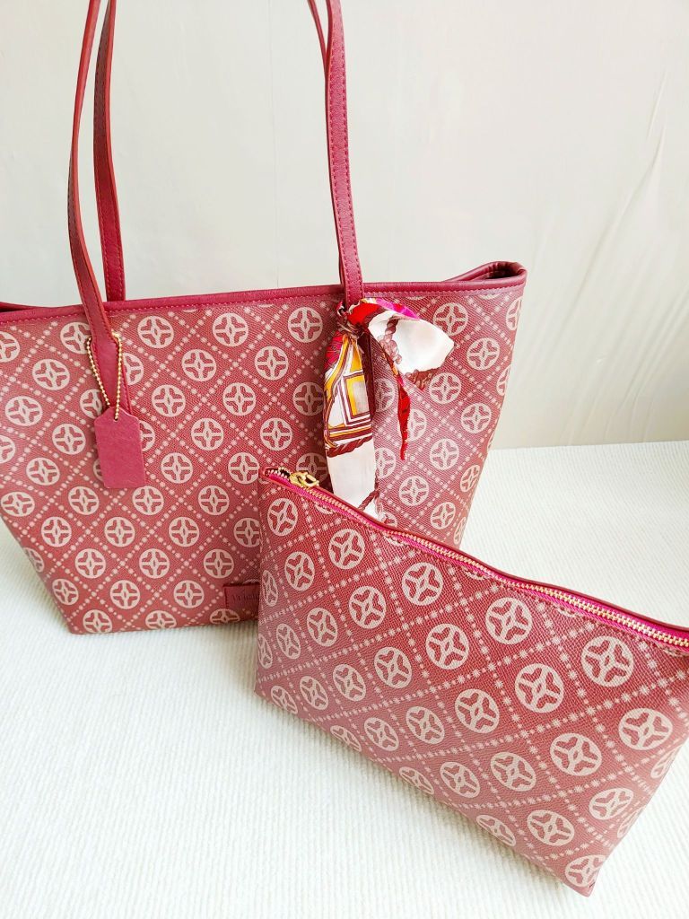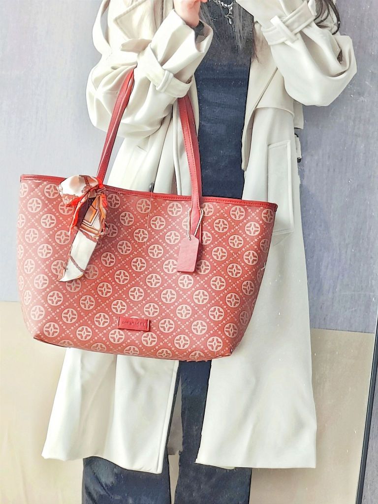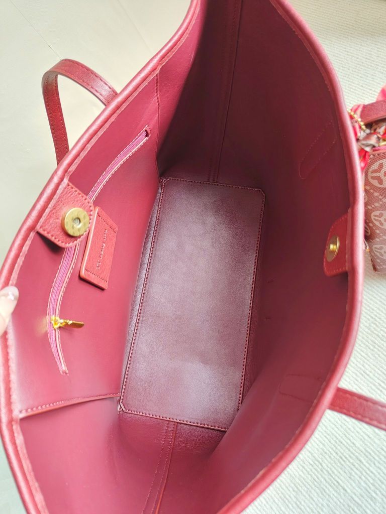 上班通勤只需要一个托特包 容量可以塞下笔记本电脑 里面还有一个小的包 可以放一些化妆品 跟别的物品分割开来 就很方便 红色系列也很亮眼 搭配大衣真的很精致哎 比较亮眼 色彩对比明显 也可以送给麻麻 感觉红色比较喜庆 或者当做婚包 都很合适滴!