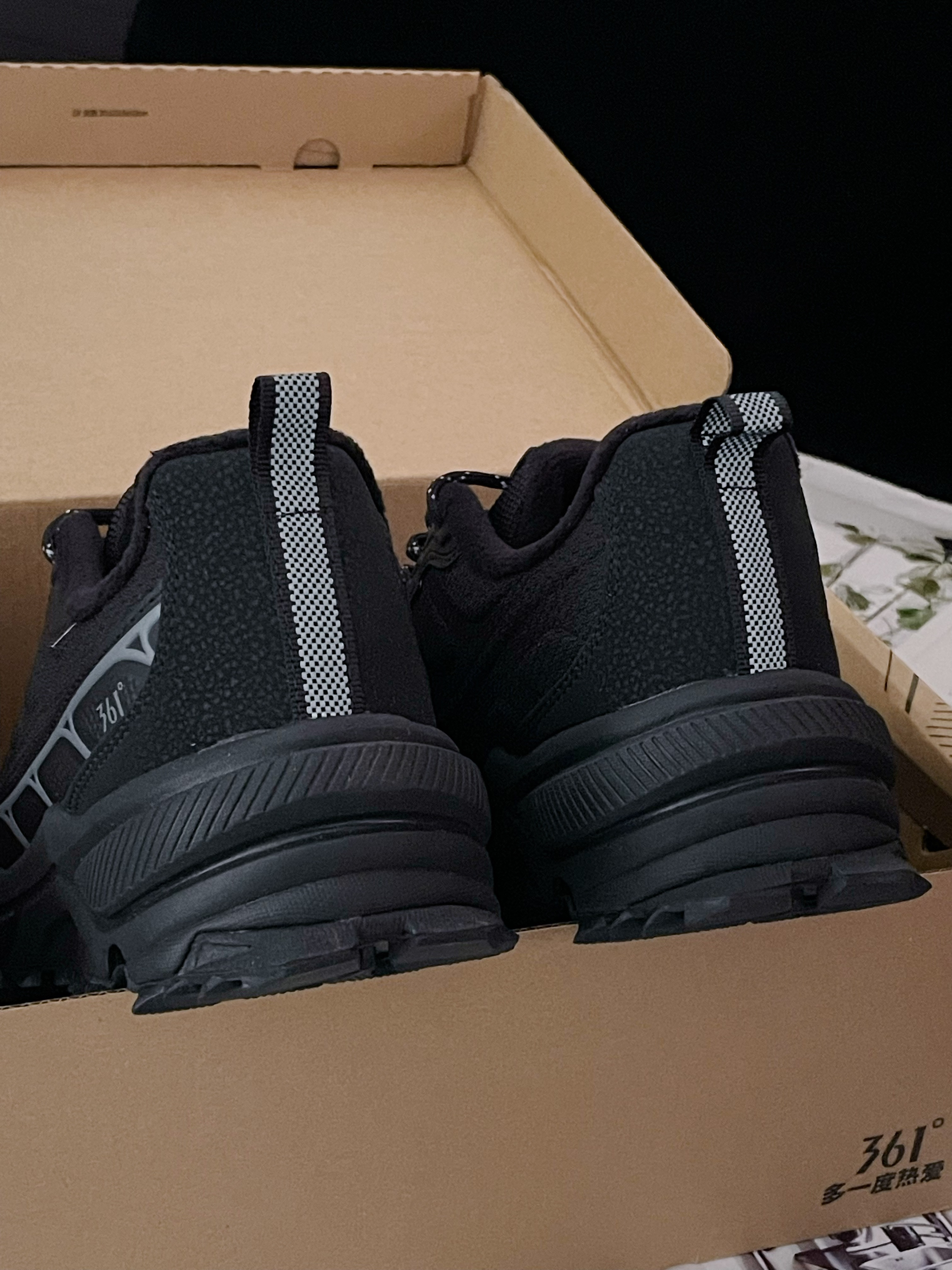 今天给大家分享这双 361° 『黑色』加绒跑步鞋 鞋款由酷酷的黑色为主色调 整体的配色鞋型时尚简约百搭~ 网布+皮革的拼接鞋面 兼顾了良好的透气性和包裹性 特别是加绒的内里毛绒绒的很保暖 冬季穿着再也不用担心冻脚啦~ 泡棉中底脚感软弹 舒适轻便 独特的止滑纹路抓地力出色耐磨防滑⬆️ ⚠️尺码方面不偏码 建议正码选择