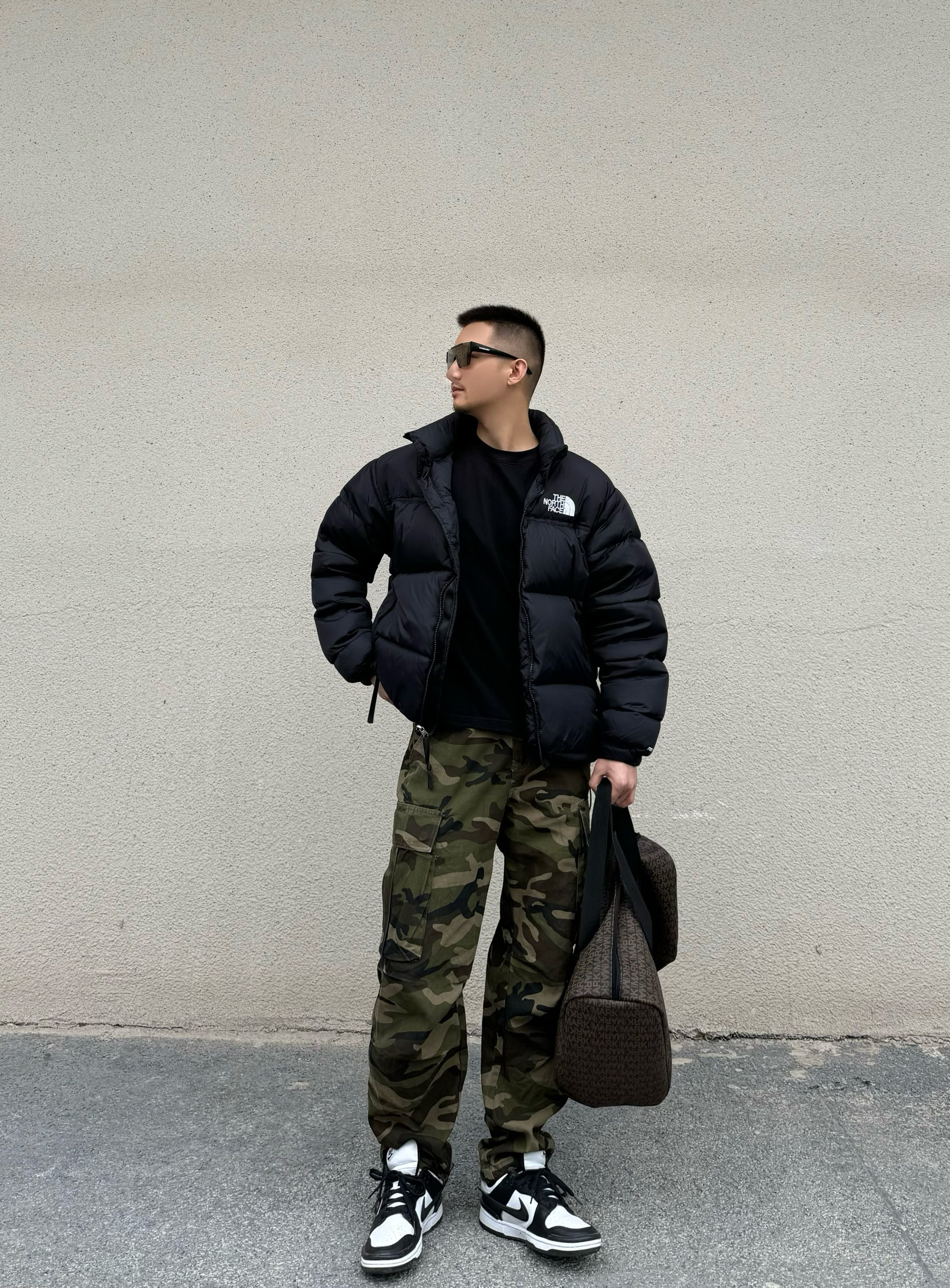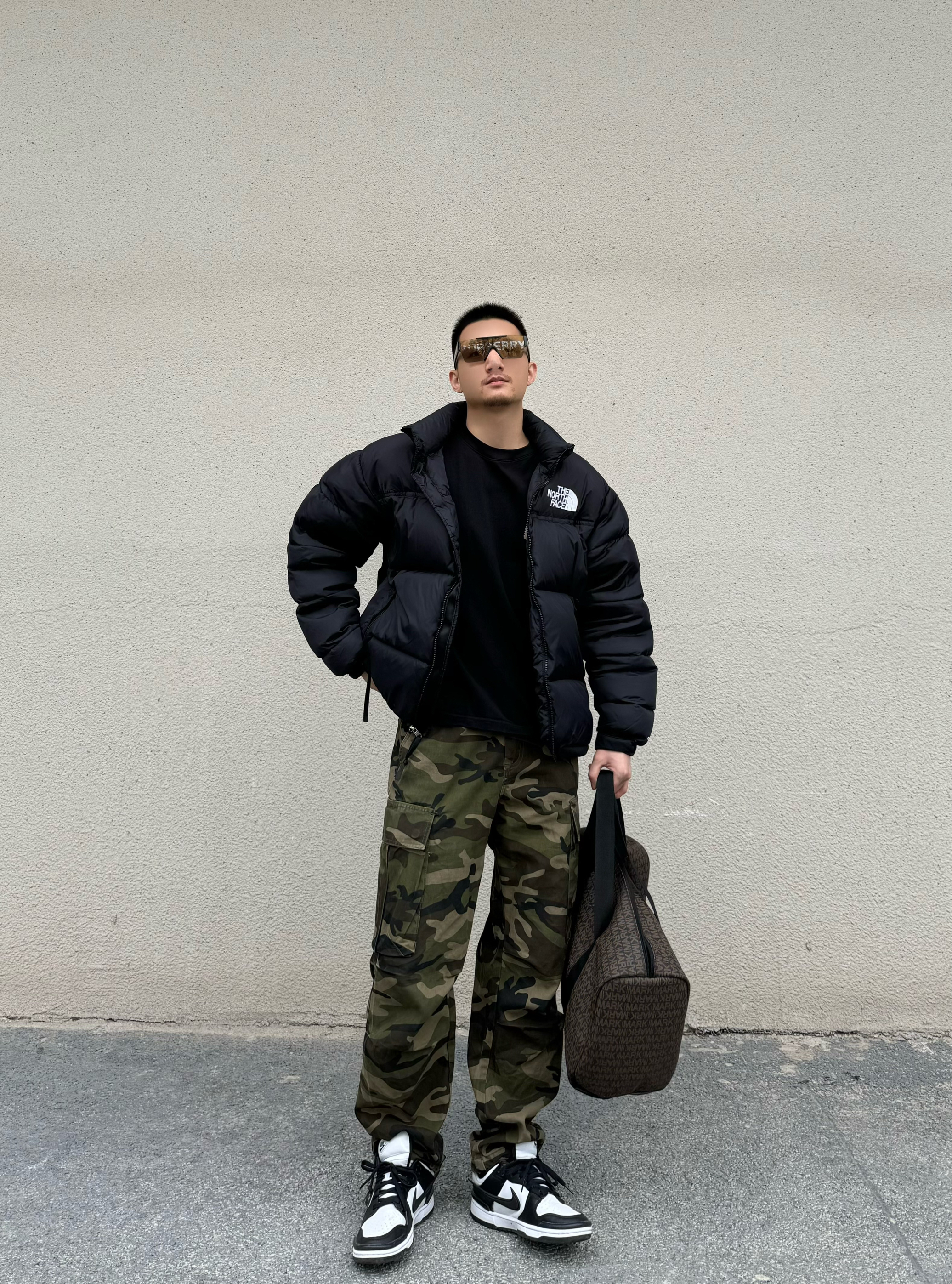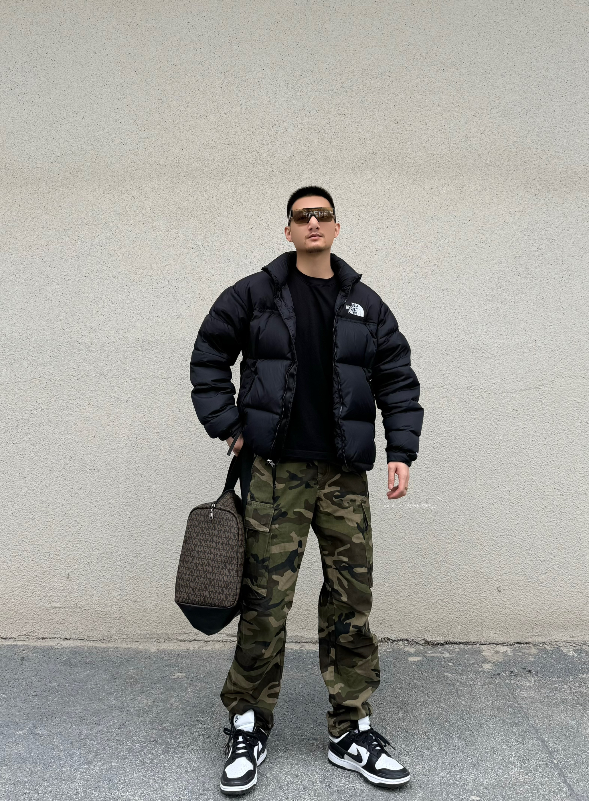 上身面包羽绒服 短宽设计 时尚百搭 下身迷彩直筒裤 直筒宽松版型 帅气十足~再搭配一双Nike熊猫配色的板鞋 脚感柔软舒适 鞋底耐磨防滑 黑白的经典配色也是很百搭的款哦 跟上身来个浅浅的呼应 搭配上手提健身包 帅气出门吧!