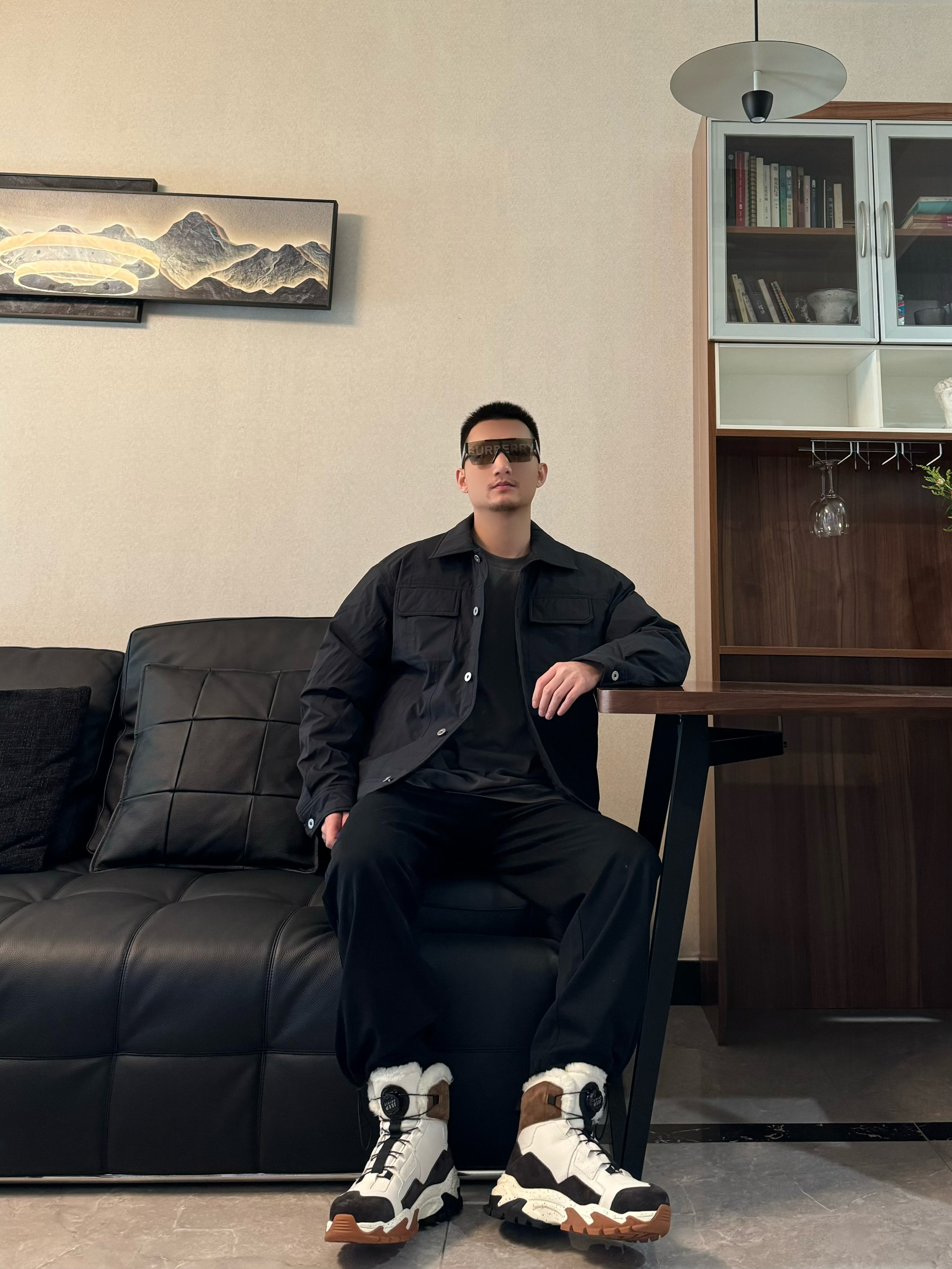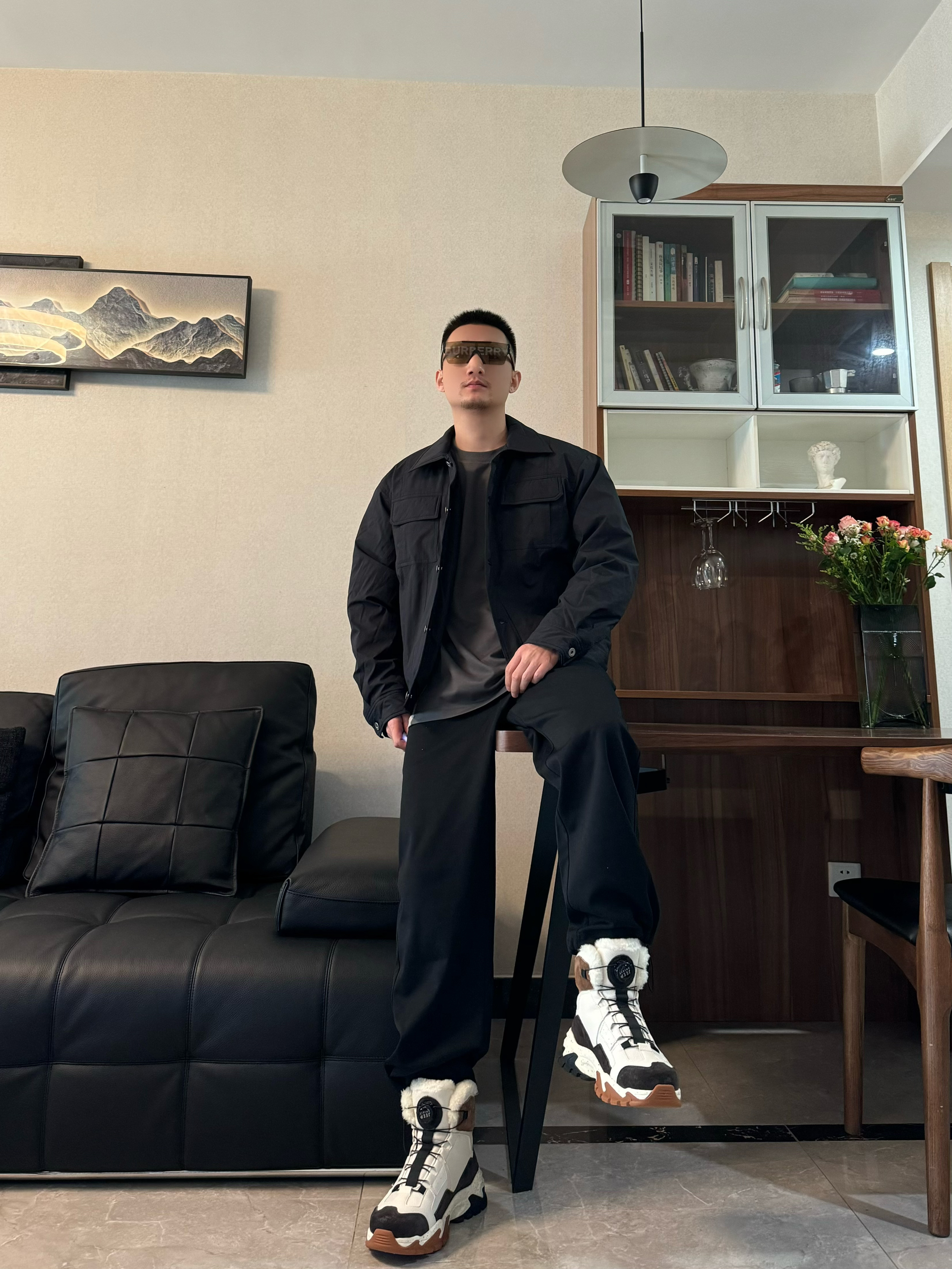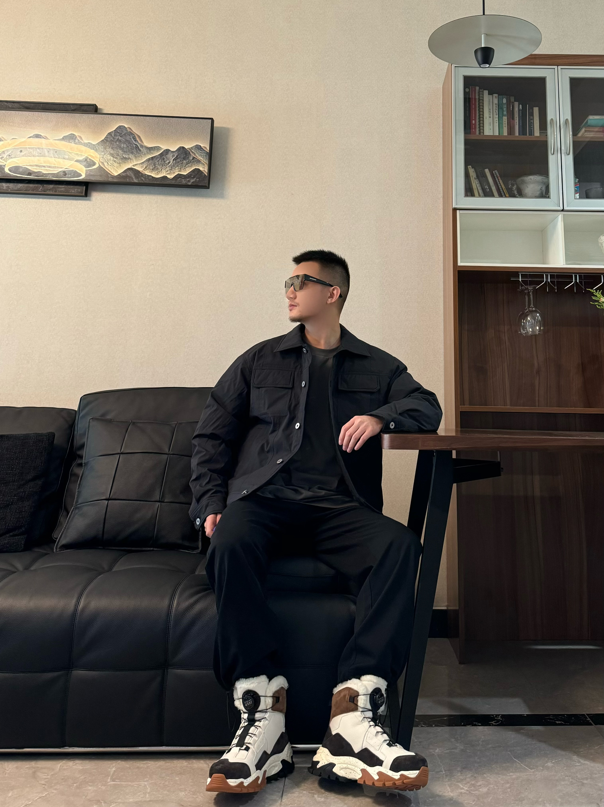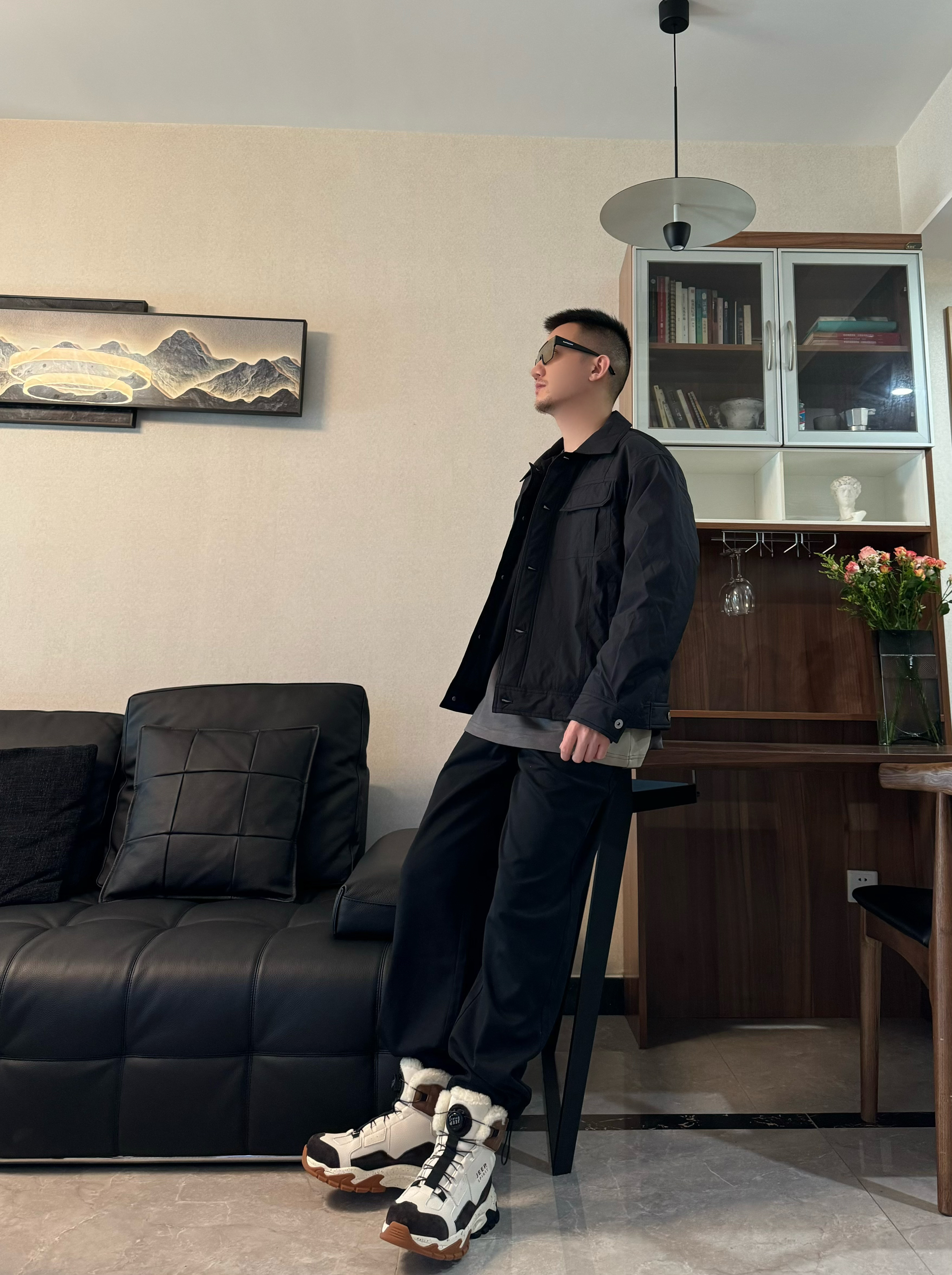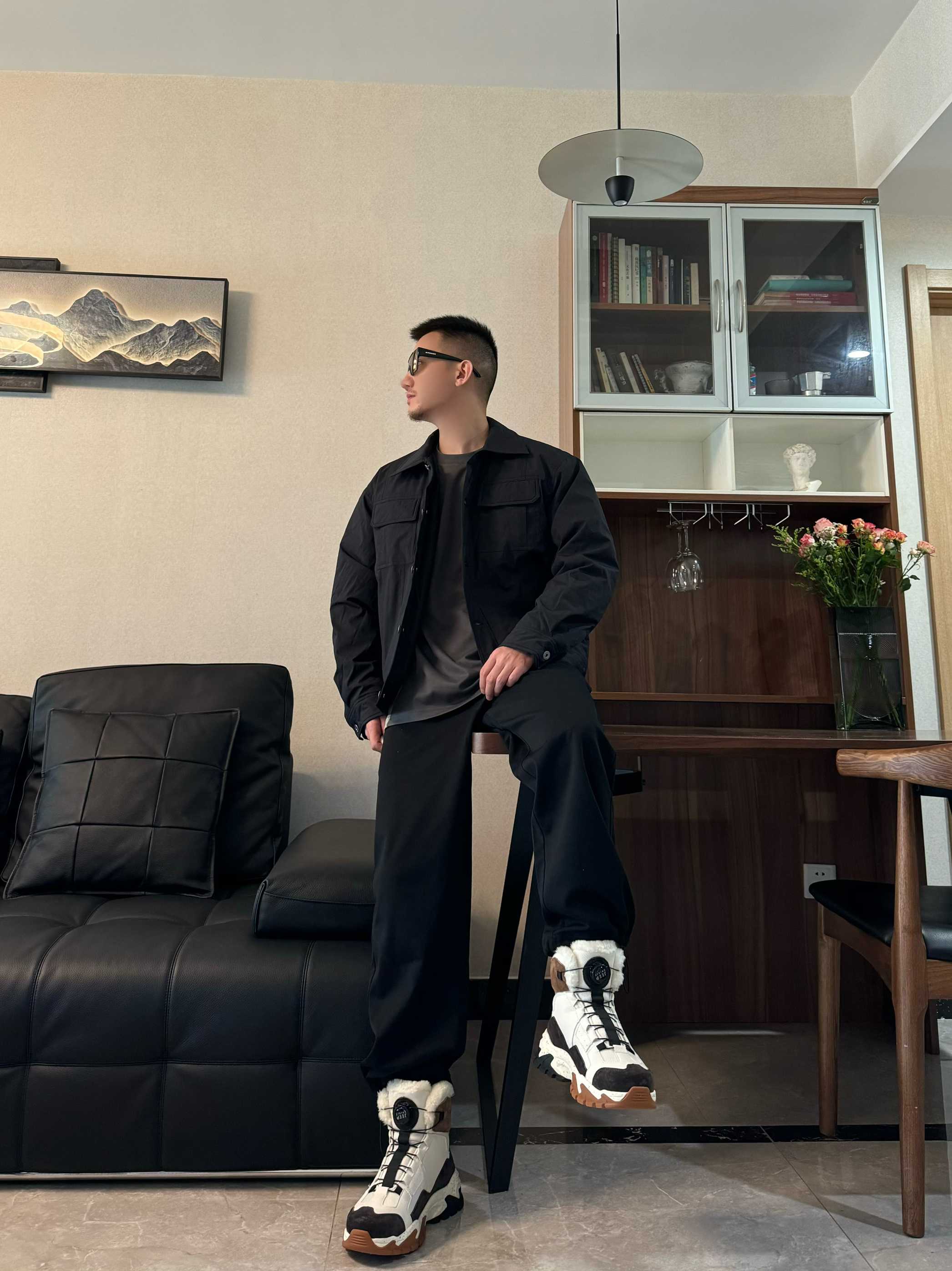 上身黑色翻领轻薄羽绒服 纯色工装风的设计 质感一下子就上来啦 版型是宽松的 我身高176CM 体重65KG 穿M码宽松 下身来一条黑色休闲裤 直筒宽松设计 帅气十足~ 再搭配一双雪地靴 脚感柔软轻便高通的设计 包裹感和保暖性都很在线 配色和今天的穿搭很适配哦 帅气出街吧!