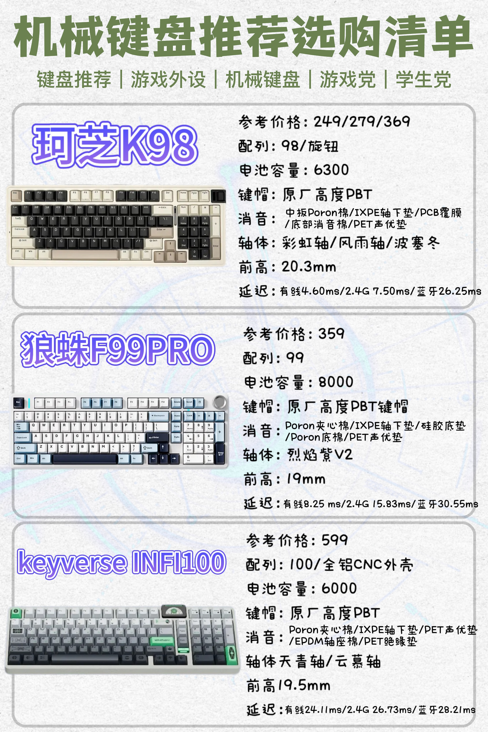 本篇笔记关联了KZZI/珂芝 K98 三模 机械键盘 98键 铝合金滚轮 热插拔 全键 铜结构 客制化 自带旋钮调节 胶坨坨 麻将音 沙漠绿洲、AULA/狼蛛 F99Pro 三模 机械键盘 100键 客制化 多功能旋钮 五层填充 防尘 超长续航 热插拔 浅光星辰 侧刻、EWEADN/前行者 X87 三模 磁轴键盘 87键 全键热插拔 客制化 无冲 机械手感 填充 消音 高线 黑莓粉色 侧刻等商品,为用户提供真实的使用体验和购买参考。
