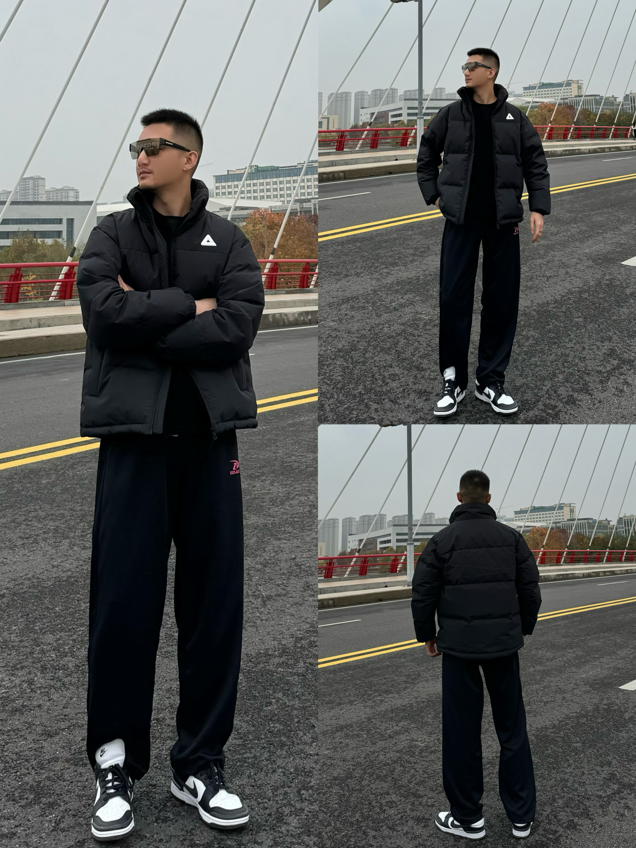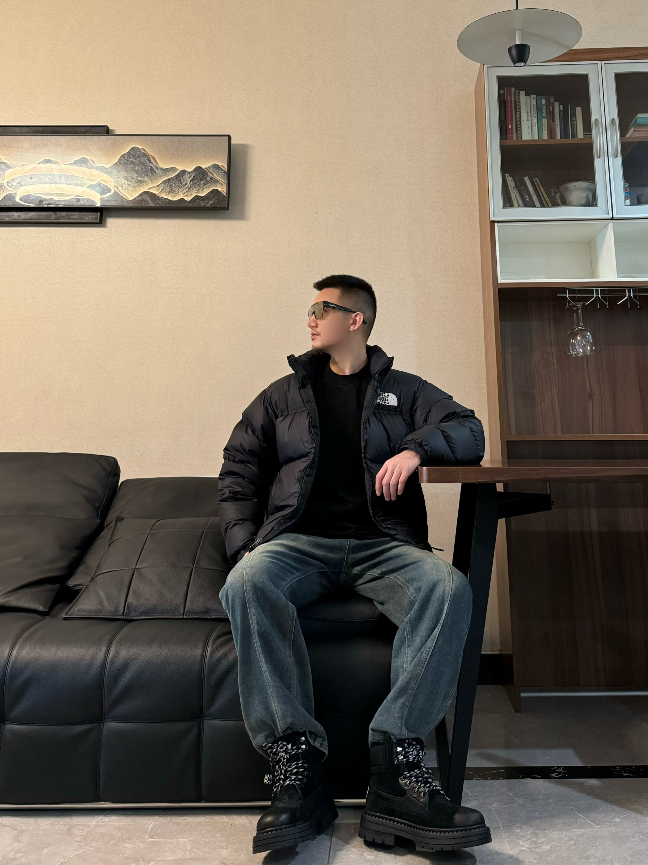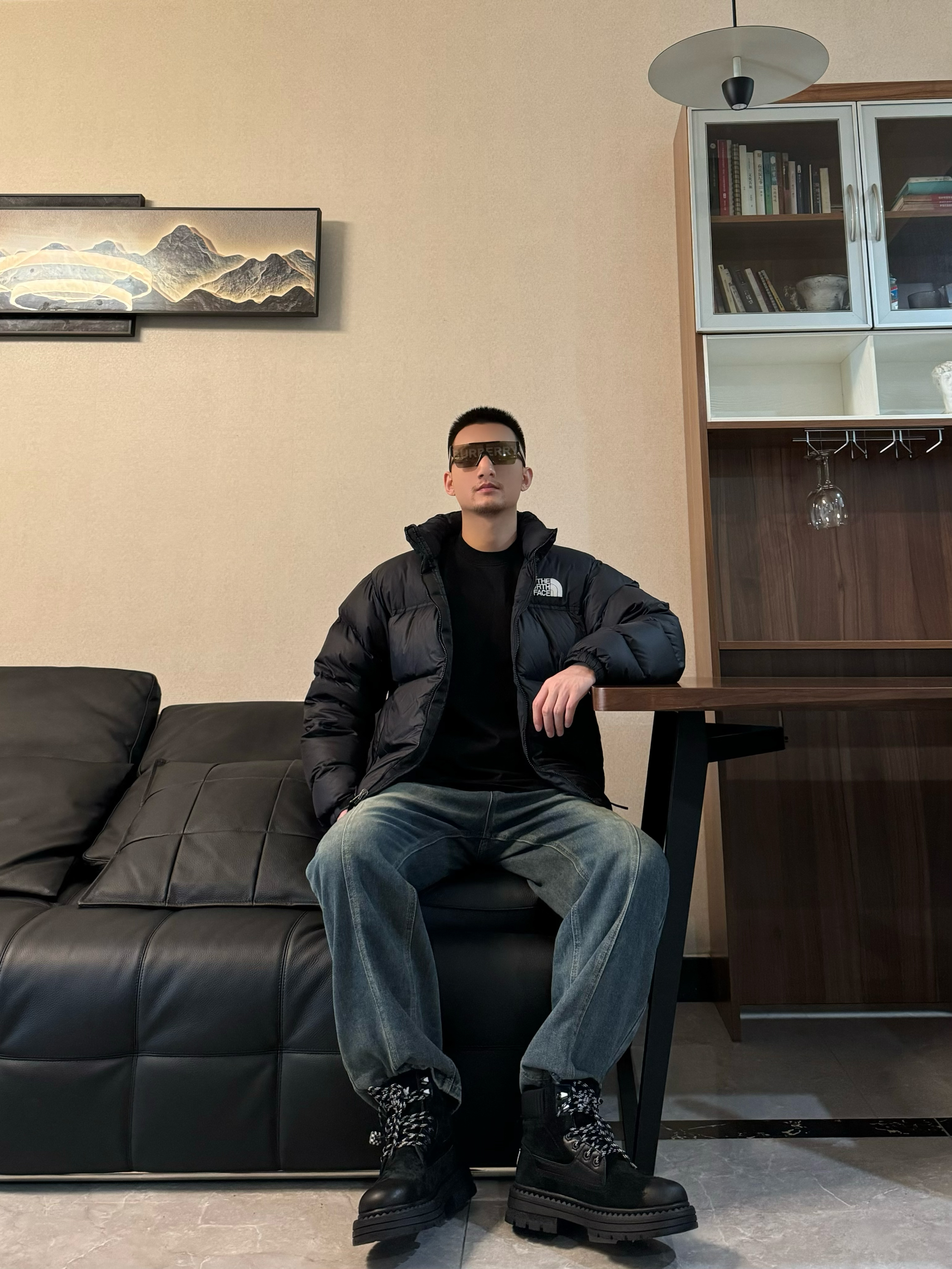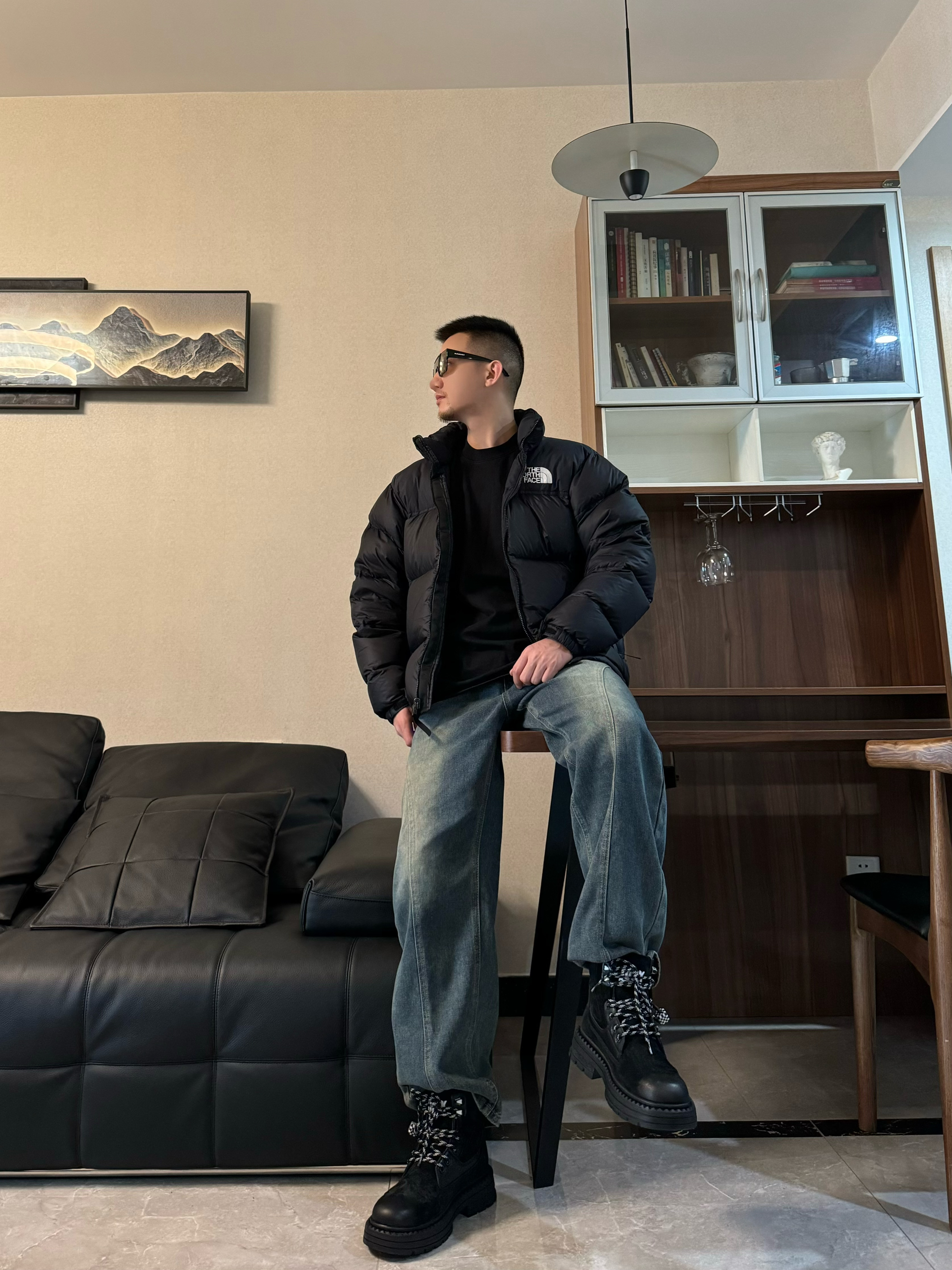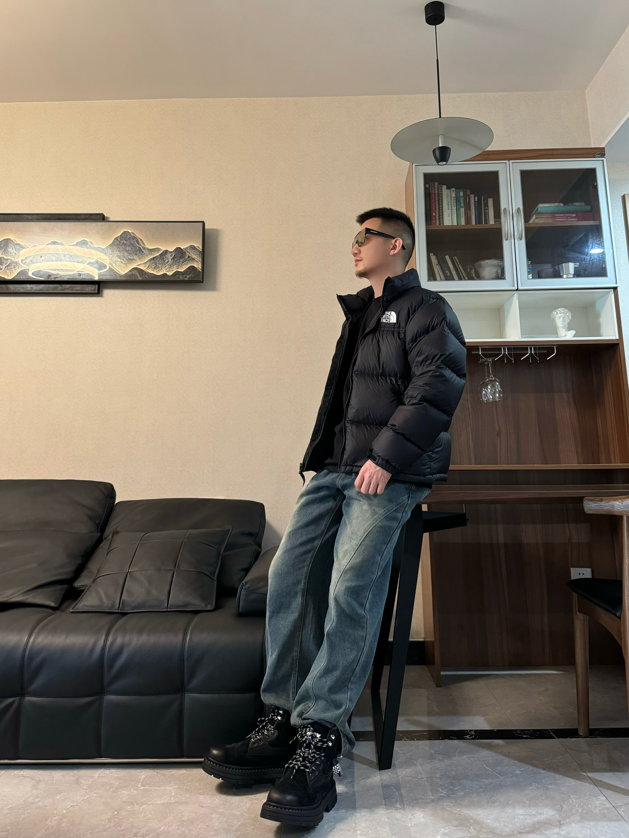 上身黑色立领面包羽绒服 简单纯色的设计 配上刺绣的logo 帅气十足~ 下身来一条复古牛仔裤 直筒宽松设计 时尚百搭再搭配一双转运户外靴 脚感柔软舒适 中 高帮设计 包裹感很在线 配色和上身浅浅来个呼应 帅气出门吧!