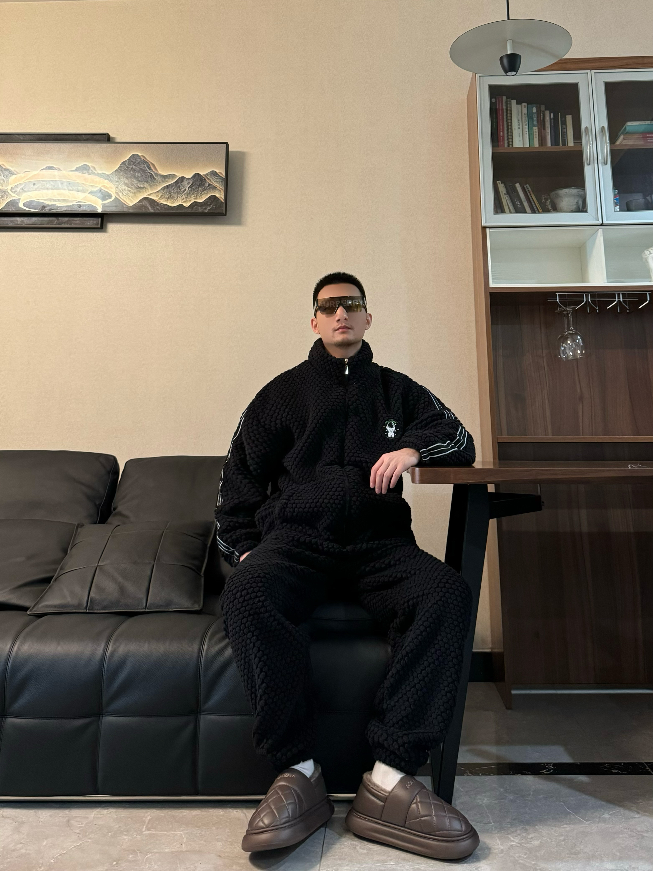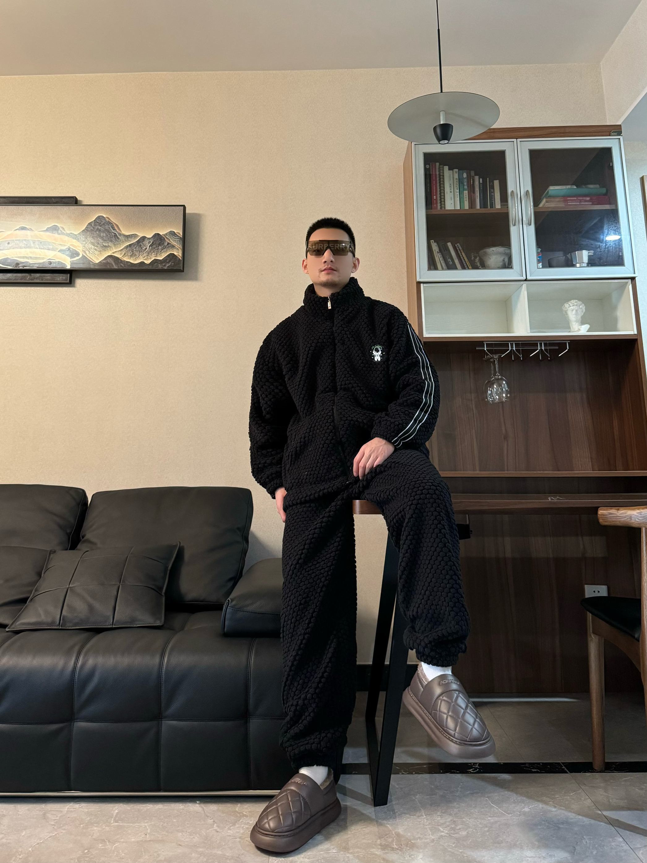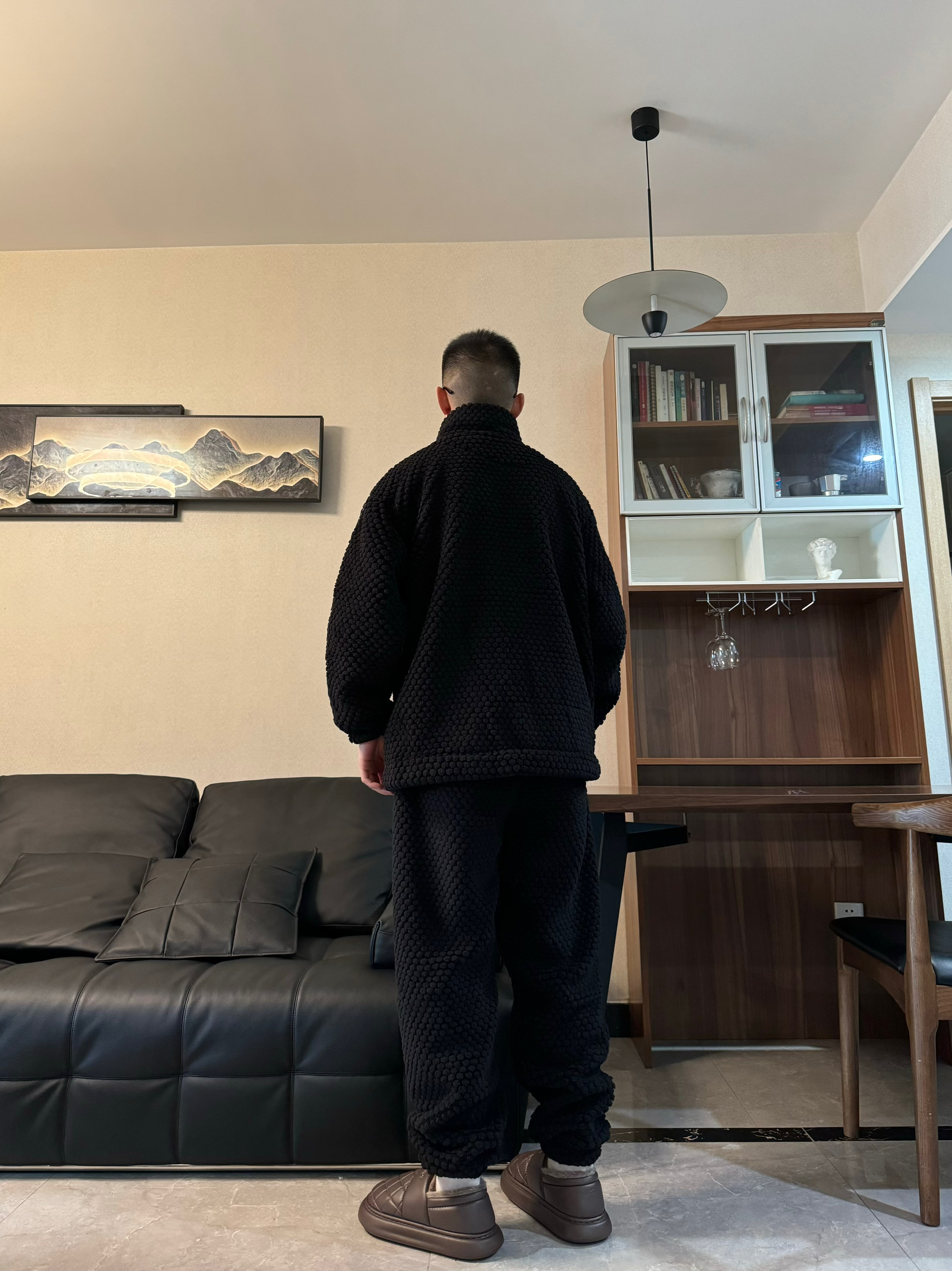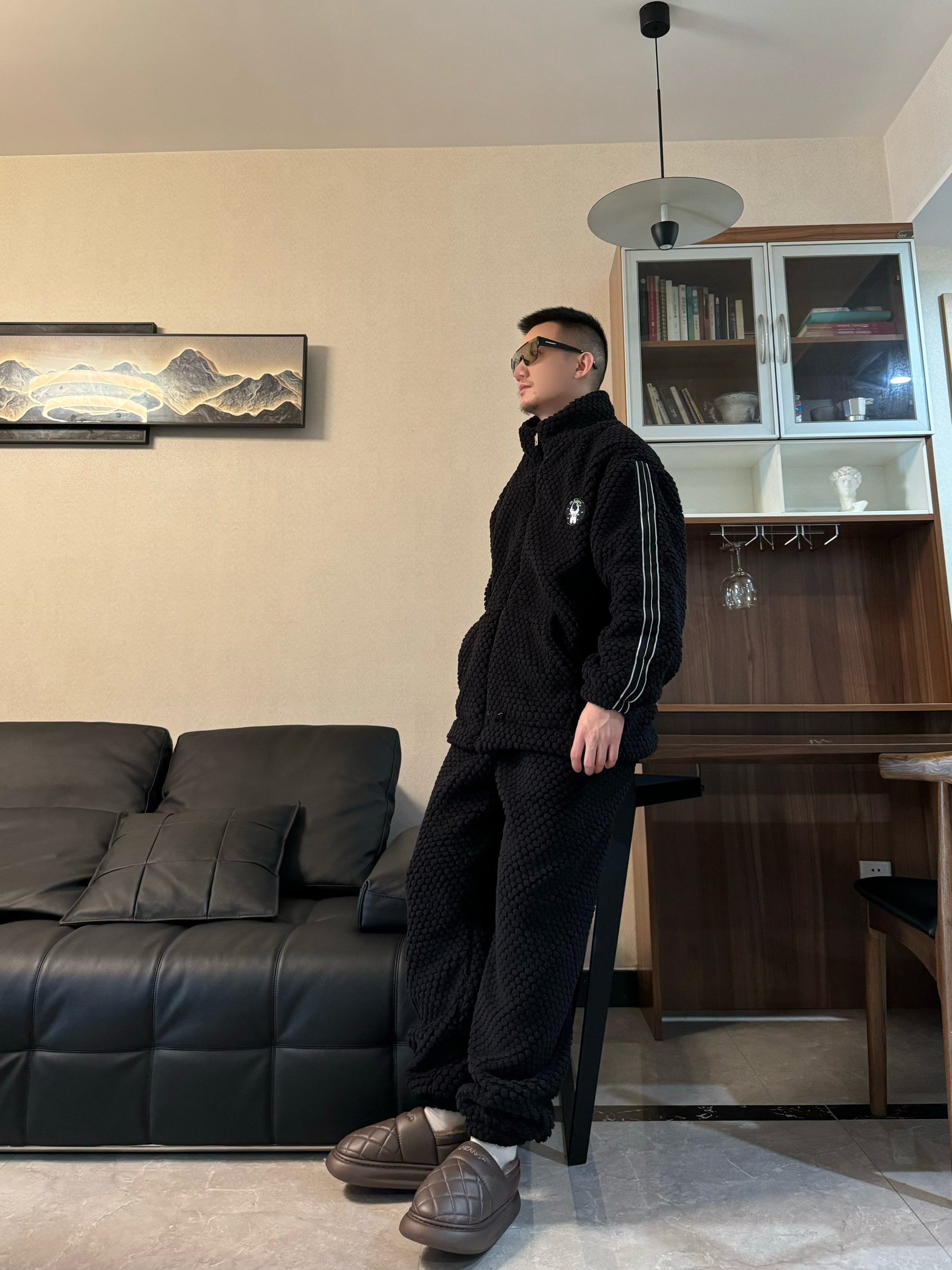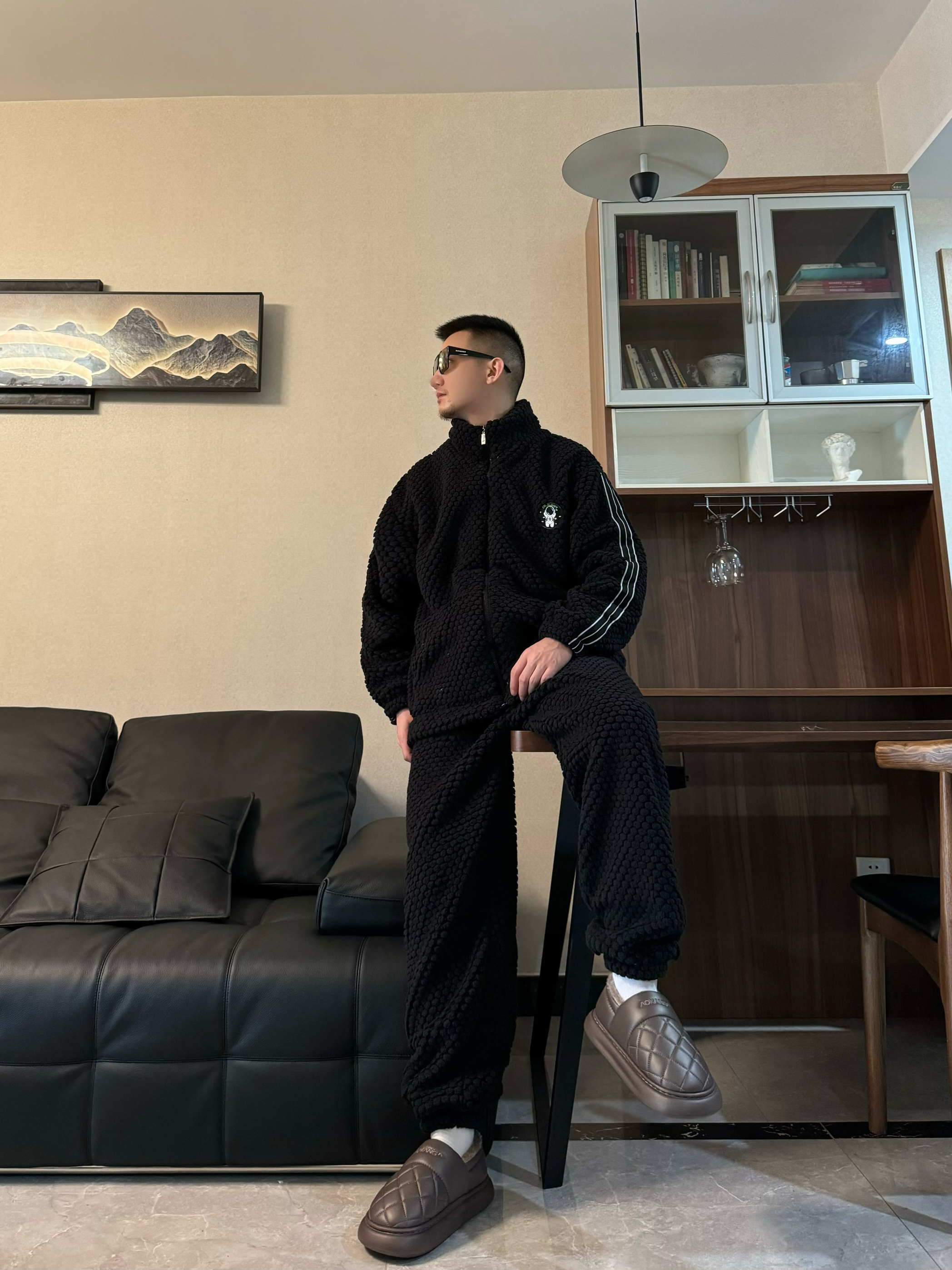 黑色系的睡衣 配上卡通的布贴 少年感满满 面料软乎乎的 很适合秋冬穿搭哦 再搭配一双加绒的棉拖鞋 脚感柔软舒适 内里加绒设计 保暖防寒踩屎感 嘎嘎好穿 整套搭配起来 居家氛围感满满 帅气十足~ 鞋子是偏小一码的哦 宝子们!