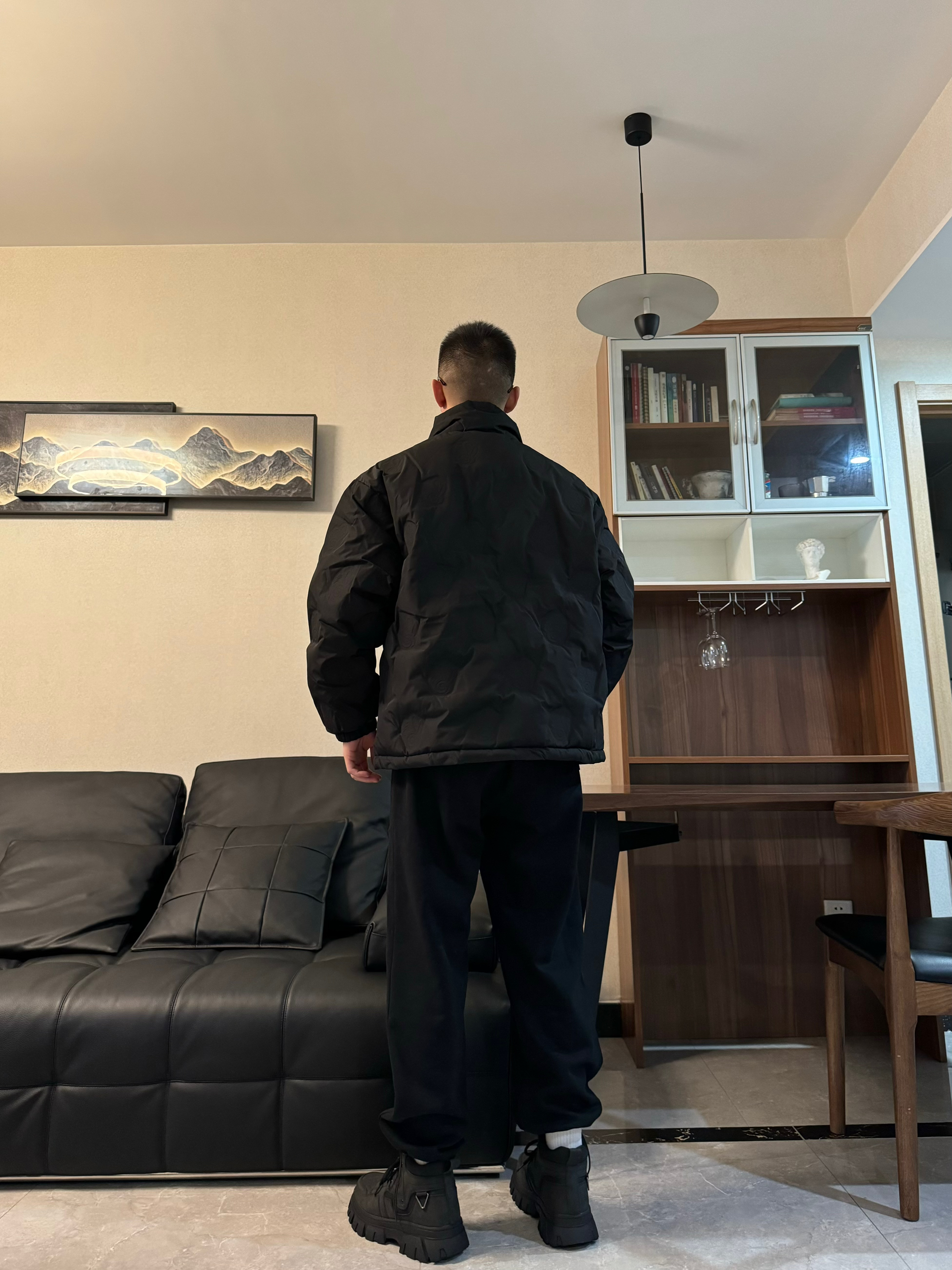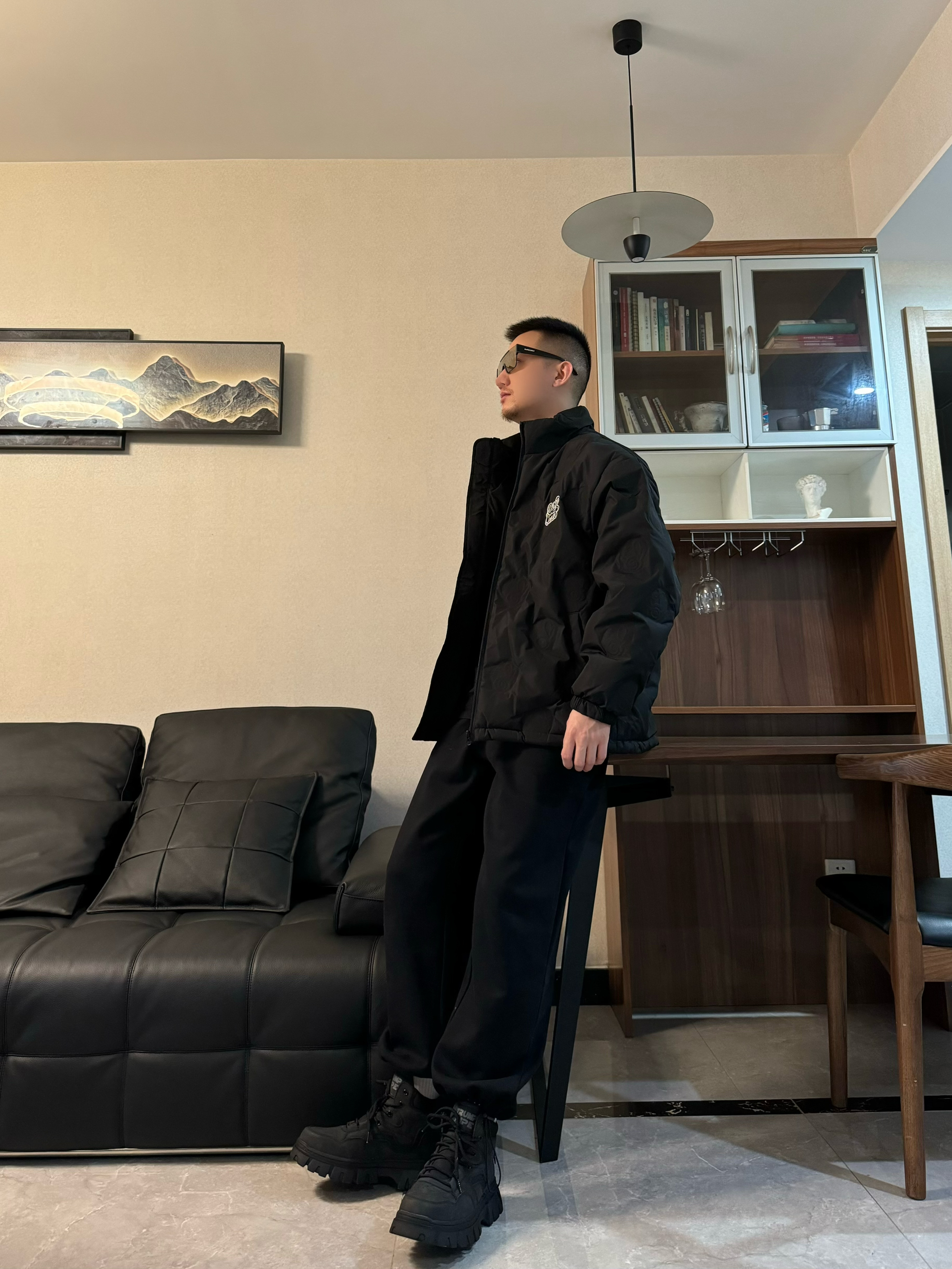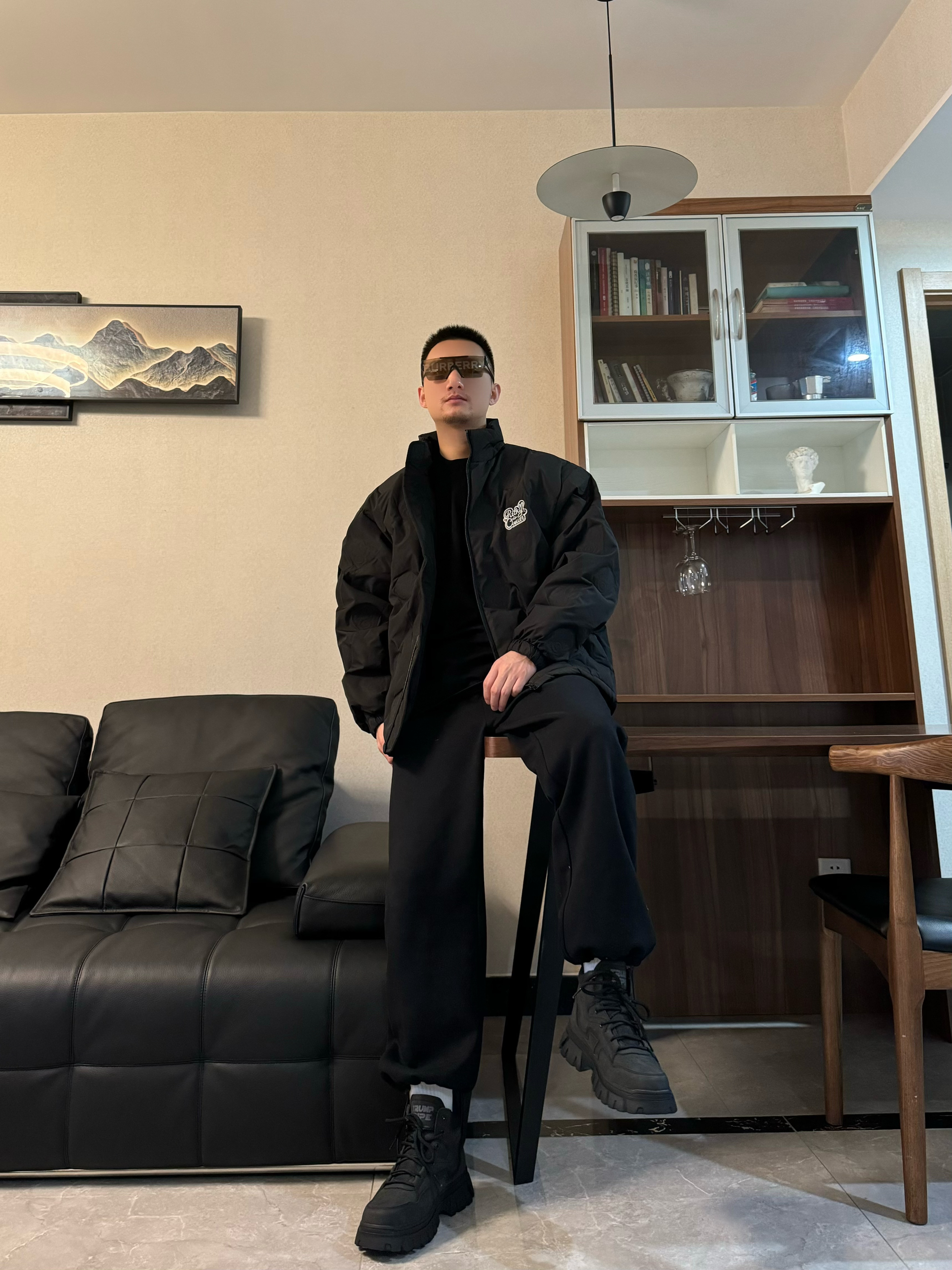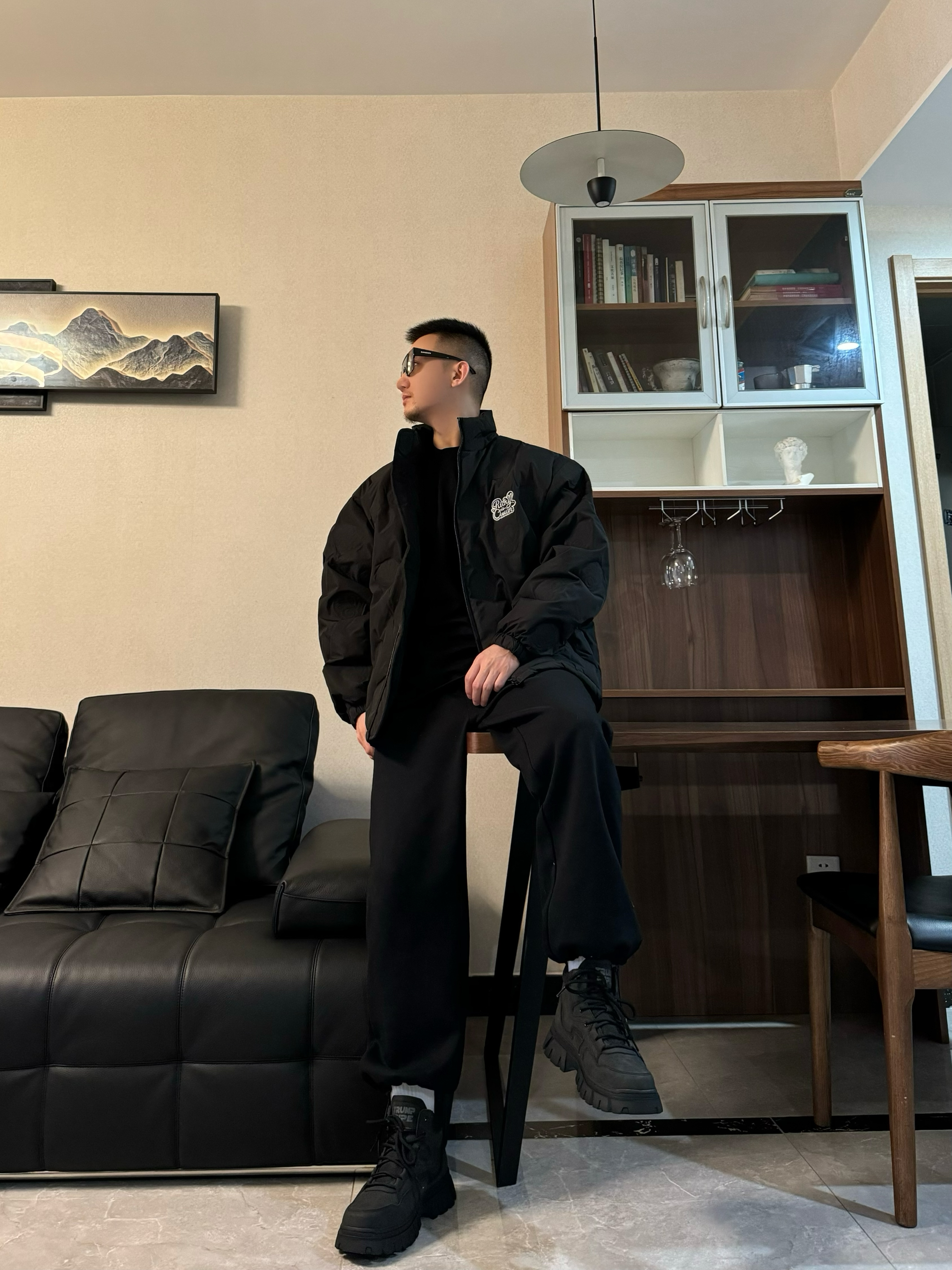 上身黑色轻薄款羽绒服 纯色搭配简约的Iogo很有质感 宽松的版型很好搭配 一整个帅住啦~ 下身来一条黑色休闲裤 同色系时尚百搭~ 再搭配一双黑色加绒短靴 脚感柔软轻便 中高帮的设计包裹感很不错 小厚底的设计 增高效果也很在线哦 和今天这身很适配呀 帅气出门吧!
