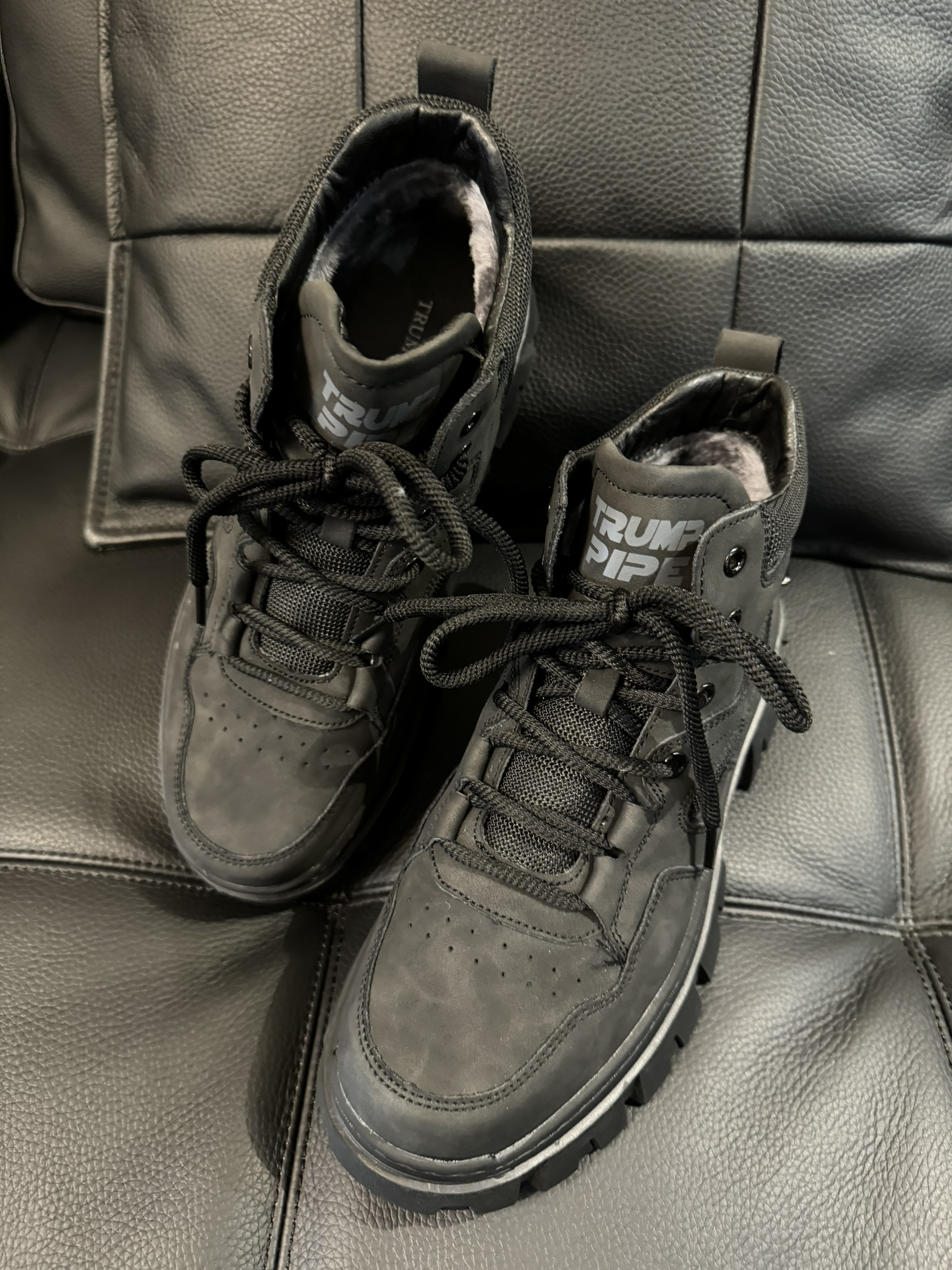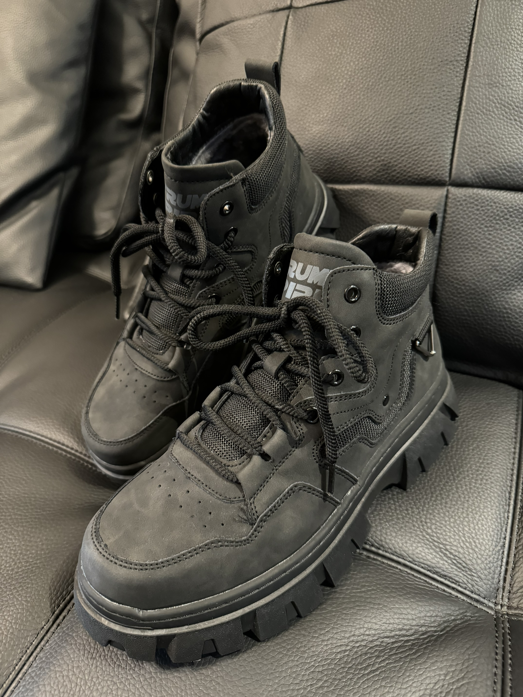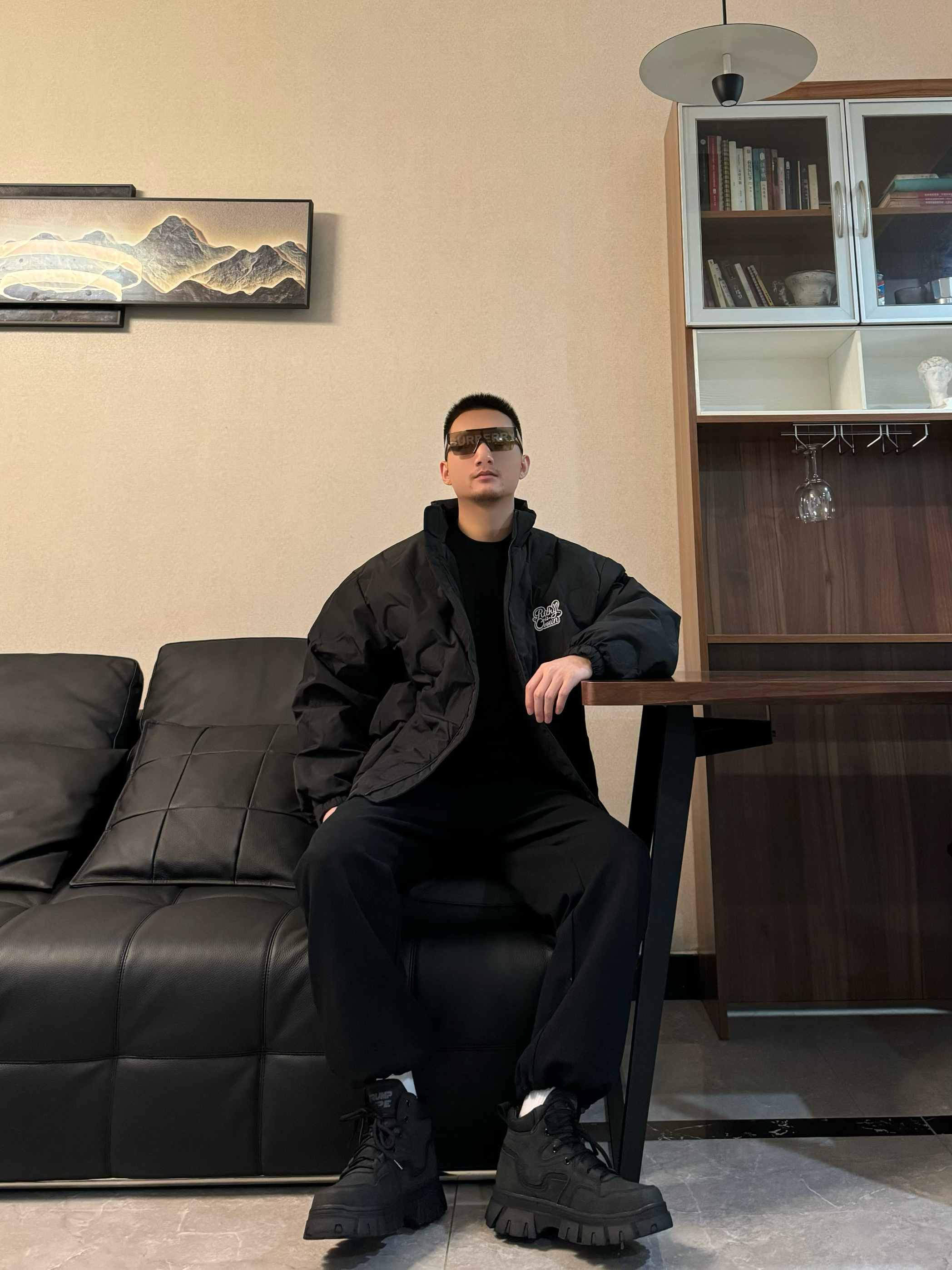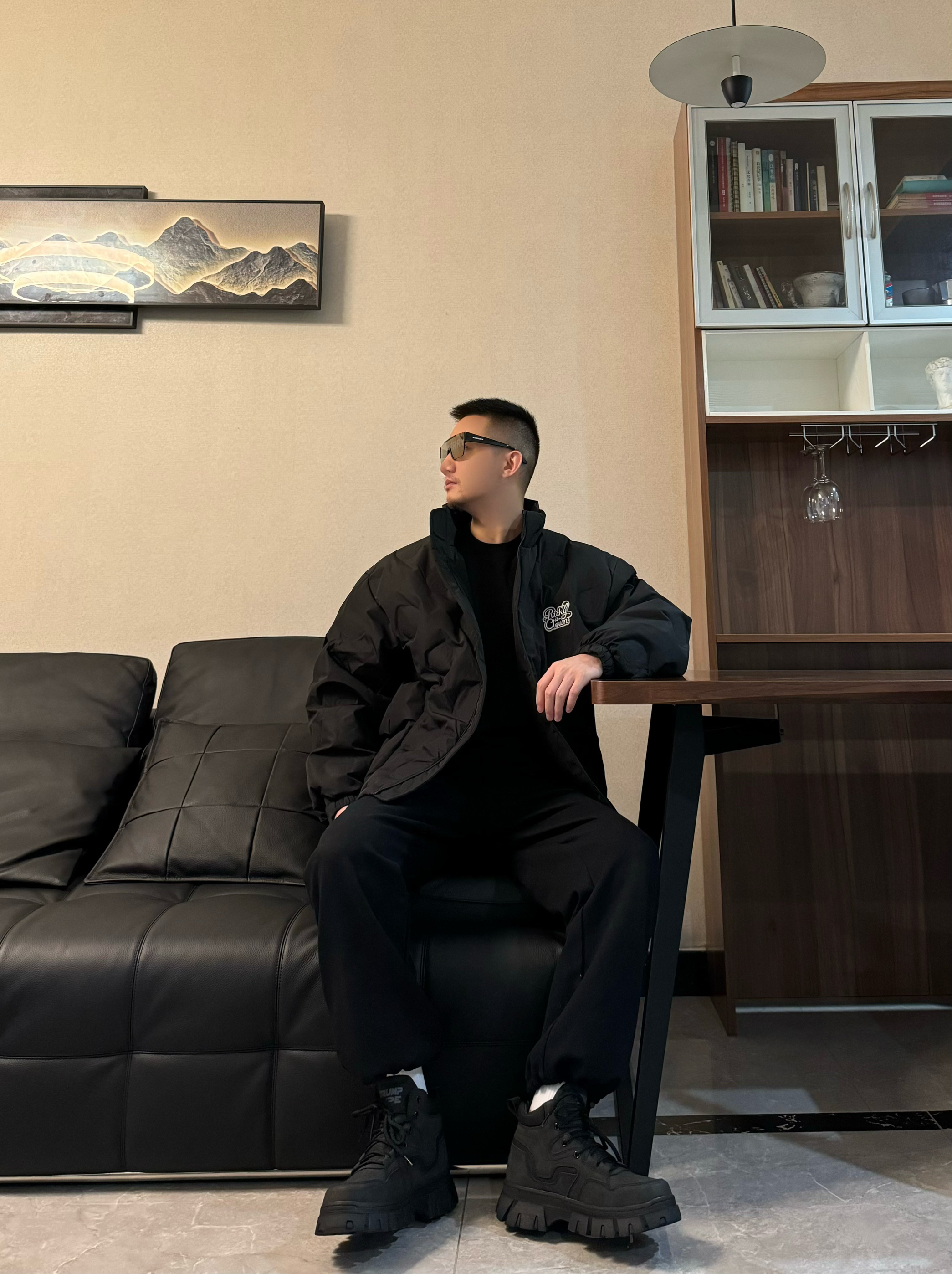上身黑色轻薄款羽绒服 纯色搭配简约的Iogo很有质感 宽松的版型很好搭配 一整个帅住啦~ 下身来一条黑色休闲裤 同色系时尚百搭~ 再搭配一双黑色加绒短靴 脚感柔软轻便 中高帮的设计包裹感很不错 小厚底的设计 增高效果也很在线哦 和今天这身很适配呀 帅气出门吧!