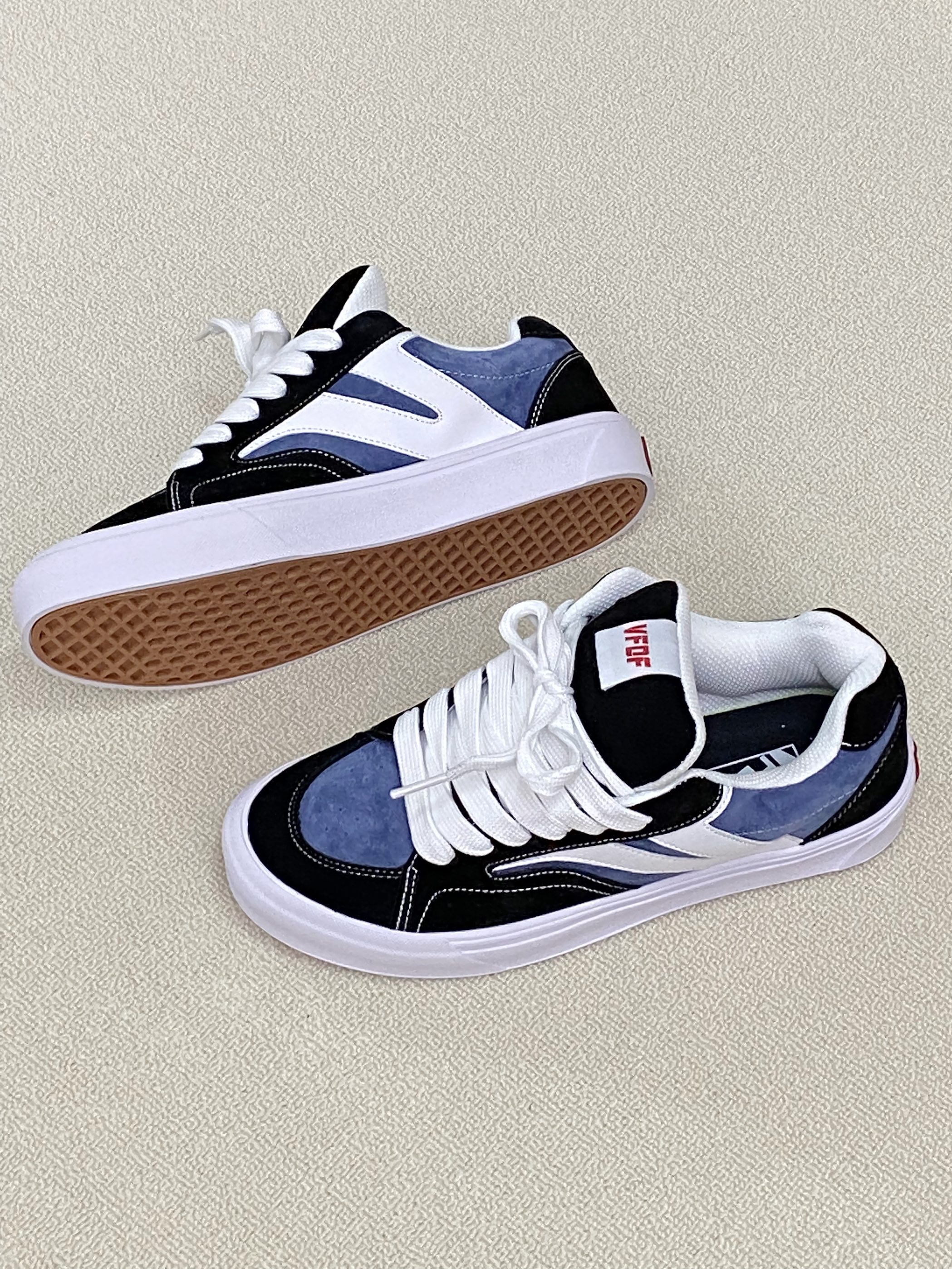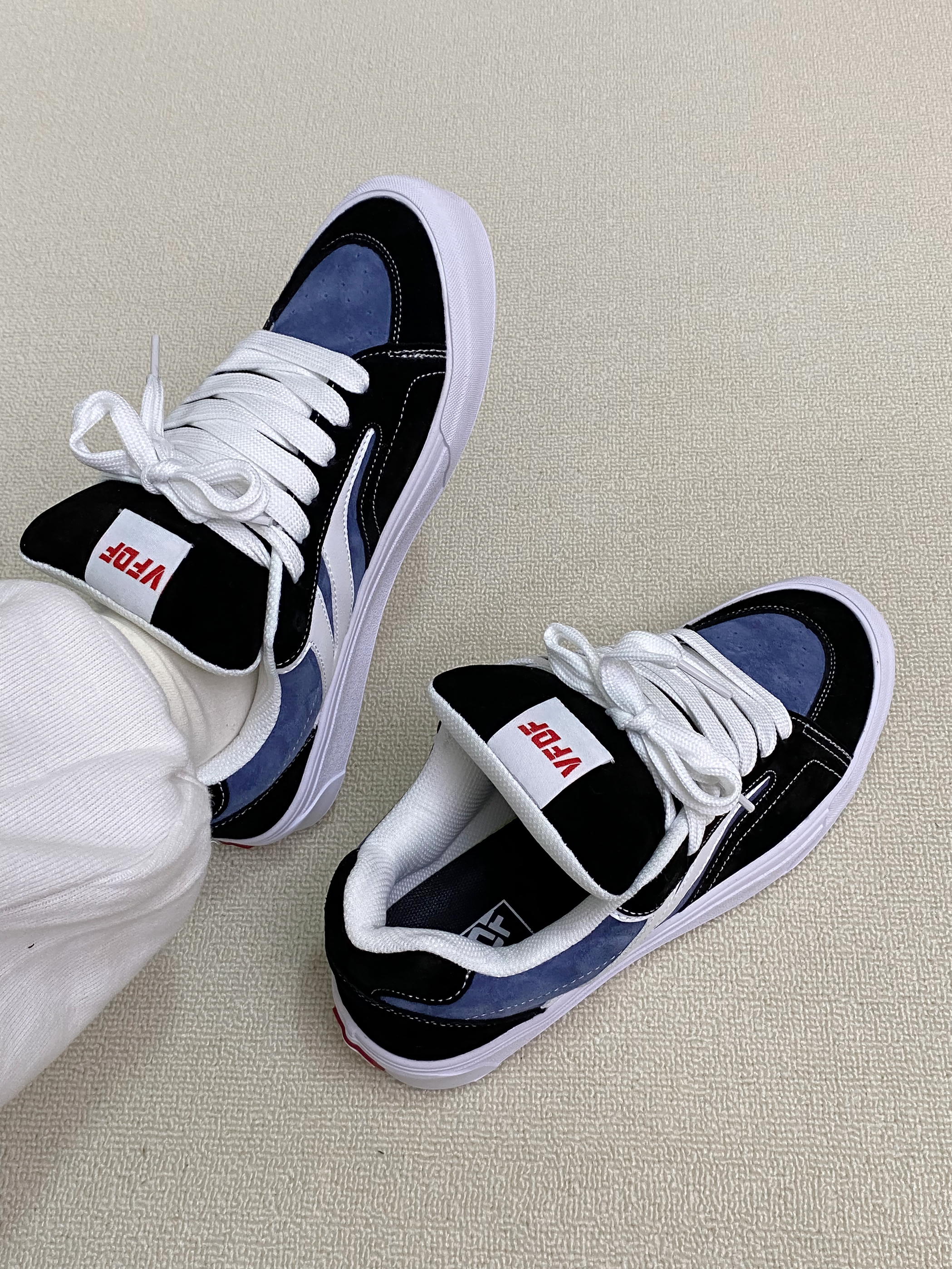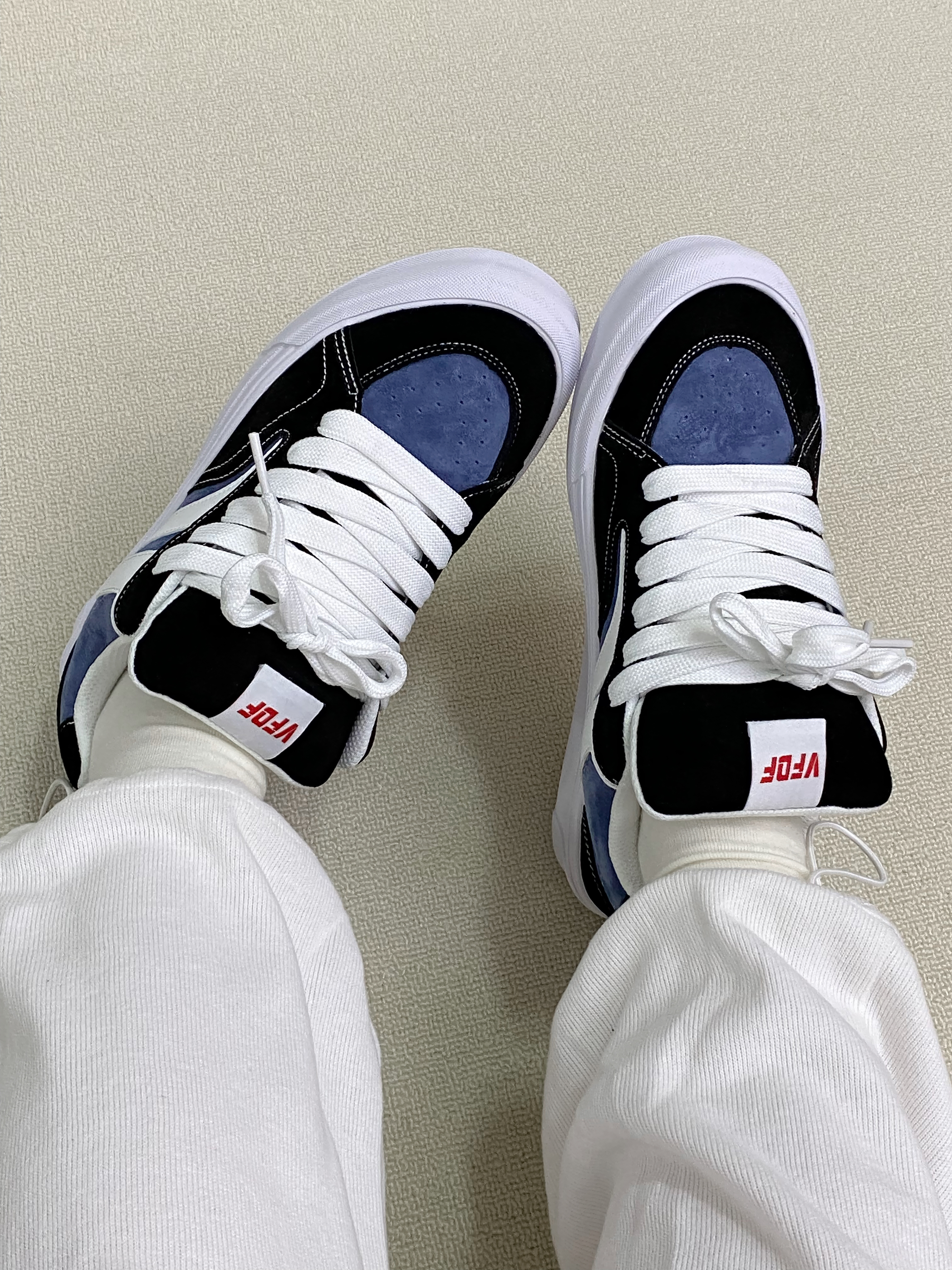 不得不说这双蓝黑的配色也太好看了吧 非常经典的板鞋 鞋型上脚休闲又好看 随便搭配一条裤子 就非常的出彩上脚脚感也不错,走路也很舒服~