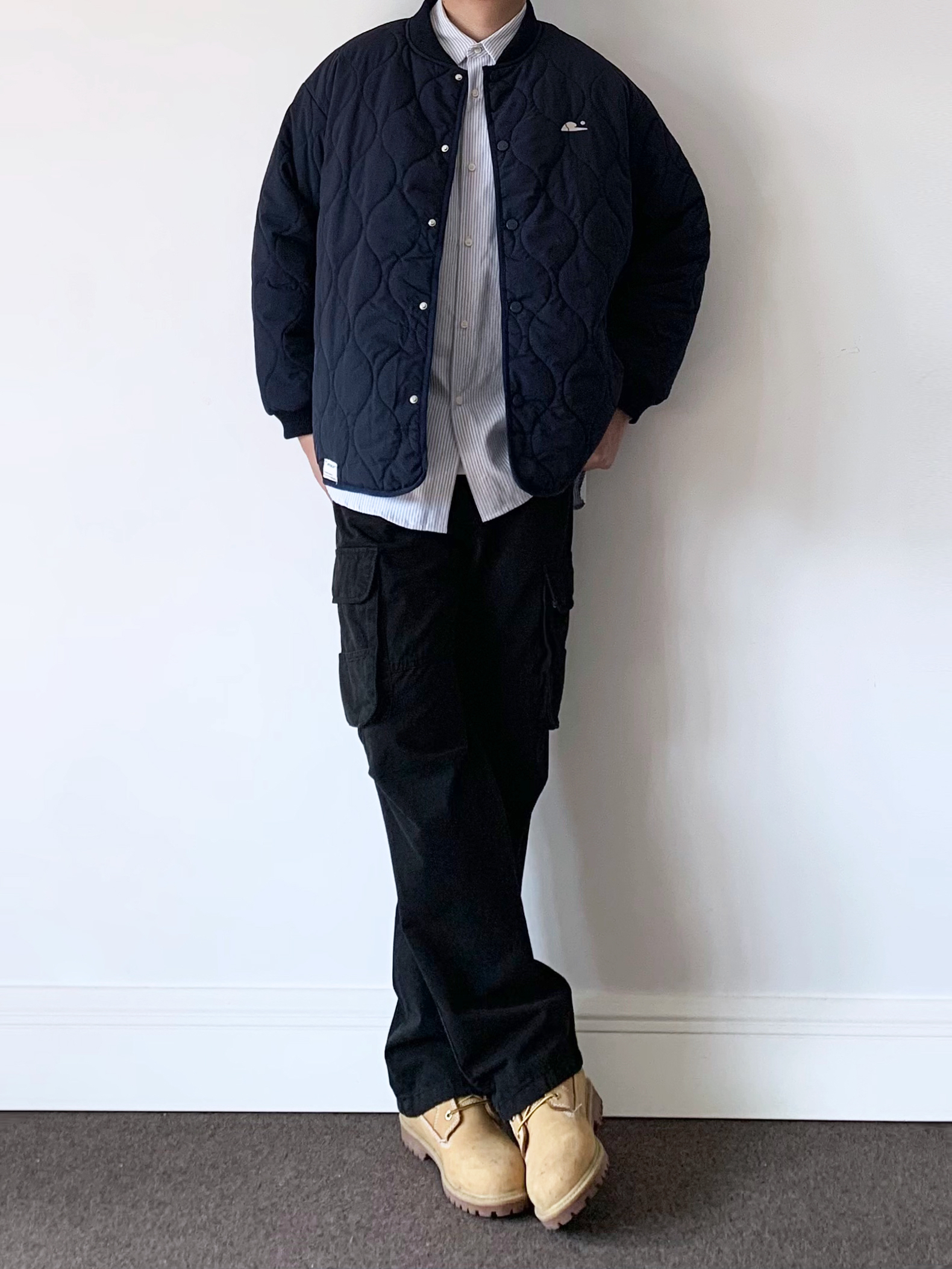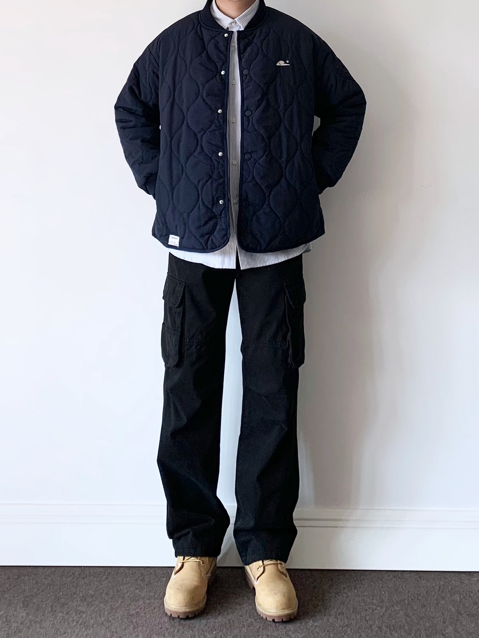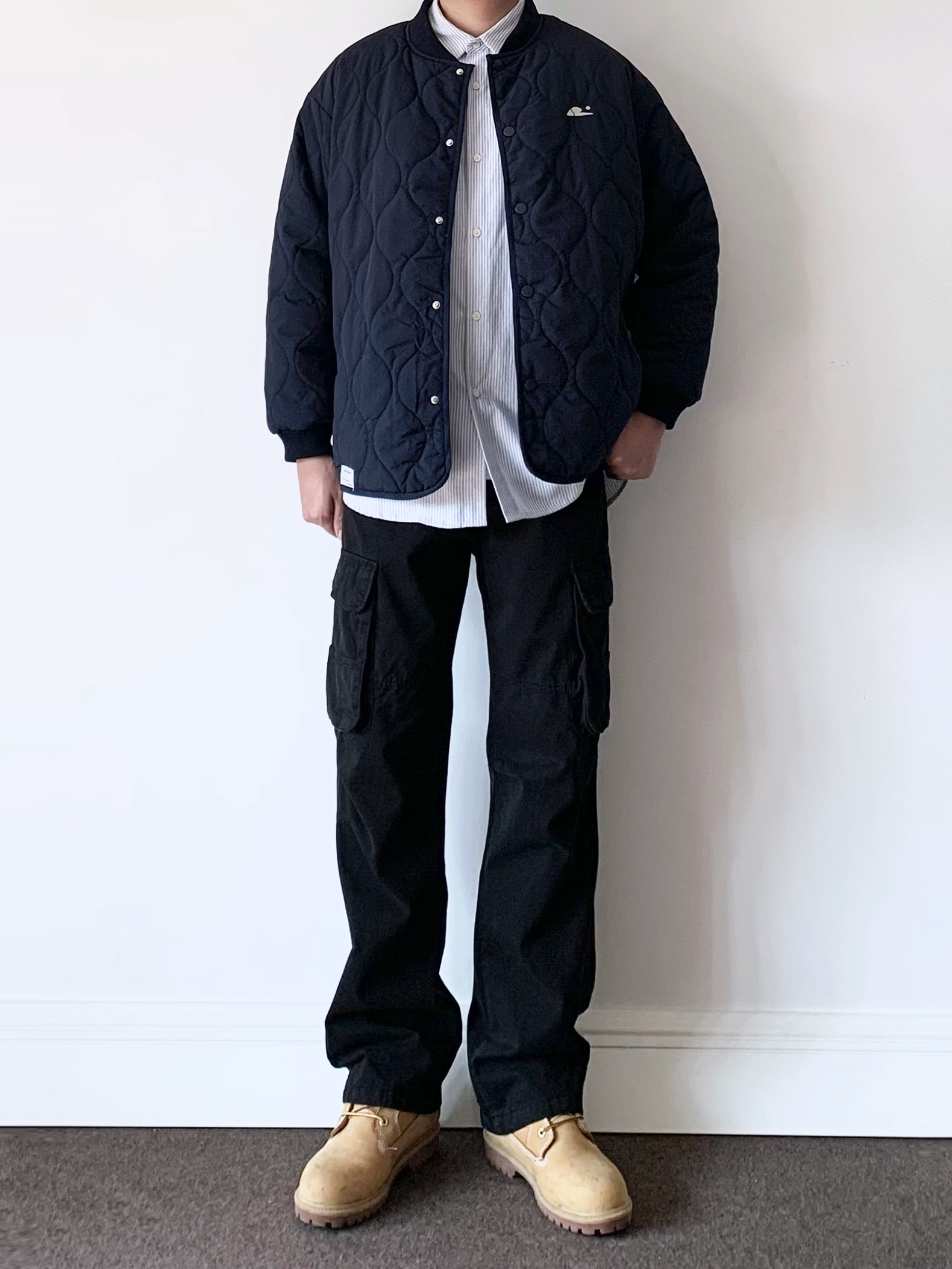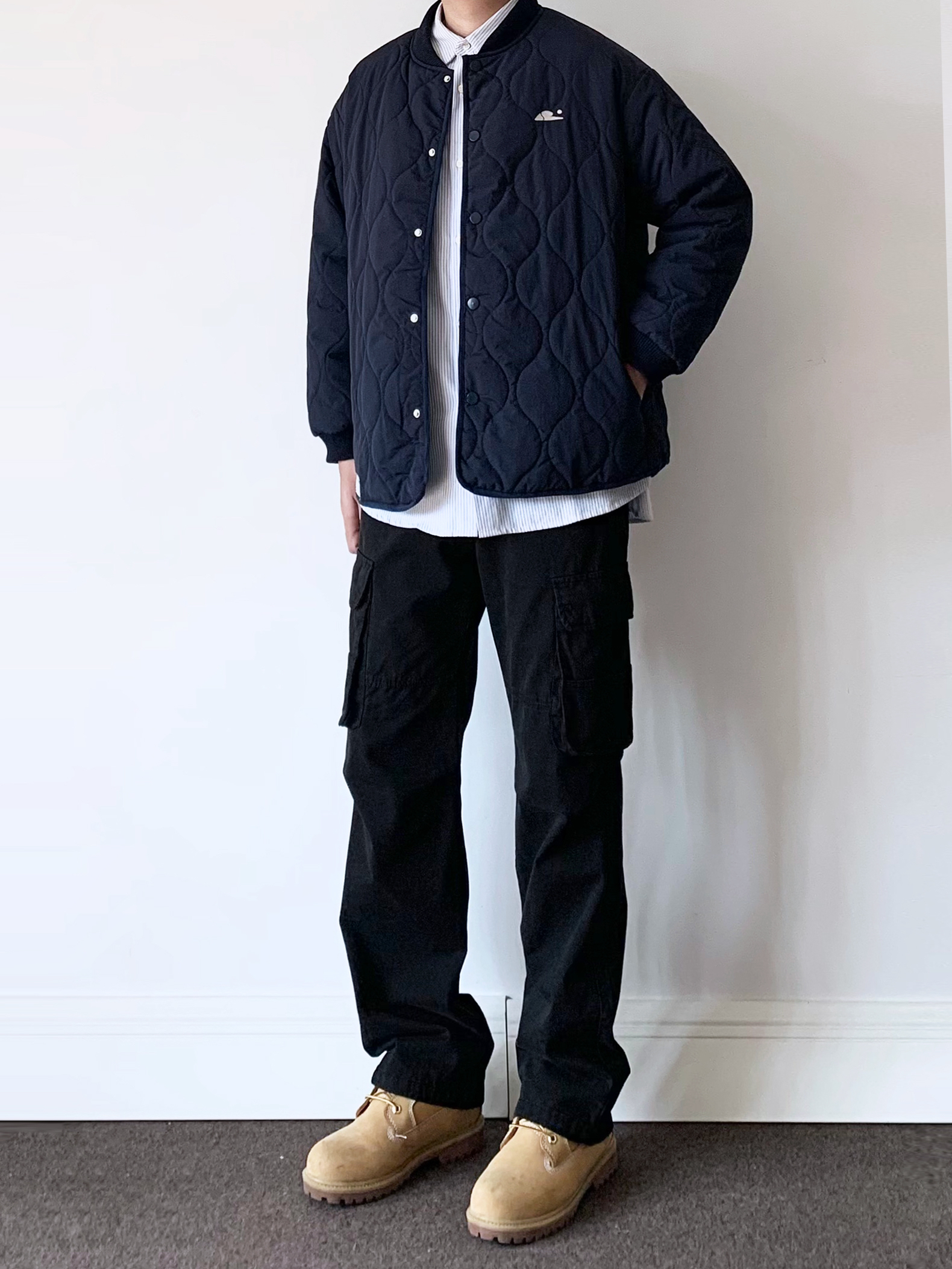 今日穿搭: 藏青色棒球服棉服内搭条纹衬衫 搭配黑色工装裤搭配大黄靴 复古工装搭配休闲感拉满!