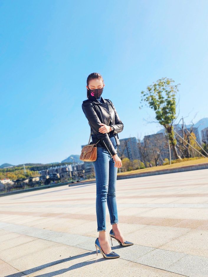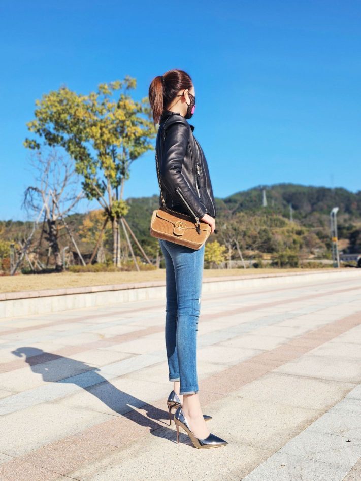 帅是一种感觉~! 机车皮夹克~修身直筒牛仔裤~银色高跟鞋~! 飒酷又有女人味~ 既能斩男,又能斩女!
