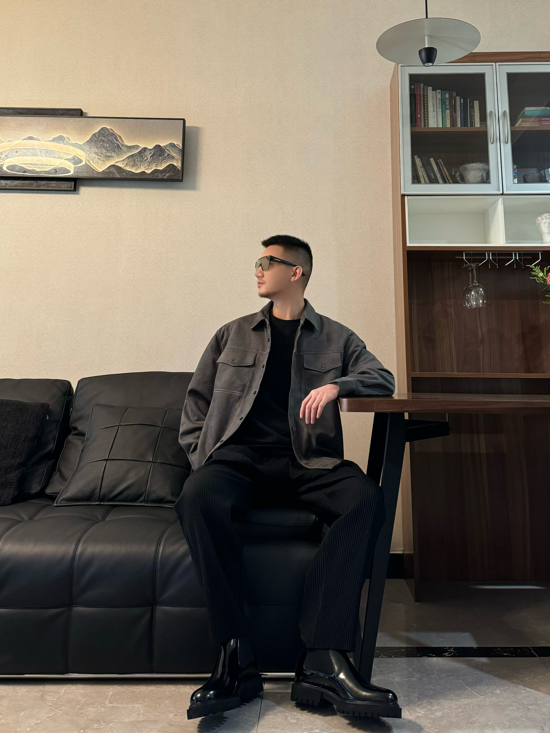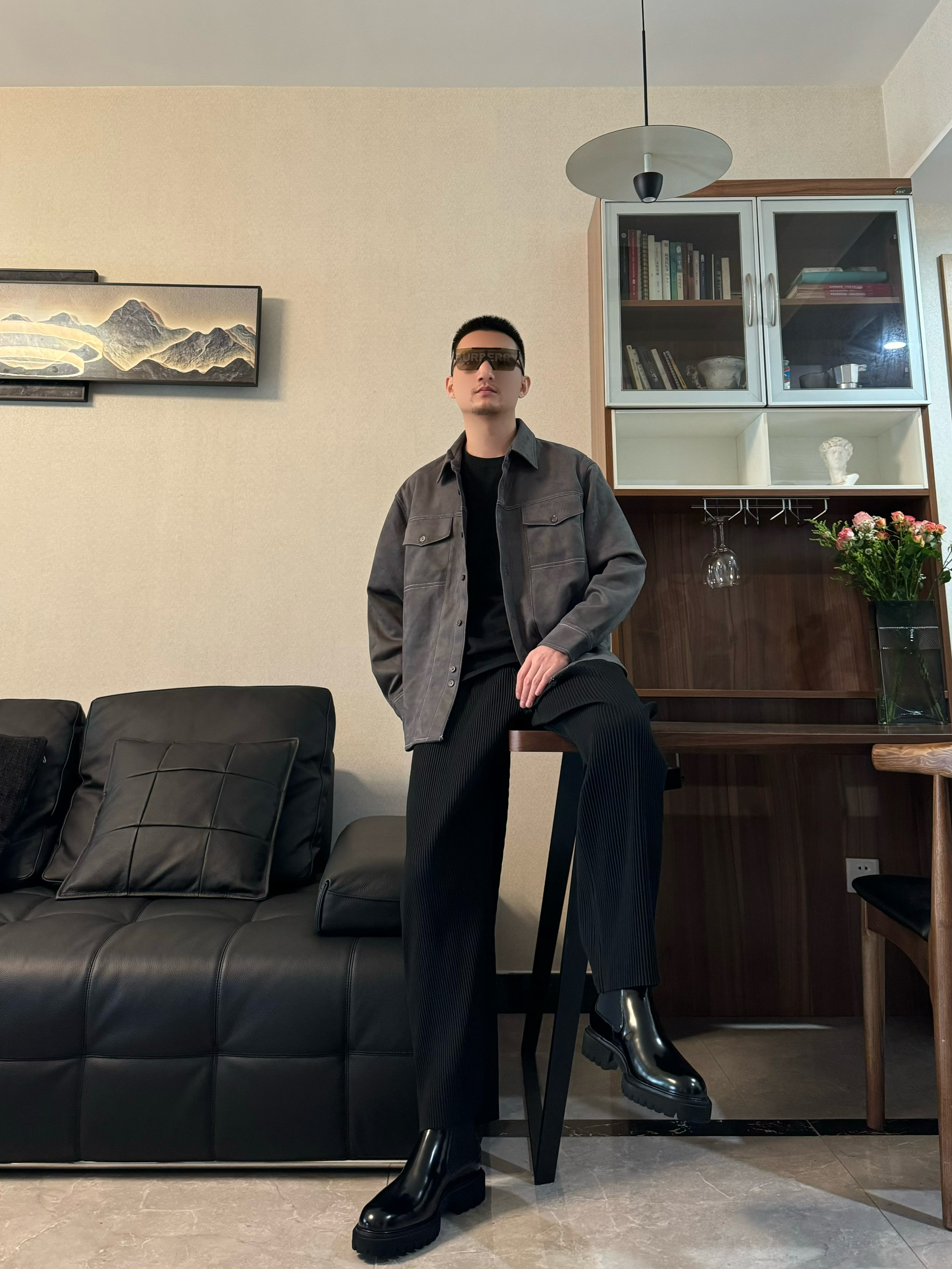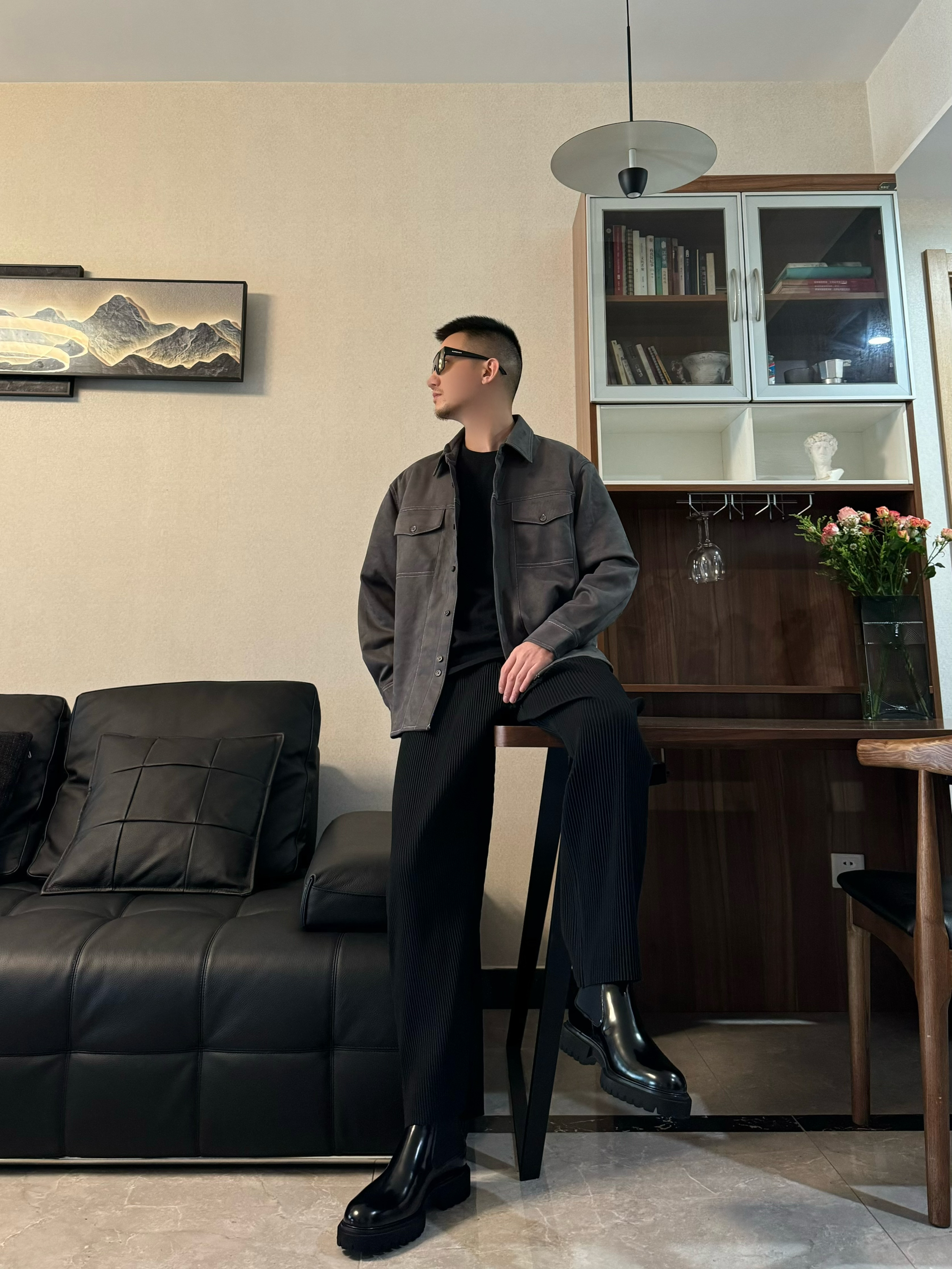 上身翻领衬衫 宽松的设计 顶男即视感一下子就上来 了 下身来一条黑色休闲裤 垂感设计 时尚百搭 再搭配一双黑色切尔西靴 亮面的设计很吸睛 脚感柔软舒适 一脚蹬的设计 很方便脱穿哦 跟今天的穿搭很适配 气质感稳稳拿住吧!