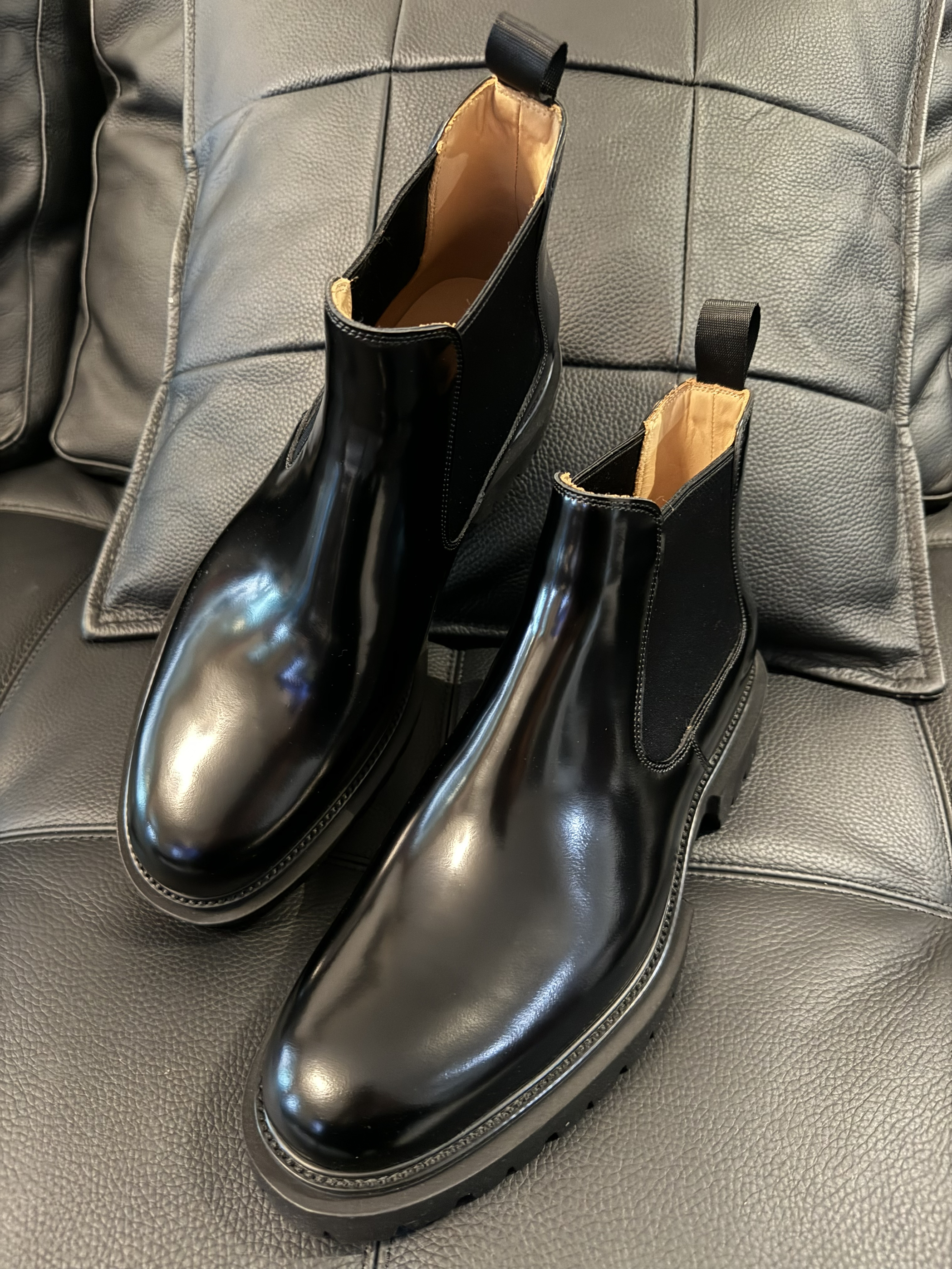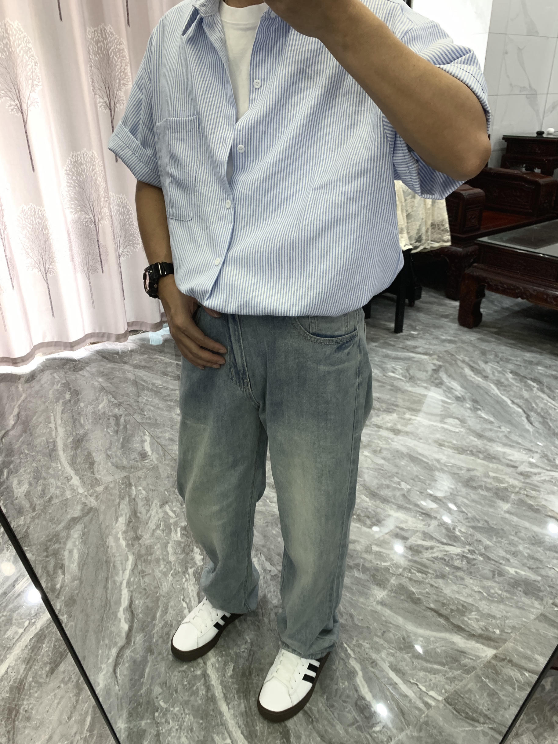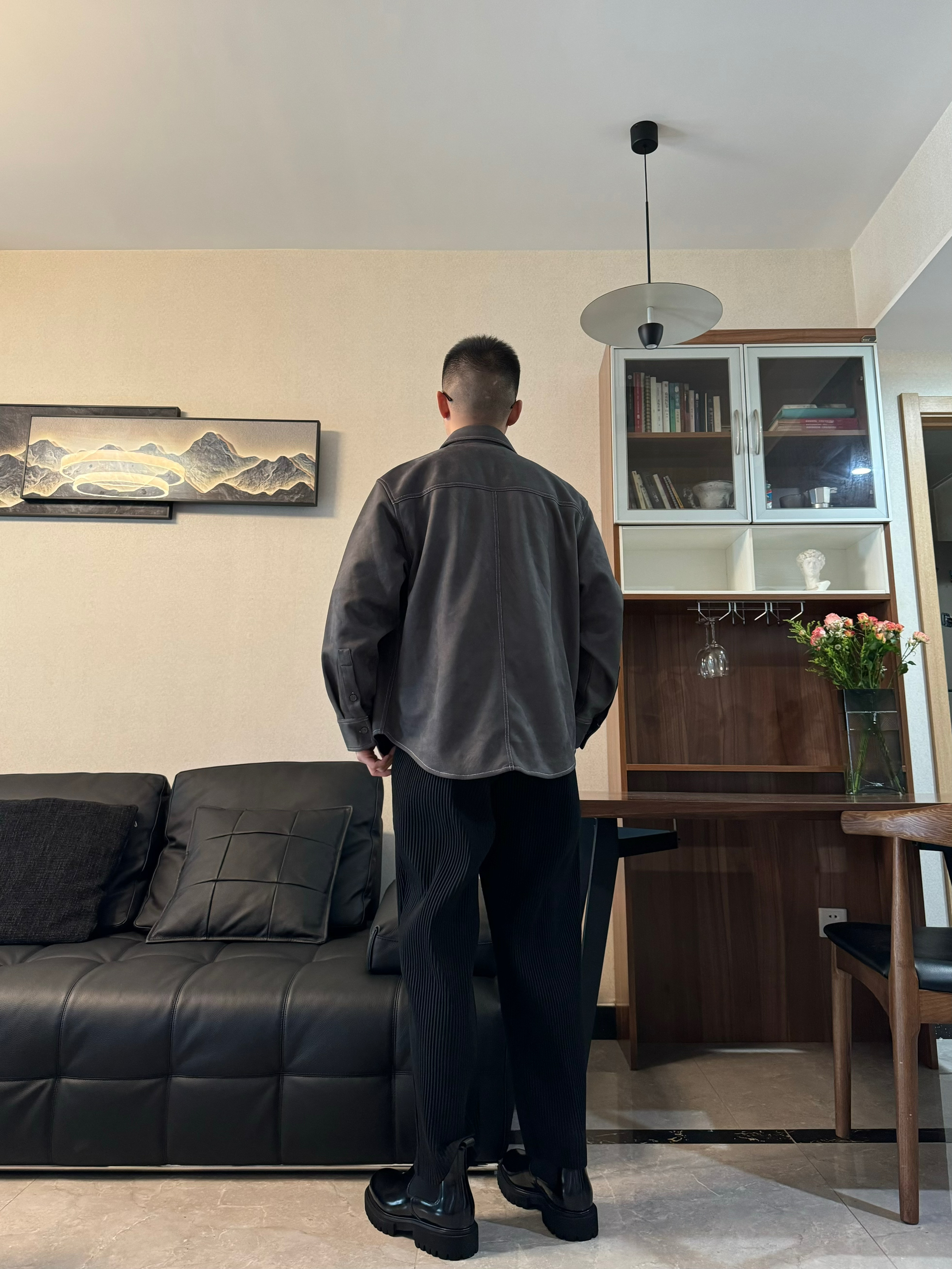 上身翻领衬衫 宽松的设计 顶男即视感一下子就上来 了 下身来一条黑色休闲裤 垂感设计 时尚百搭 再搭配一双黑色切尔西靴 亮面的设计很吸睛 脚感柔软舒适 一脚蹬的设计 很方便脱穿哦 跟今天的穿搭很适配 气质感稳稳拿住吧!