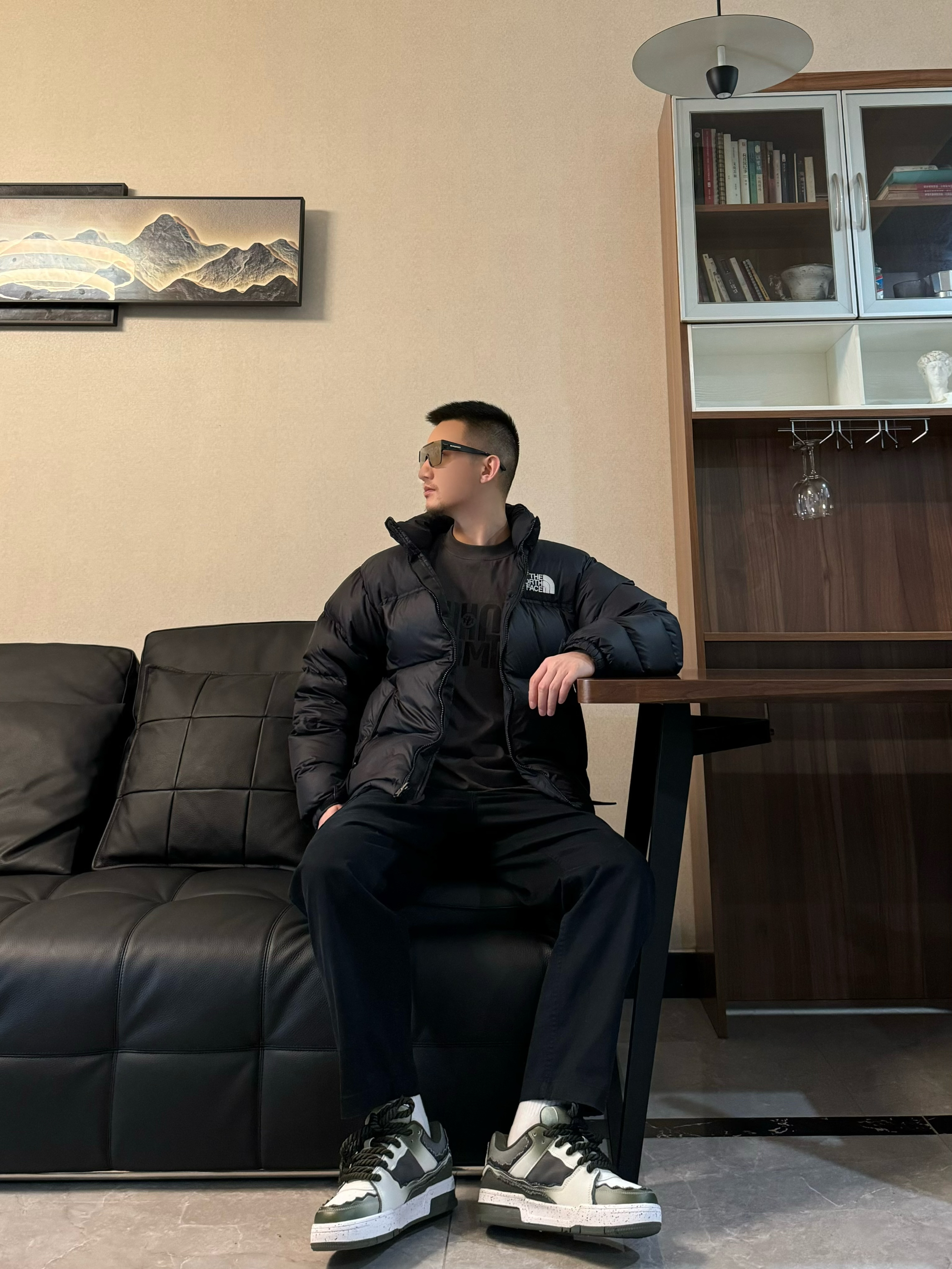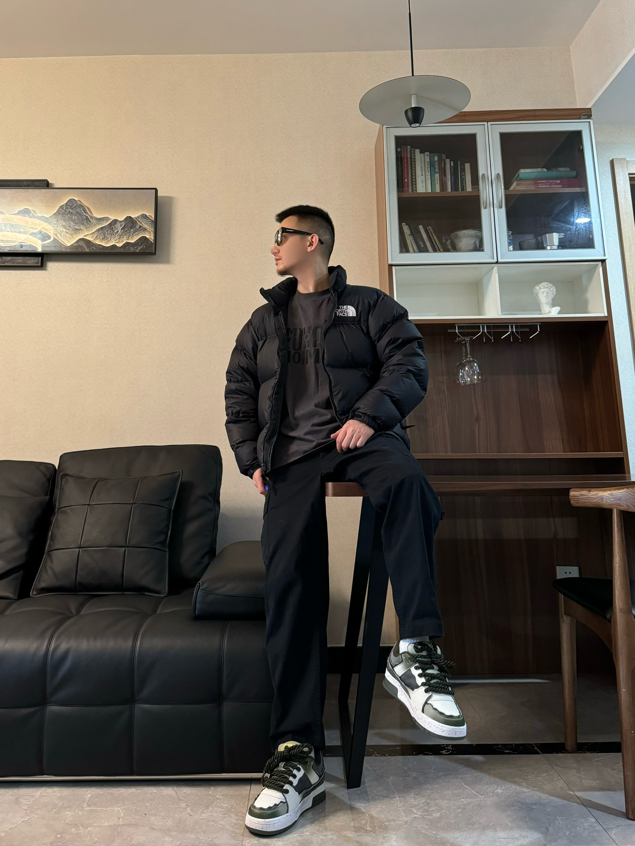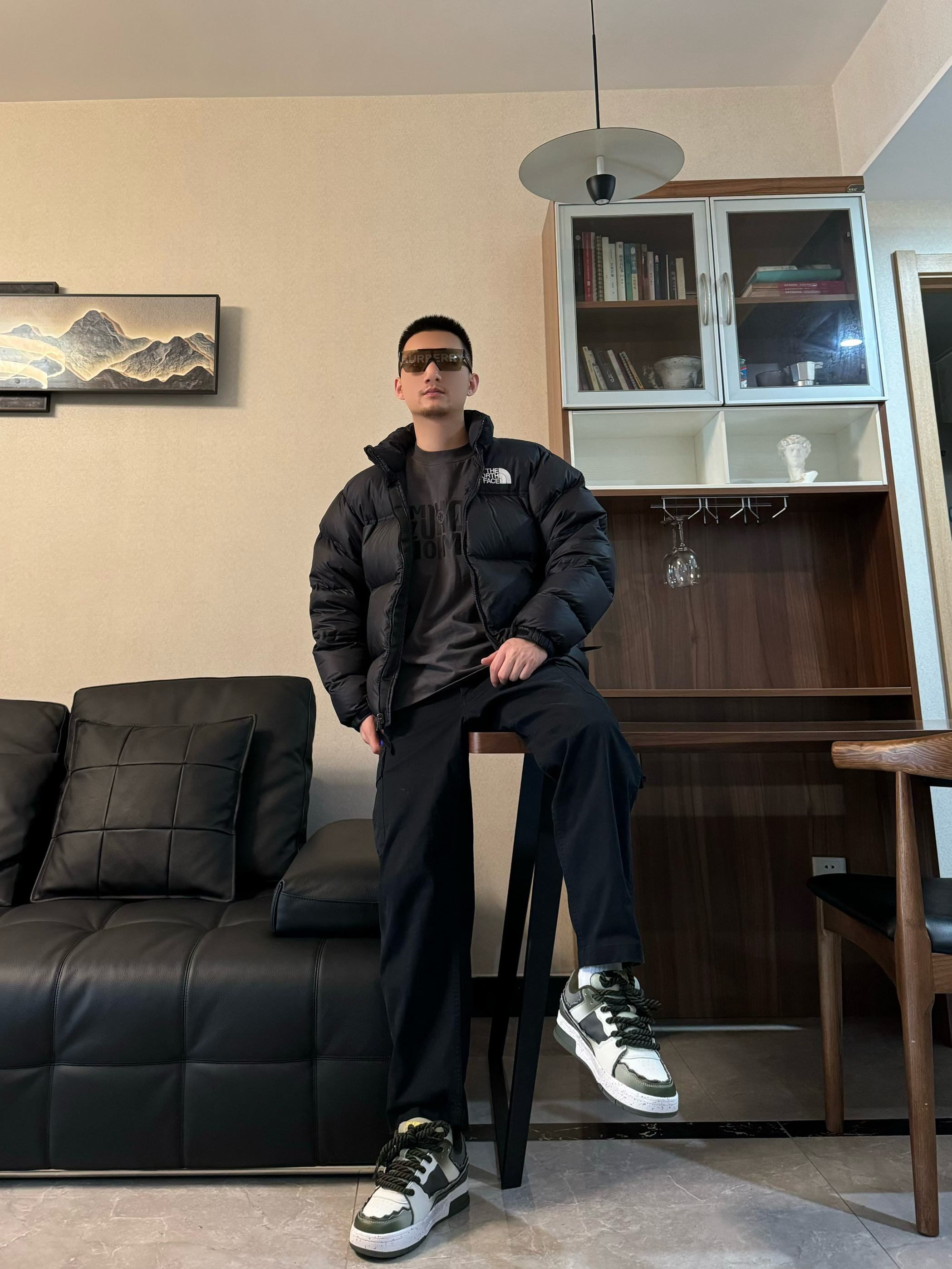 上身黑色羽绒服 简约的纯色配上刺绣logo的点缀质感一下子就上来了! 下身来一条黑色牛仔裤 直筒设计 帅气十足~ 再搭配一双设计感的板鞋 脚感和颜值都很在线 鞋底耐磨防滑 和今天的穿搭很适配哦 帅气出街吧