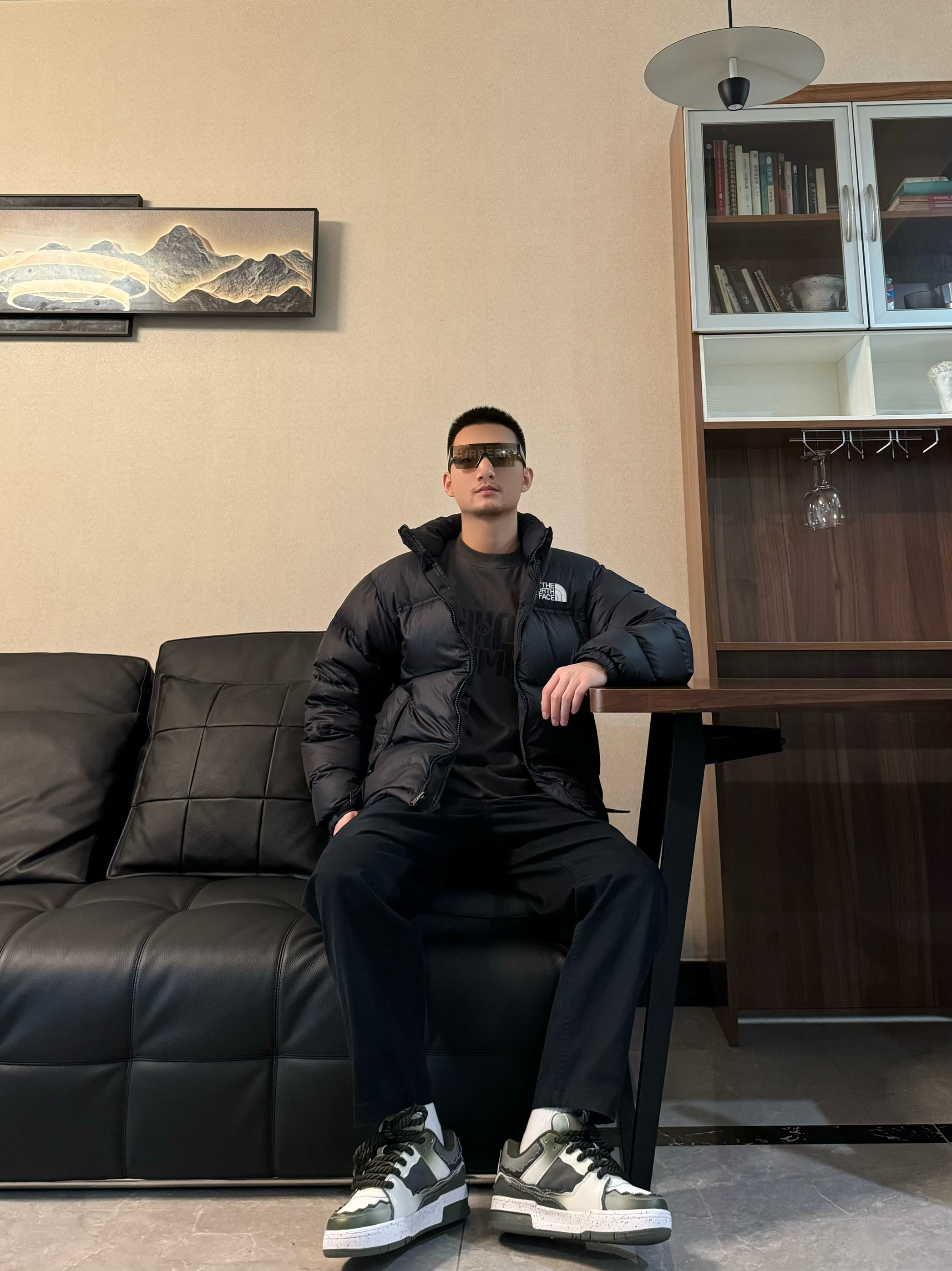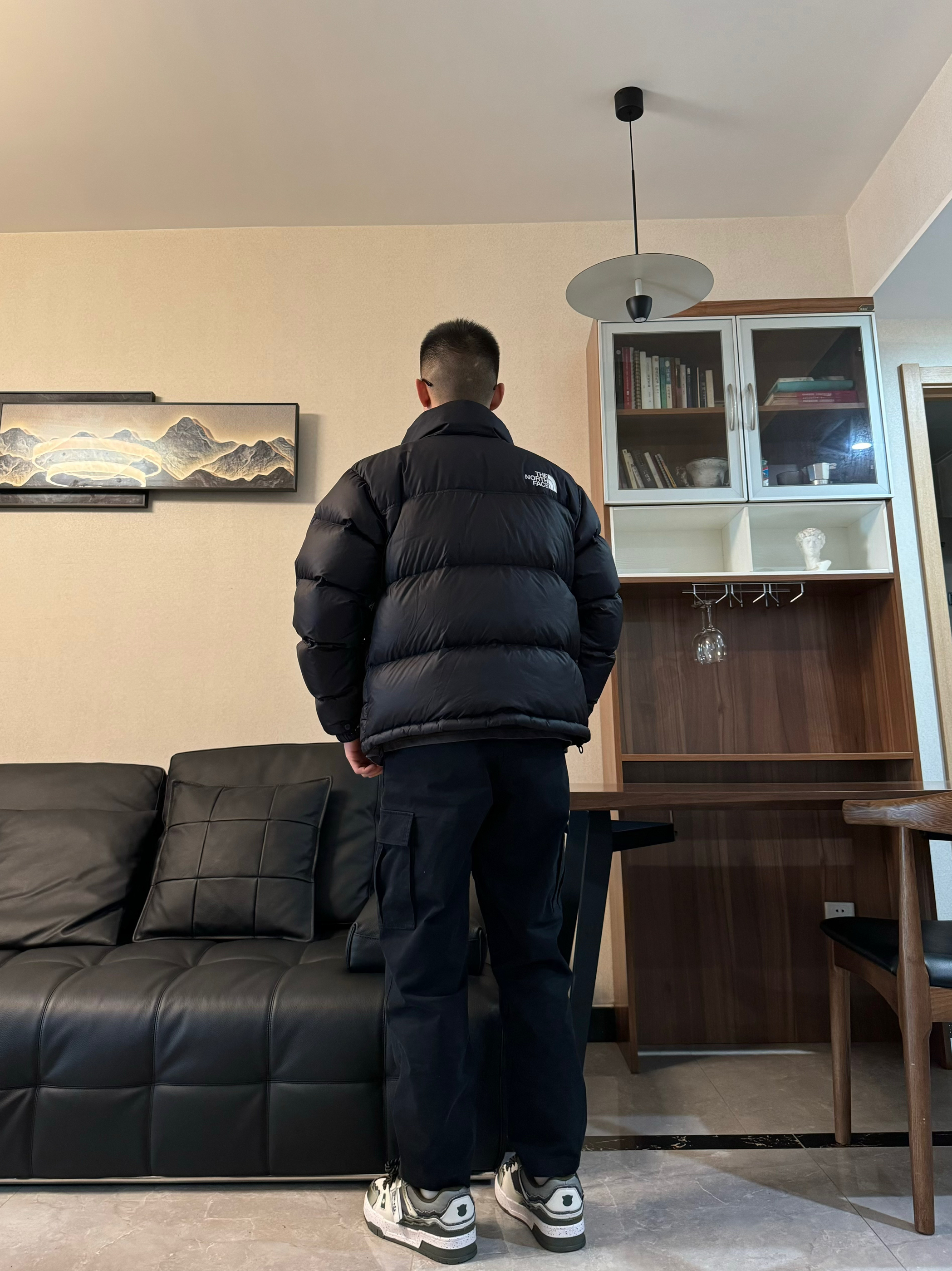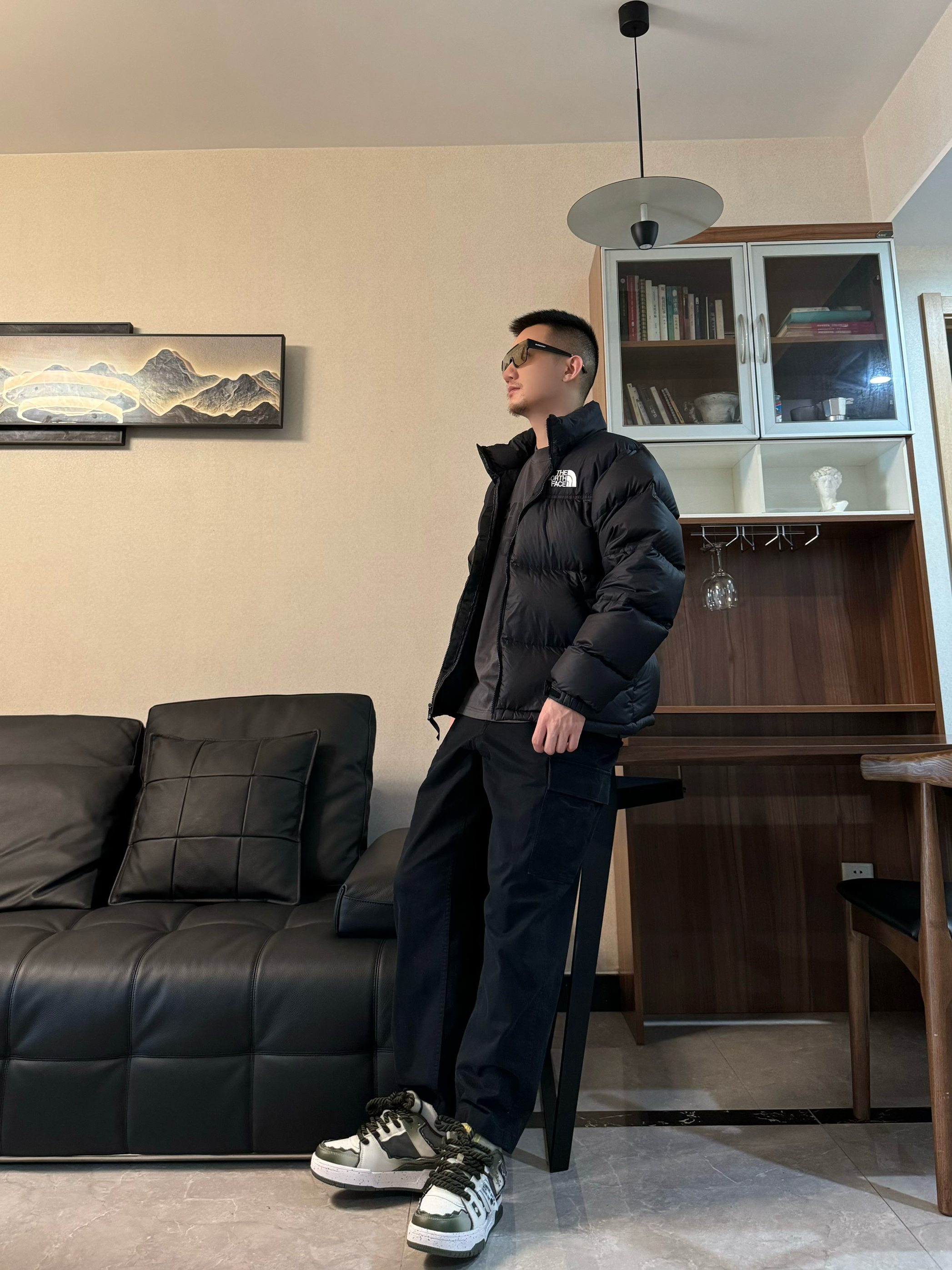 上身黑色羽绒服 简约的纯色配上刺绣logo的点缀质感一下子就上来了! 下身来一条黑色牛仔裤 直筒设计 帅气十足~ 再搭配一双设计感的板鞋 脚感和颜值都很在线 鞋底耐磨防滑 和今天的穿搭很适配哦 帅气出街吧