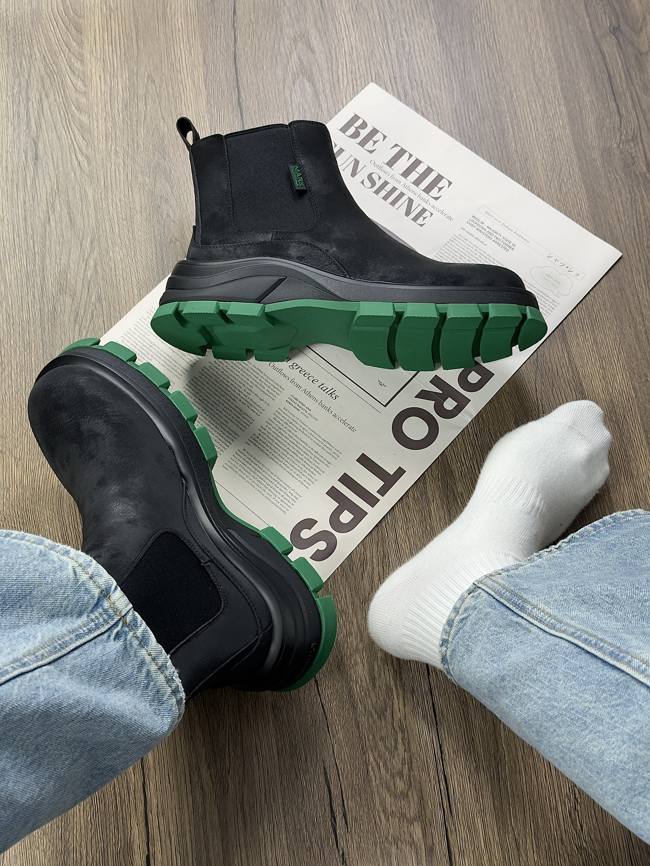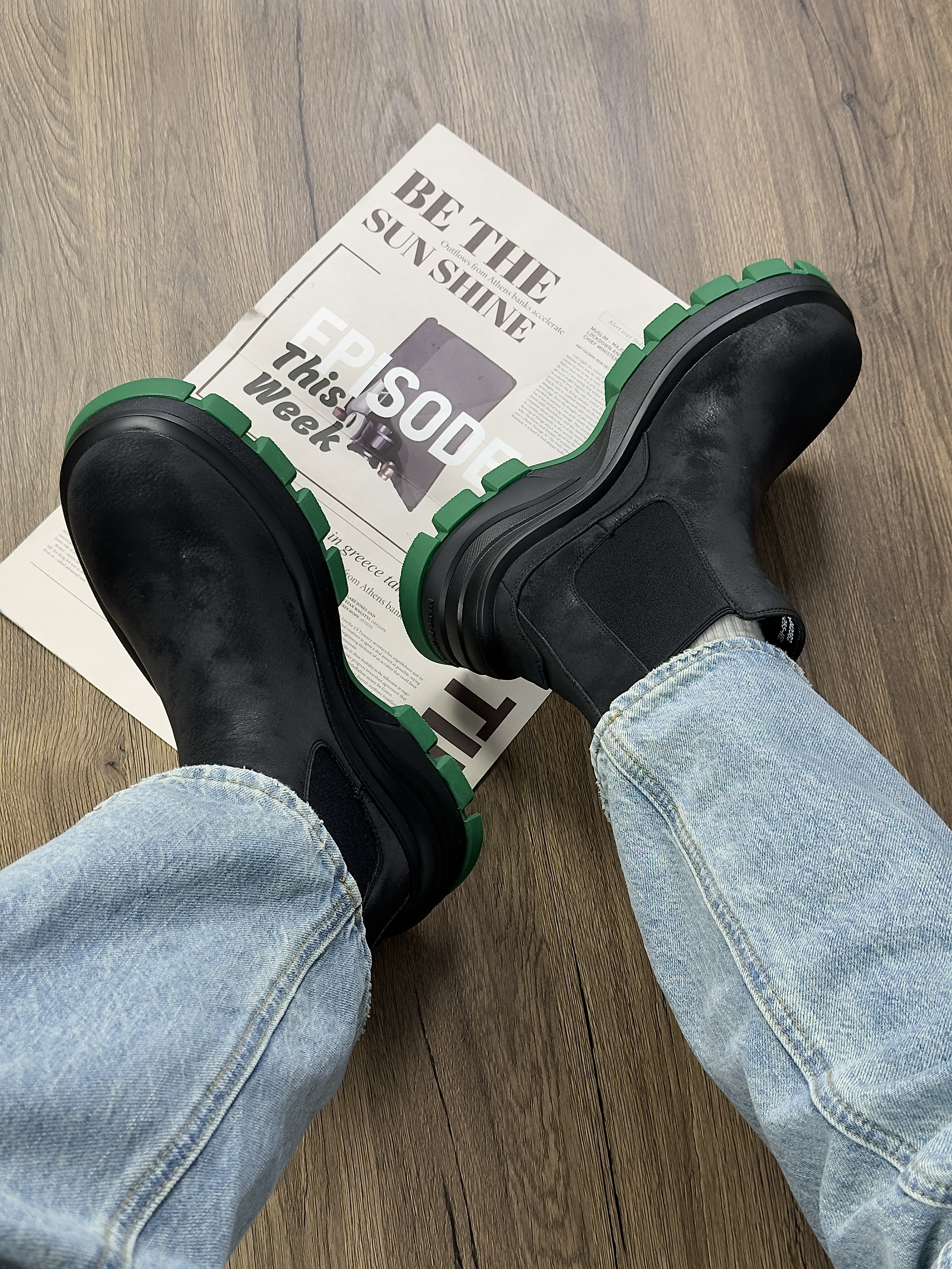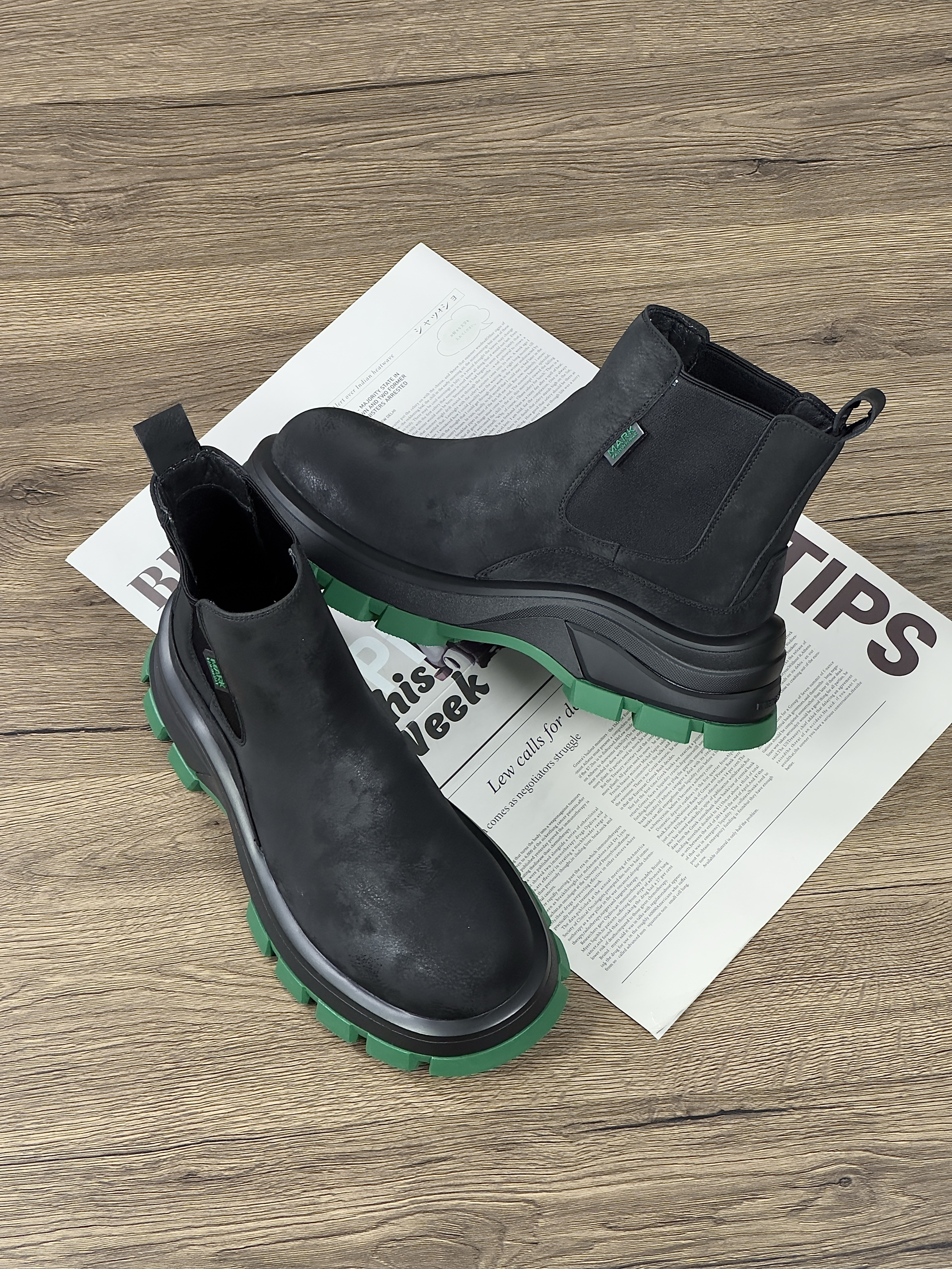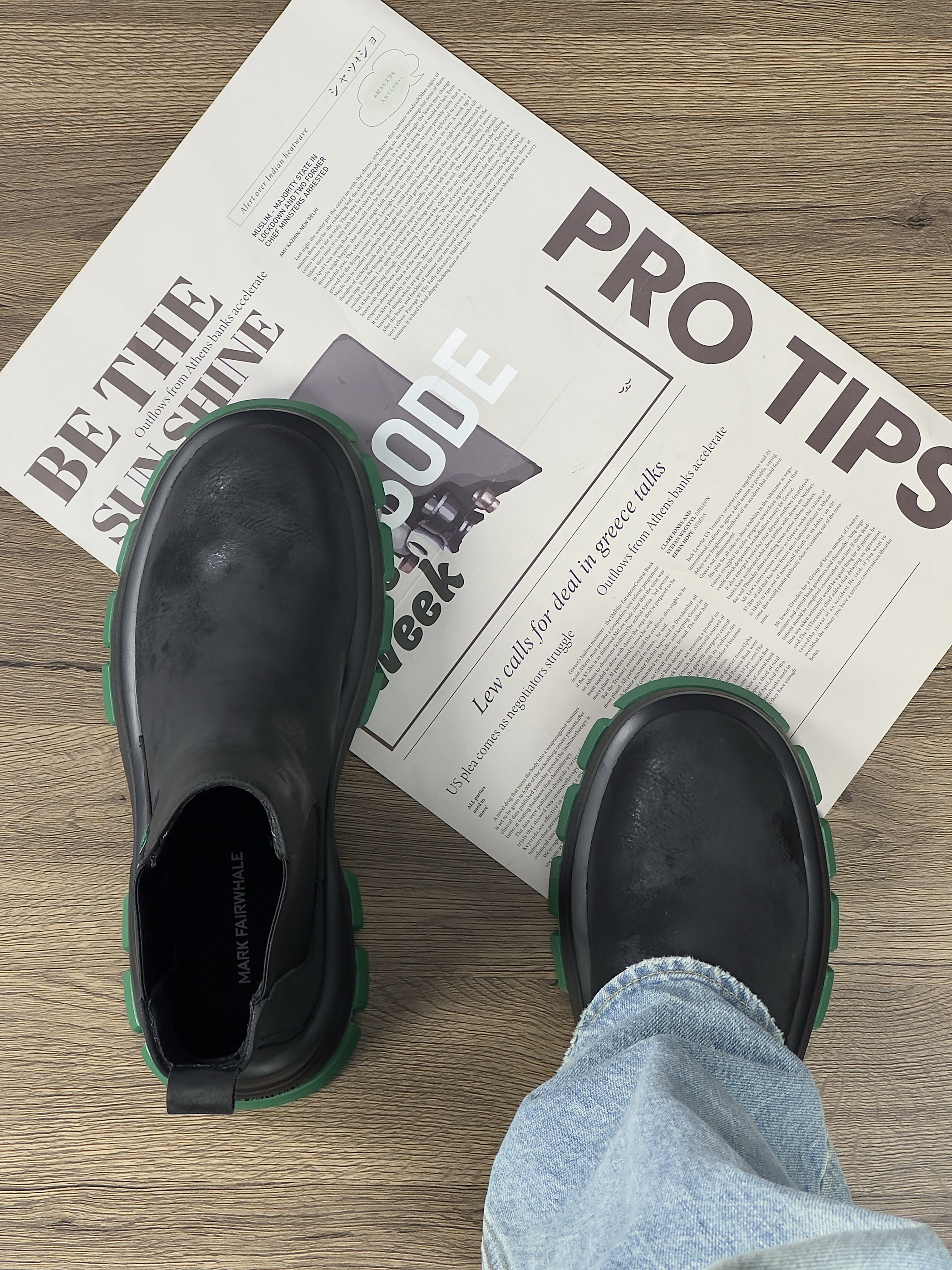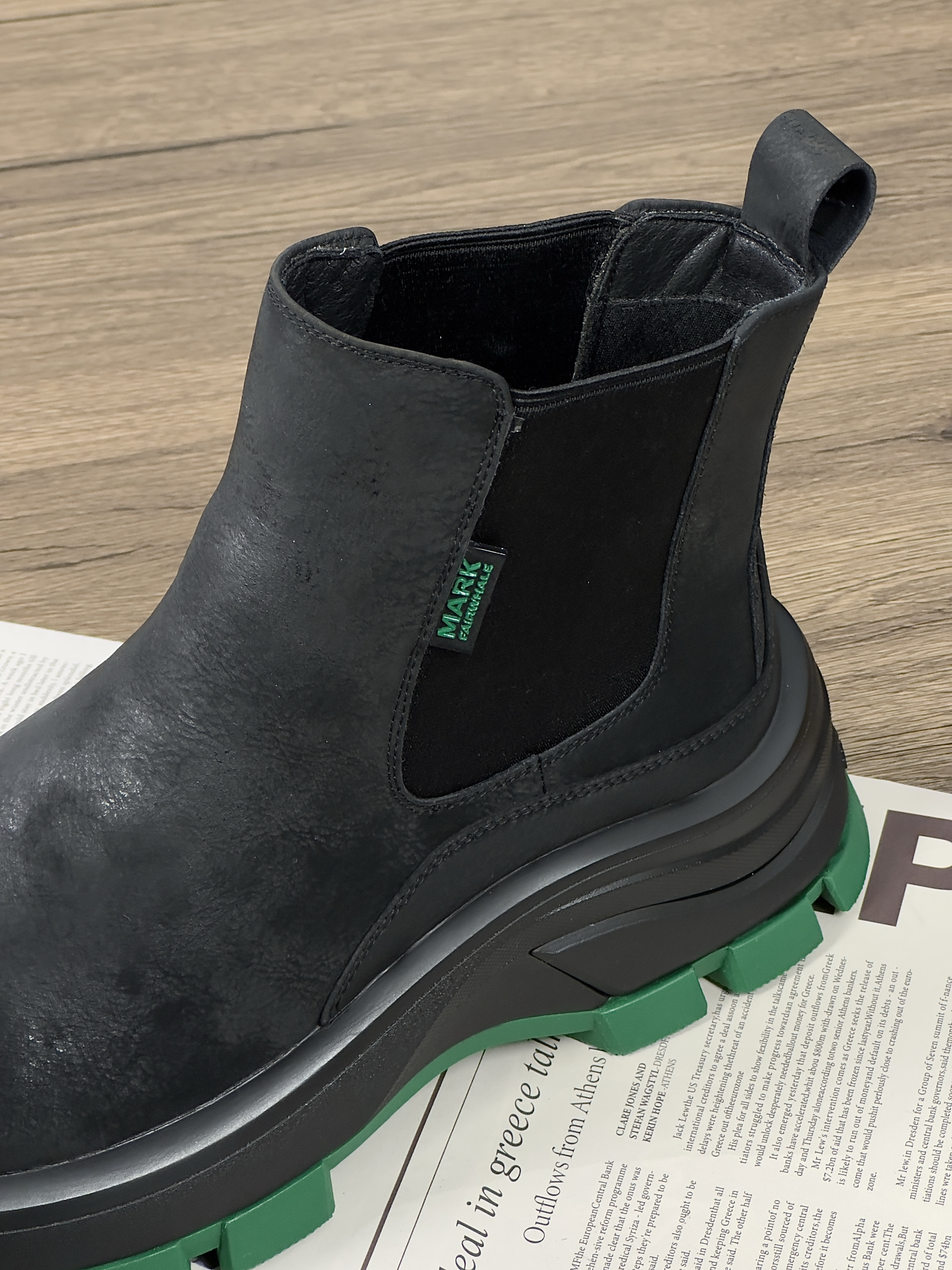 hello,这里是陈白羊🐑! 秋冬怎么能少得了靴子这类的单品 属实有被马克华菲这双切尔西靴帅到~ 磨砂质地反绒鞋面➕做旧的黑色系🖤 复古氛围稳稳拿捏了 搭牛仔裤吼吼看的说 而外底和细节处的绿色修饰 让整体更吸晴亮眼✨ 6cm的厚底 上脚舒适还很显腿长腿细