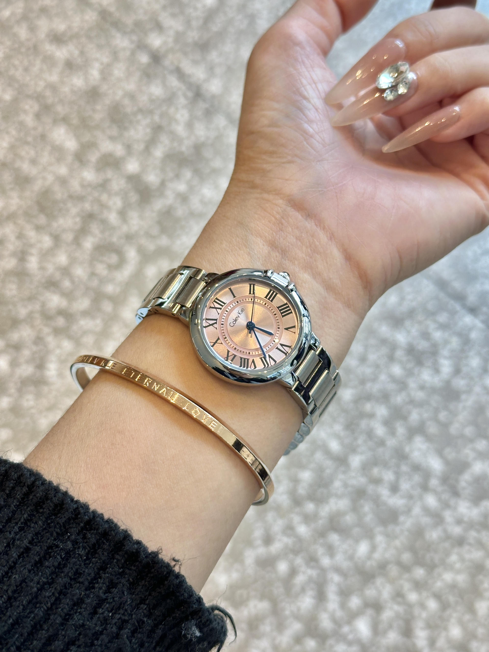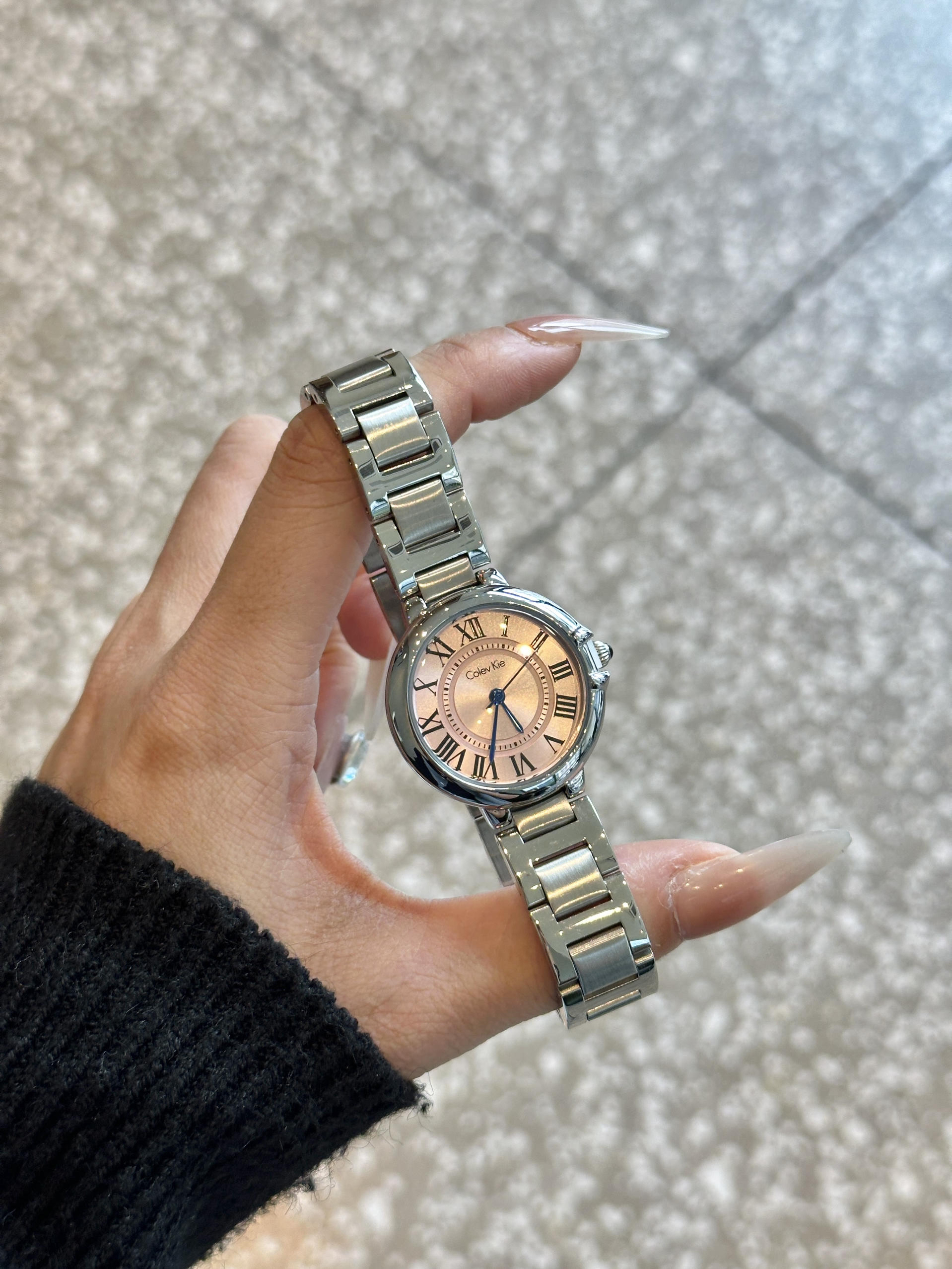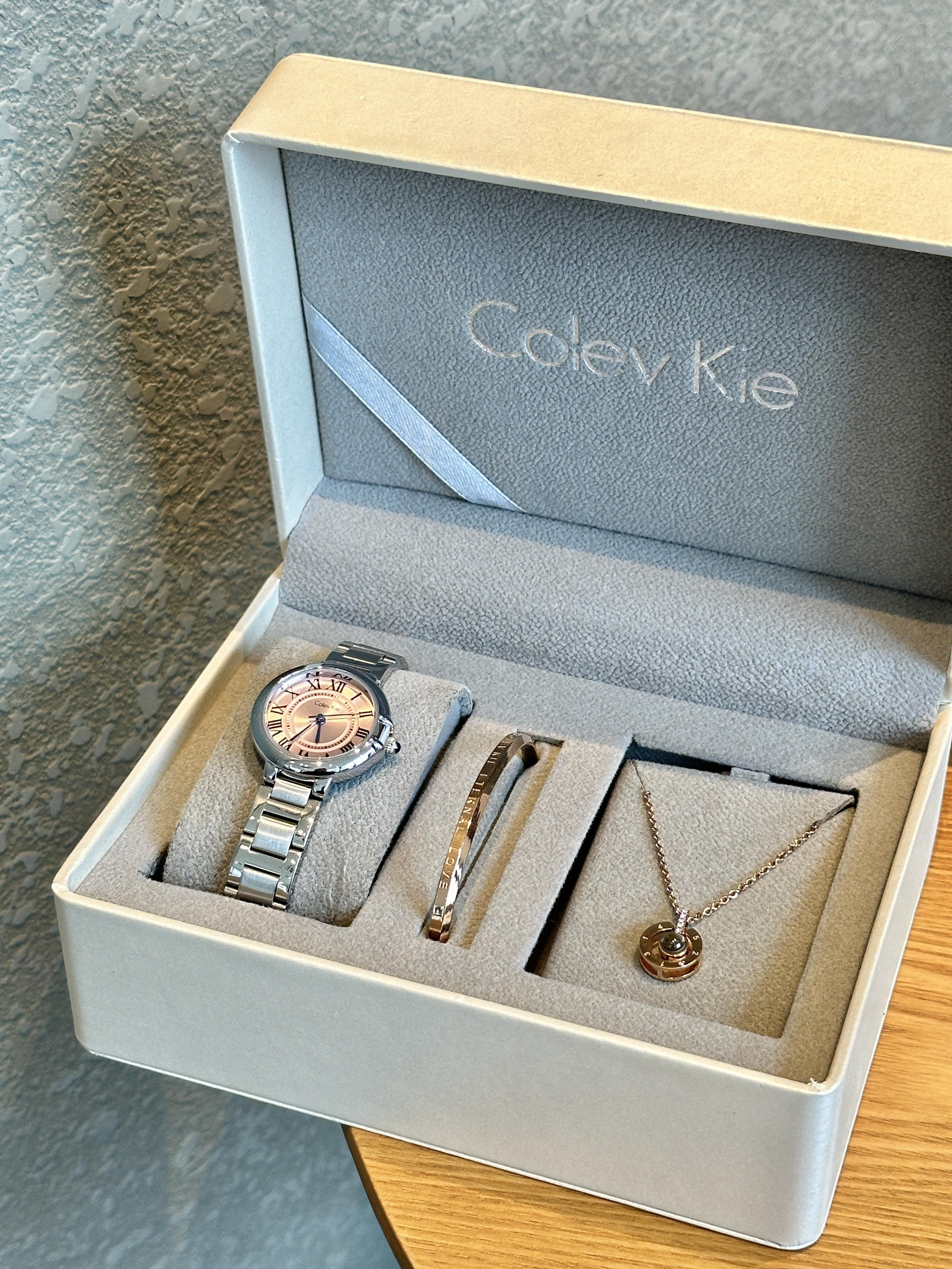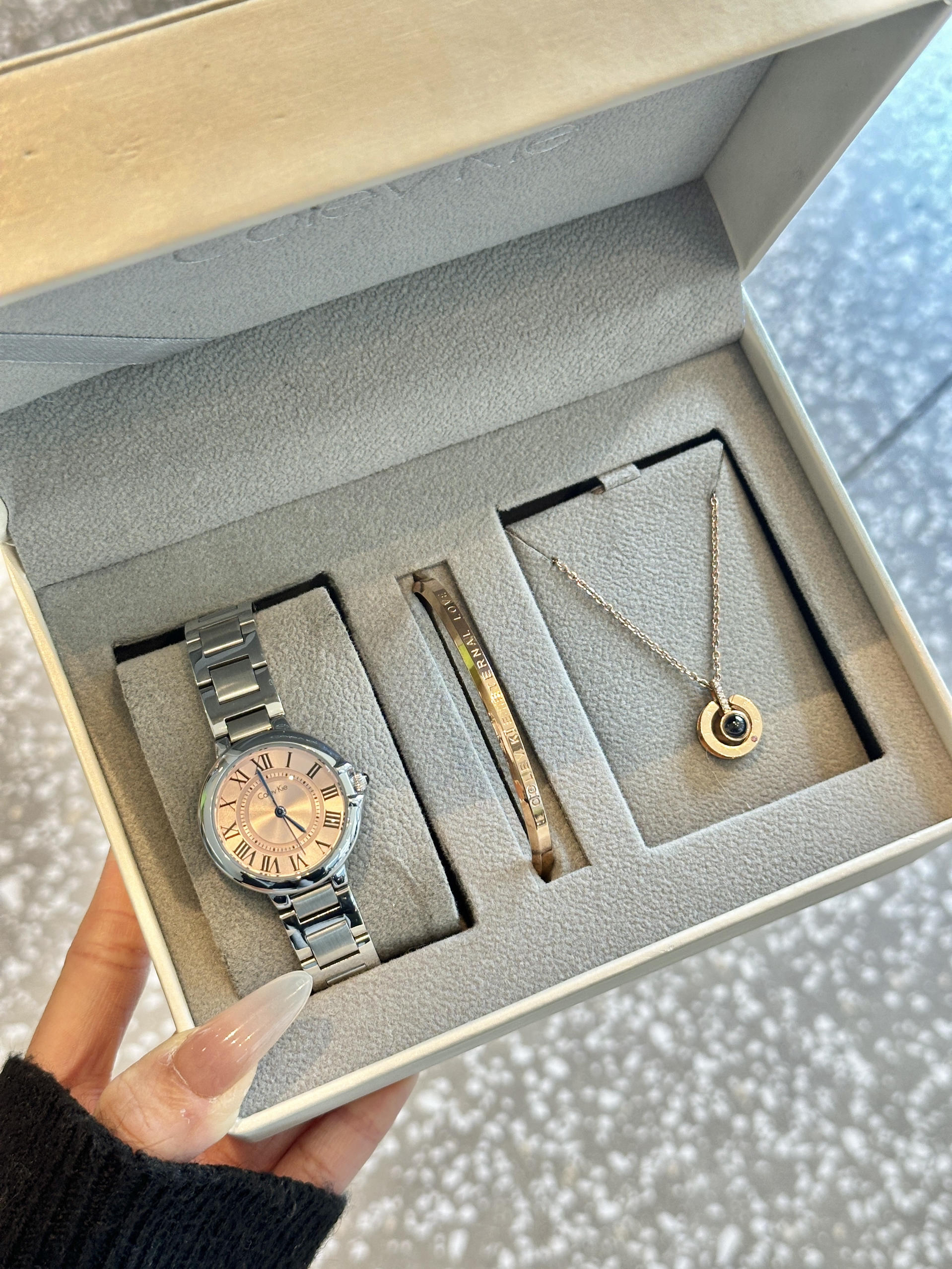 在社区发现了CK家的手表 还是礼盒三件套太划算了叭~ 手镯+项链都很piu亮✨ 粉色标盘外带罗马数字😙设计蛮帅哒 我觉得上学上班都猴猴看又百搭呀~