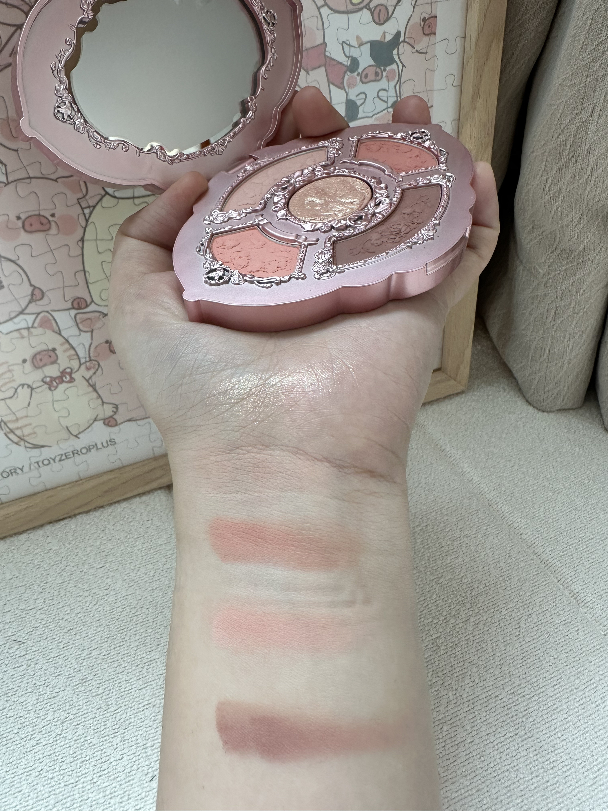 这个系列眼影这个最好看了 我觉得 官方说是蜜瓜粉杏盘 我本人比较喜欢浅粉色和杏色 出来感觉会比较俏皮 打底色过渡色都有了 加点珠光亮片~ 完美!