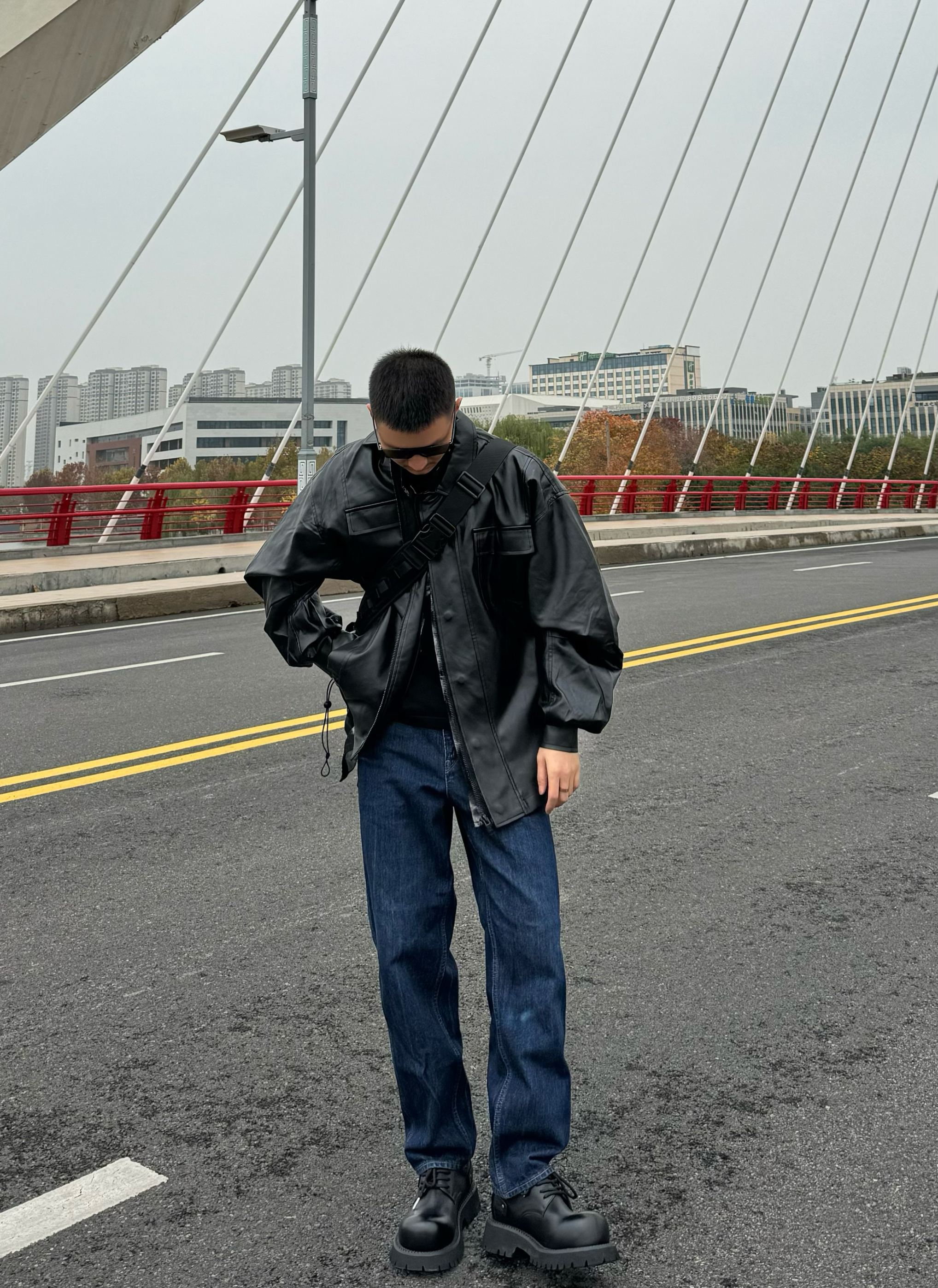 上身黑色皮衣外套 妥妥的酷飒代表 轻松拿捏街头感 宽松的设计 帅气十足~ 下身来一条复古牛仔裤 直筒设计 干净又百搭 再搭配一双黑色的德比鞋 脚感柔软轻便 小厚底的设计增高效果也很在线 通勤还是出街都是很不错的选择!