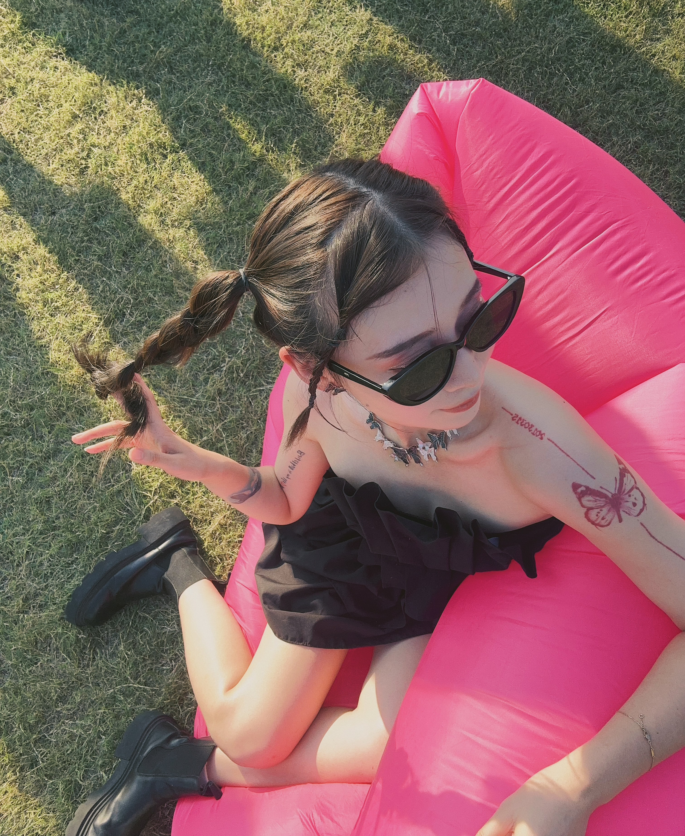 前段时间去的衢州音乐节 两小辫一扎 我就是最亮的仔 哈哈哈哈 蝴蝶项链太好搭了 深色系的口红也太酷了 永远自由!!