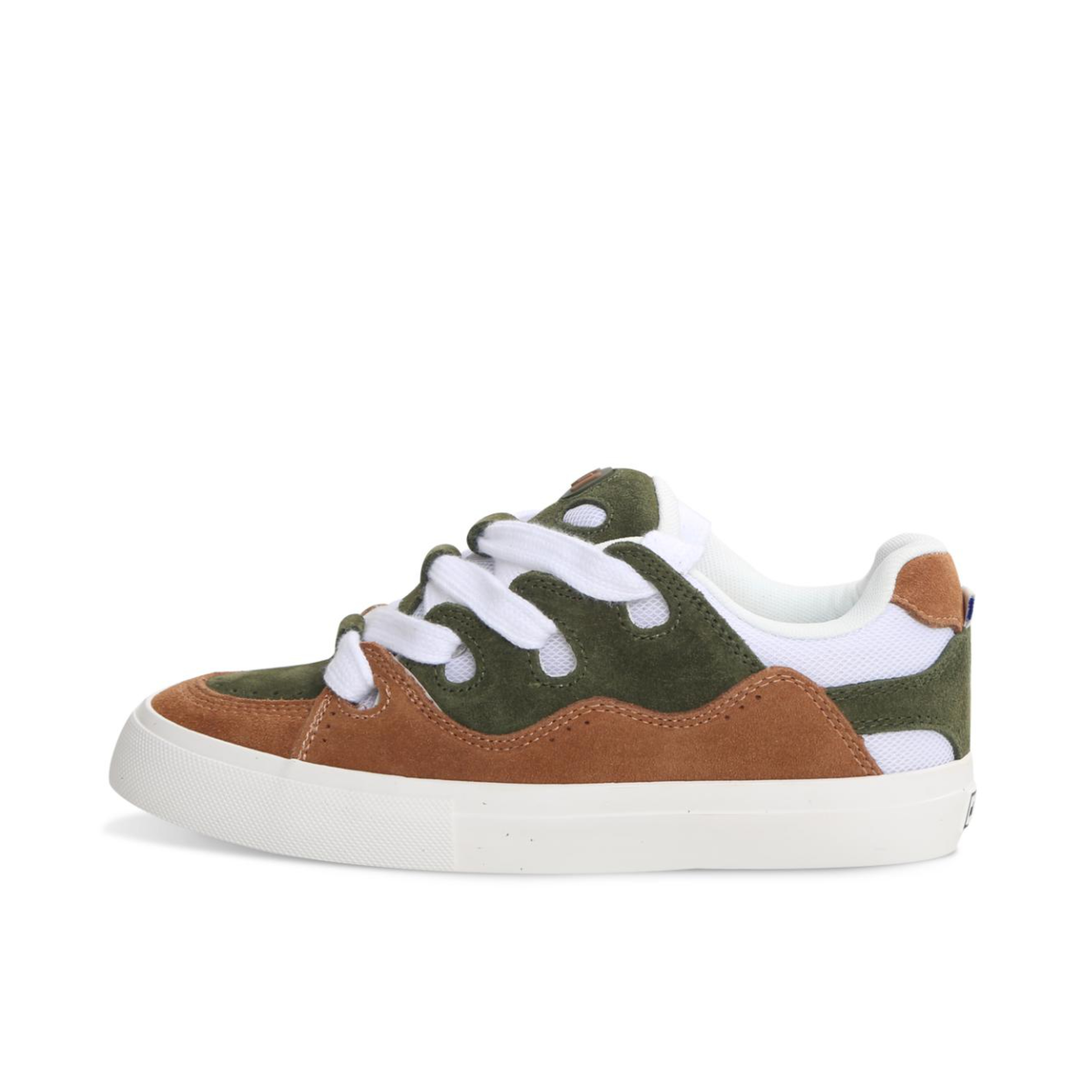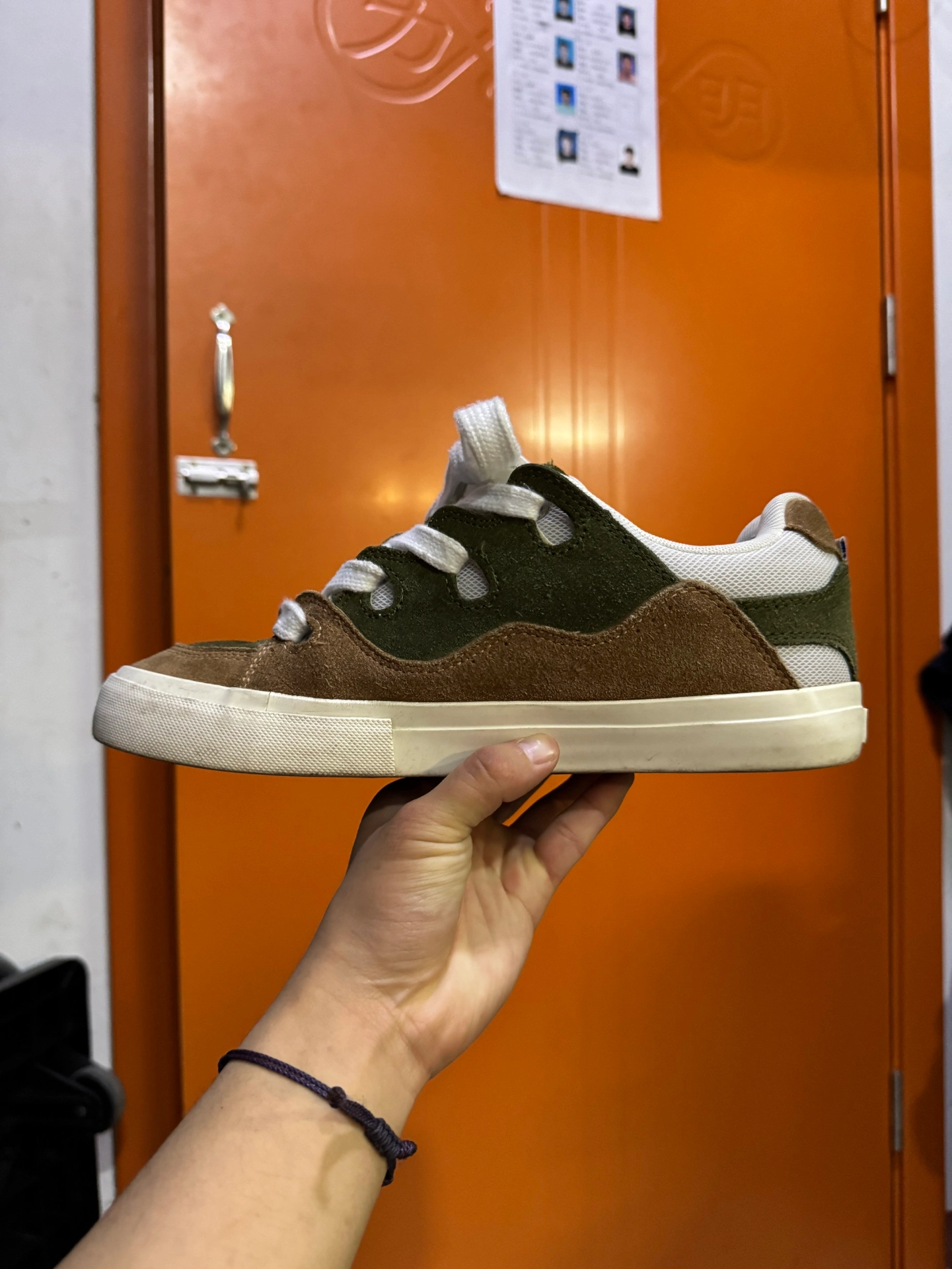 顽刻(ollieskate)棕绿配色的复古防滑耐磨低帮板鞋男女同款有以下特点: