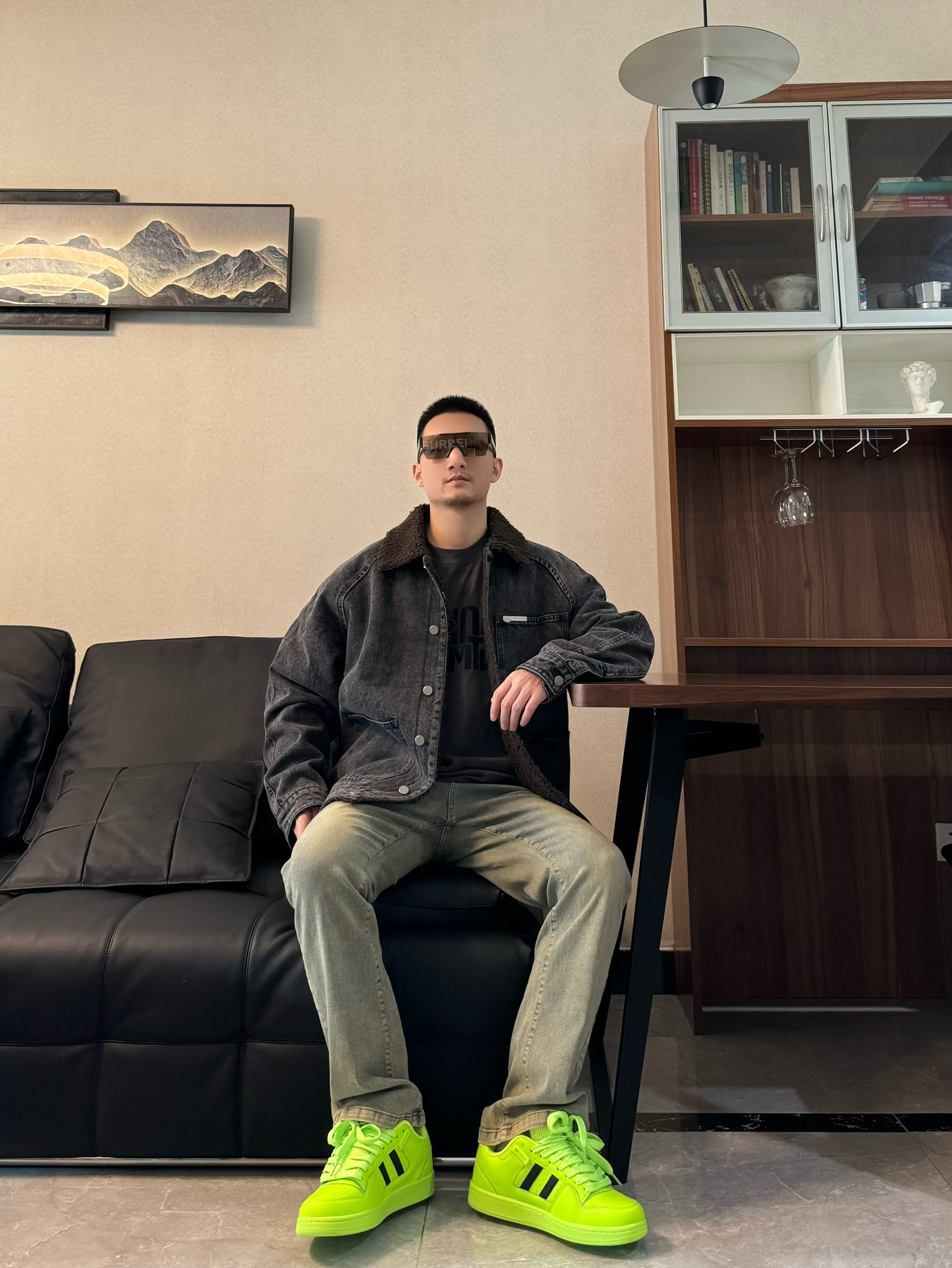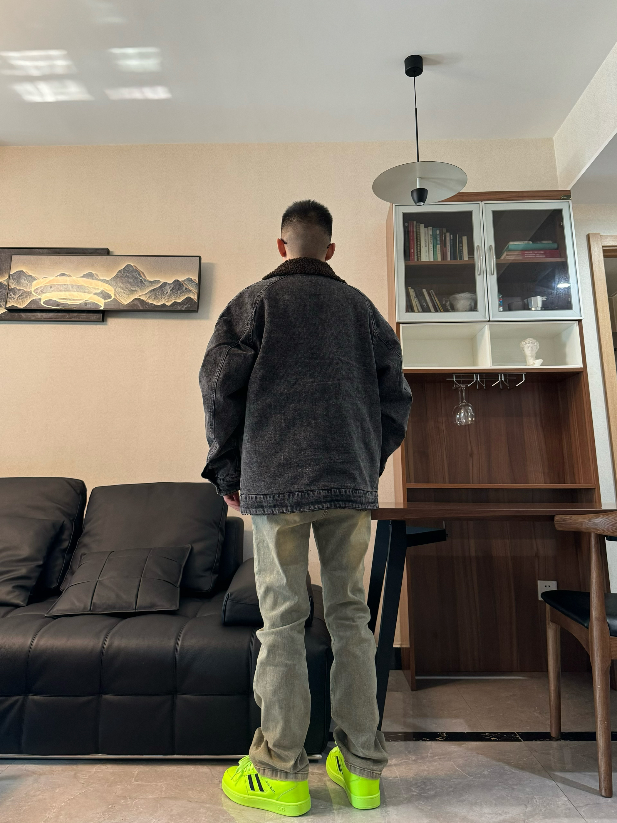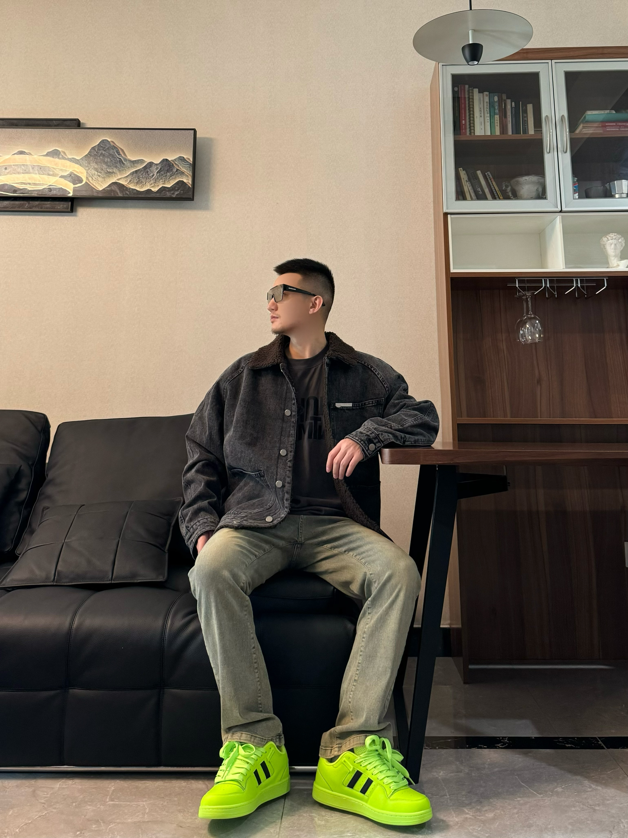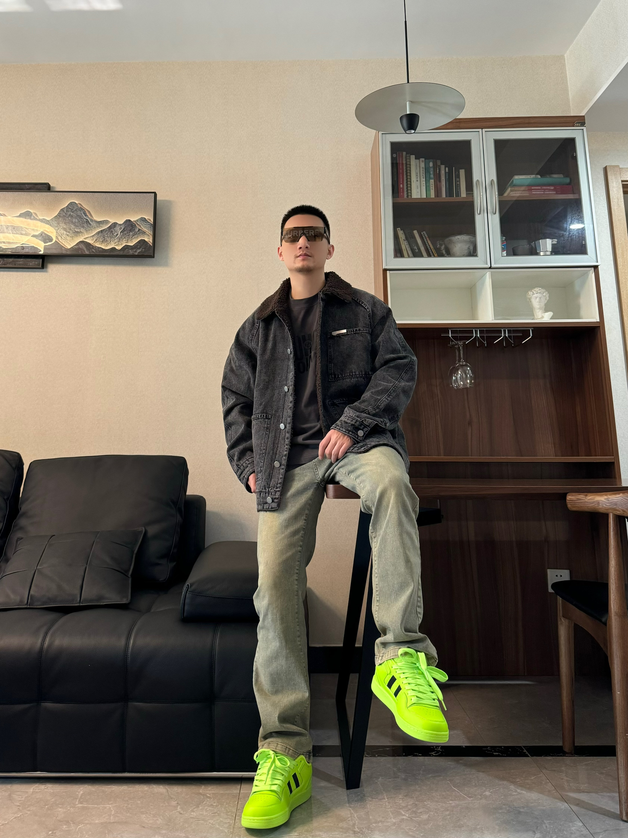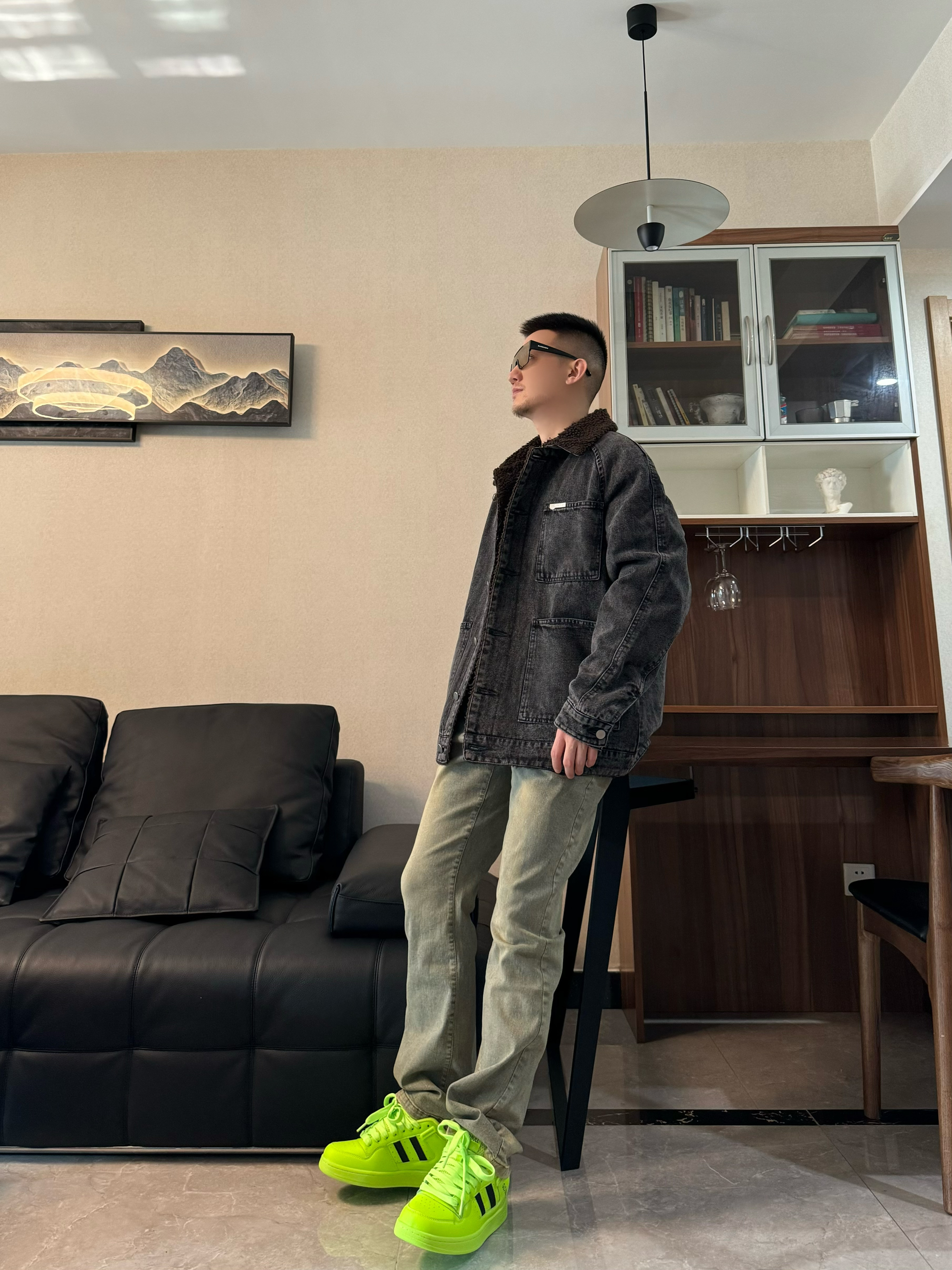 上身一件黑色牛仔夹克 cleanfit效果 帅气十足 内搭一件黑色打底 帅气又简约 下身搭配一条黄泥染的牛仔裤 面料舒适有弹性 在搭配一双面包板鞋 荧光绿配色高级感十足 鞋舌加厚 包裹感很不错 上脚嘎嘎帅气 跟今天的穿搭很适配哦 帅气出门吧!