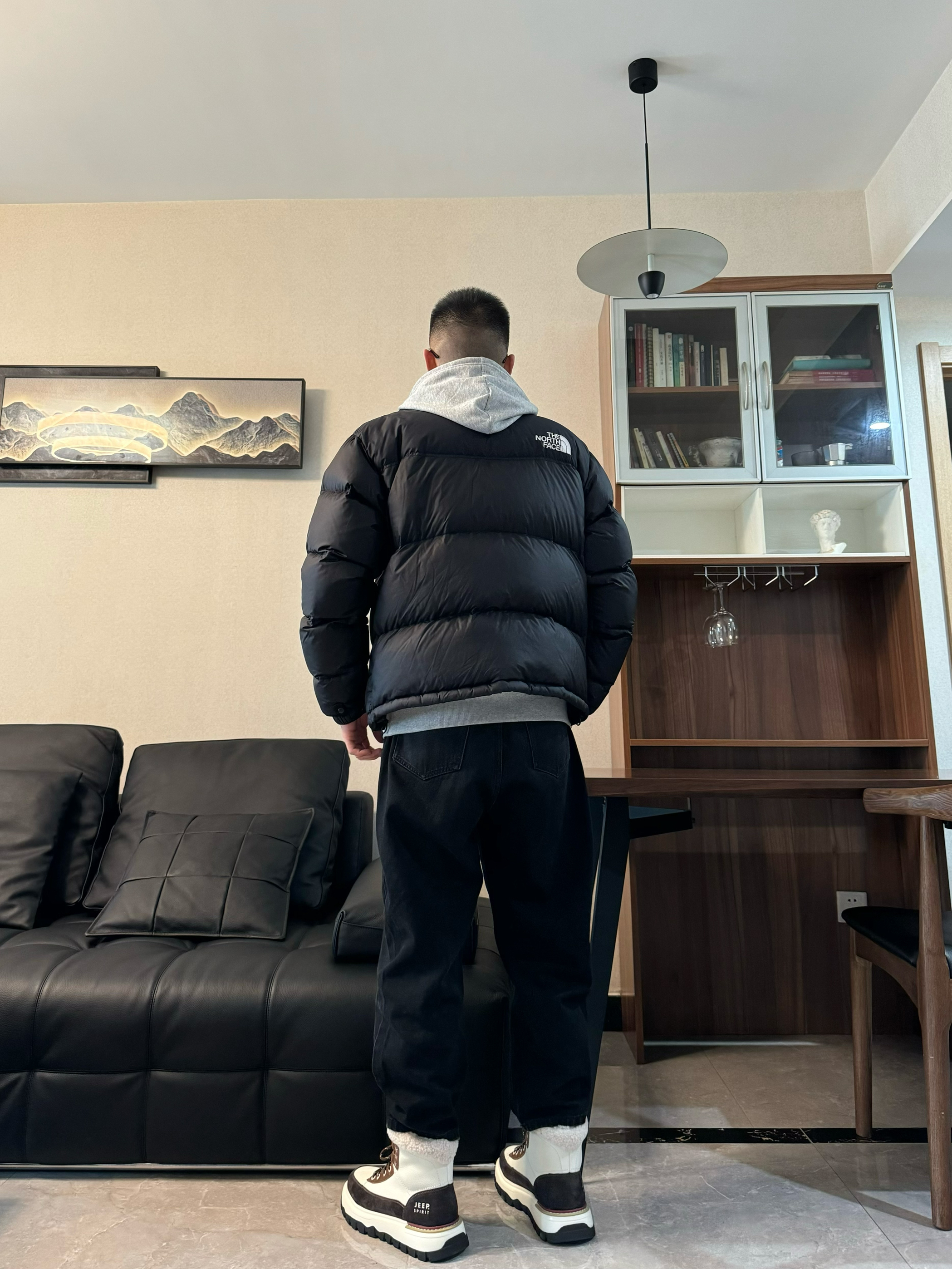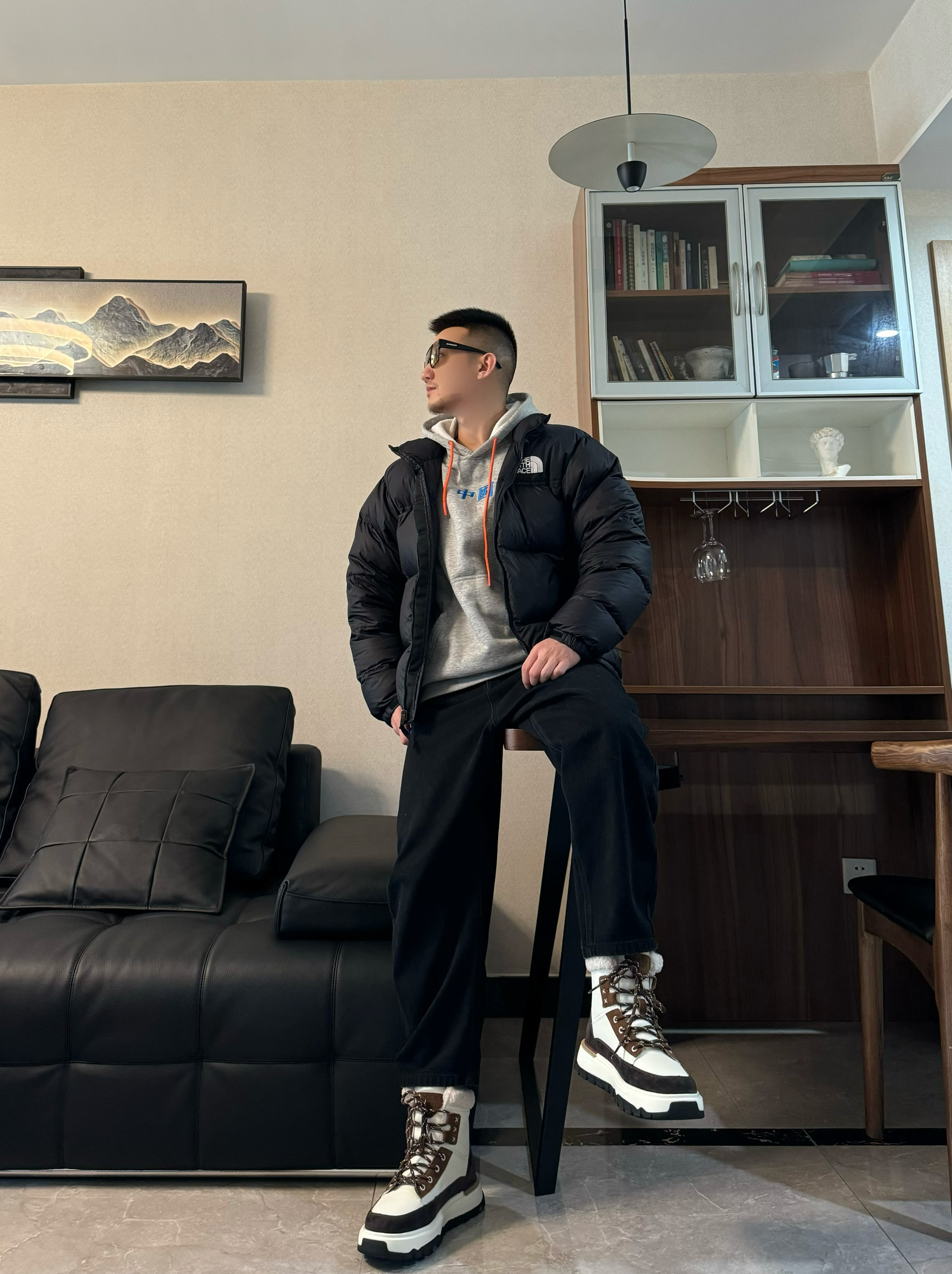 上身是黑色面包羽绒服 短宽的设计不显高显瘦 下身搭配一条黑色长裤 直筒宽松设计 时尚百搭 再搭配一双雪地靴 脚感柔软舒适高帮内衬加绒加厚 保暖效果嘎嘎在线 小厚底的设计增高效果也很在线哦 帅气出门吧!