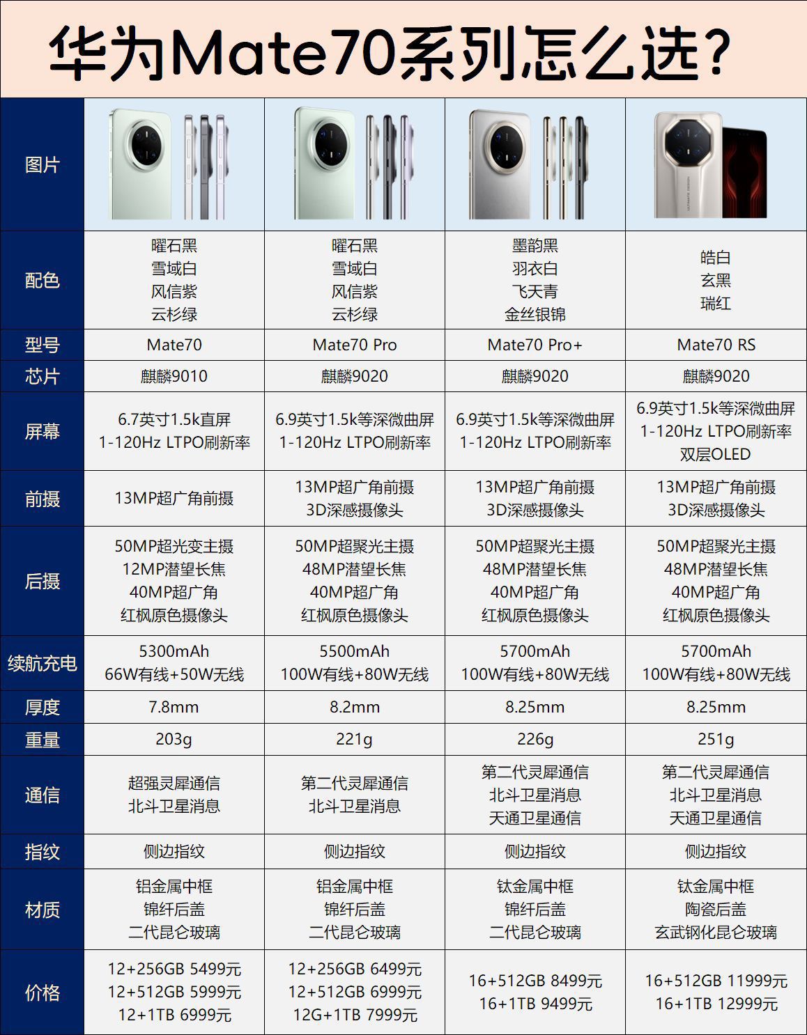 简单说一下几款的区别: ①标准版处理器是麒麟9010,其他是9020; ②屏幕标准版是6.7英寸直屏,其他是6.9英寸曲屏,RS版本有双层OLED技术; ③标准版没有3D人脸; ④Pro版传感器是RGGB,Pro+版传感器是RYYB; ⑤材质方面,标准版和Pro是铝金属中框,Pro+和RS是钛金属,只有RS是陶瓷后盖; ⑥其他还有就是充电续航和通信方面的差异。 另外全系是侧边指纹,这个不知道大...