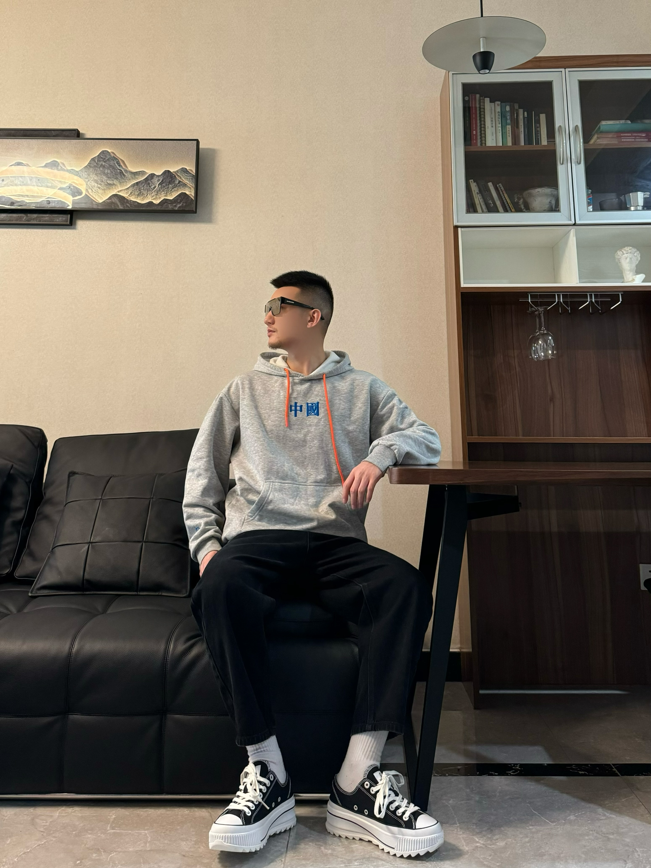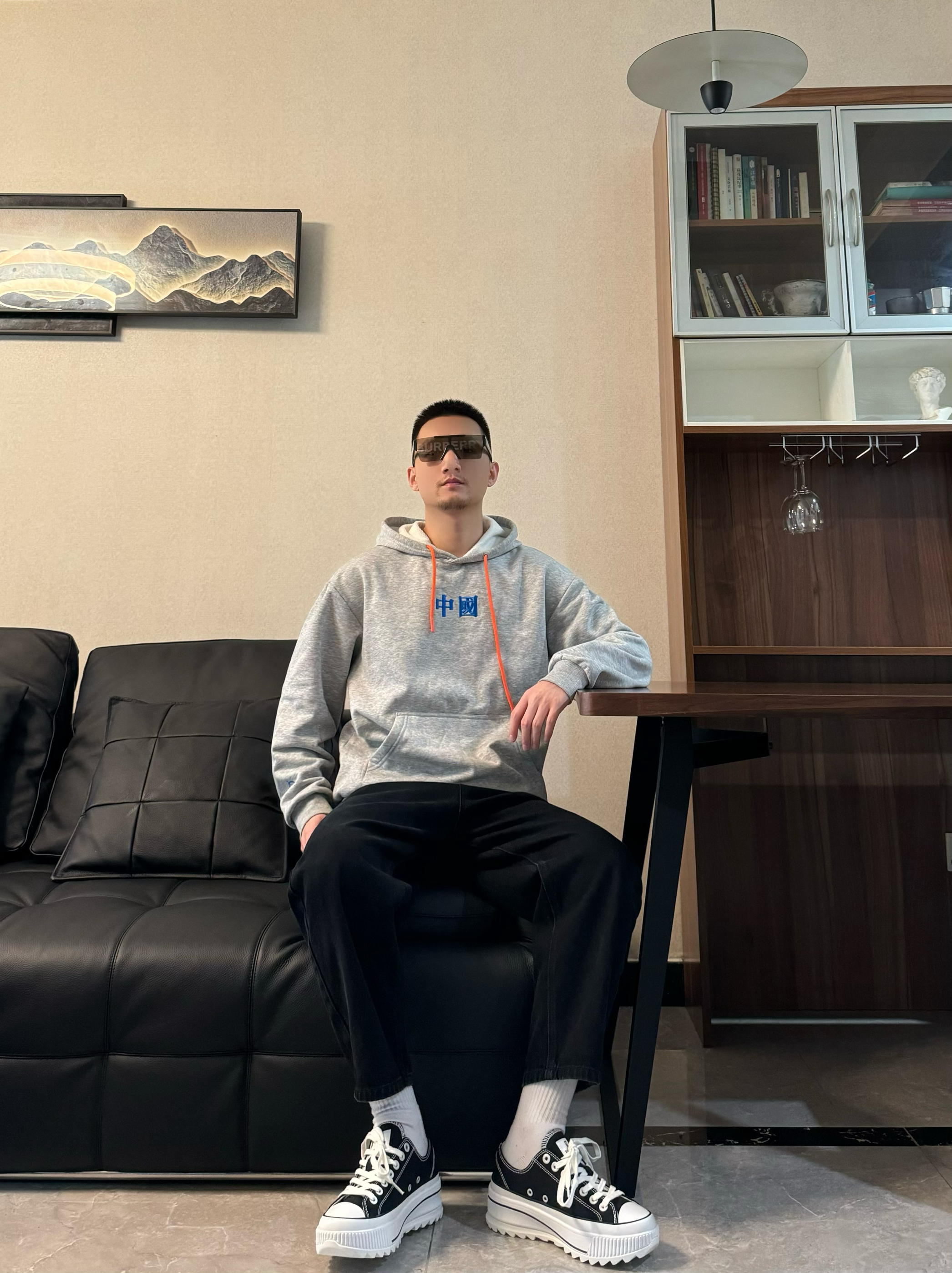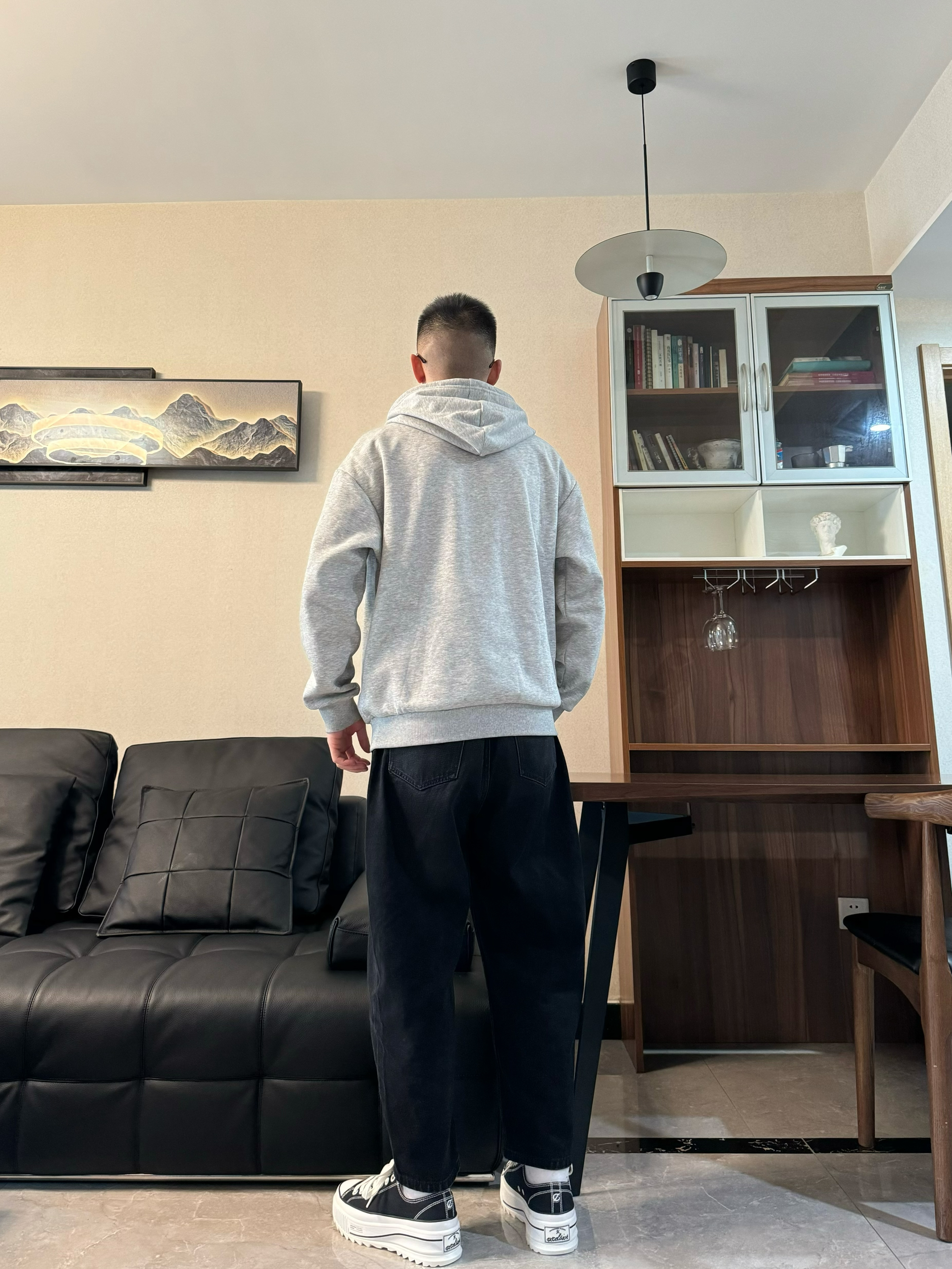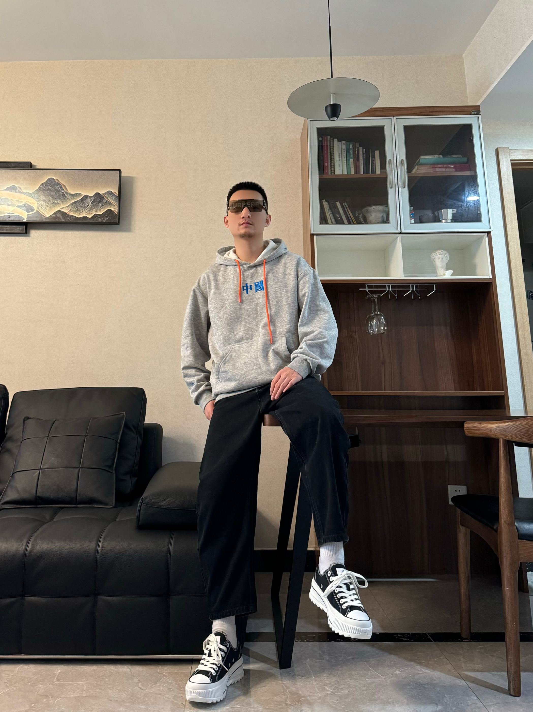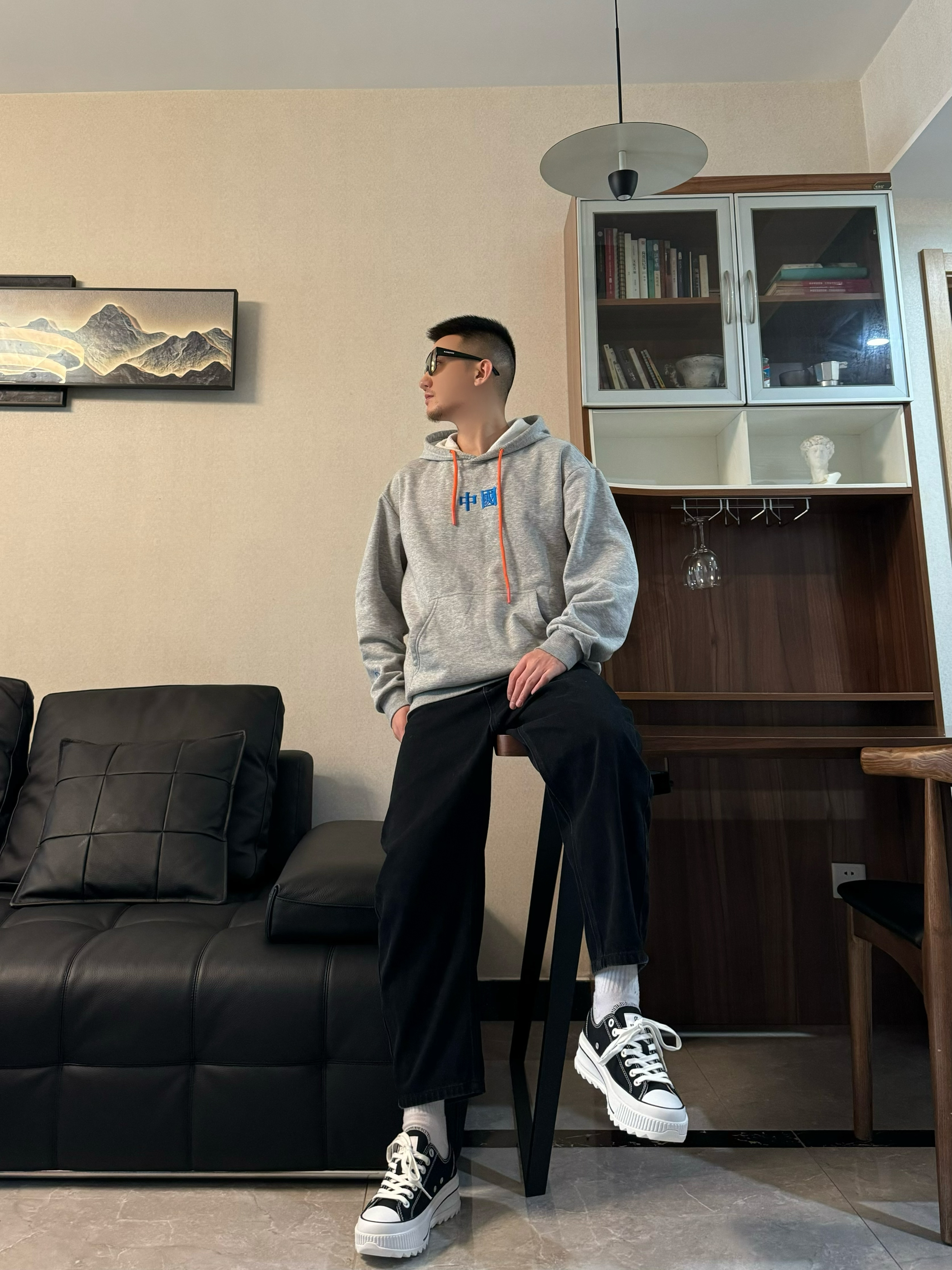 上身穿的是一件灰色的卫衣 宽松版型 松弛感一下子就上来了~ 下身搭配的是一条牛仔裤 纯色设计 时尚百搭 再搭配一双饼干鞋 帆布的材质经典时尚 鞋底防滑耐磨 脚感柔软舒适 整体设计感十足出街回头率稳稳拿捏住啦!