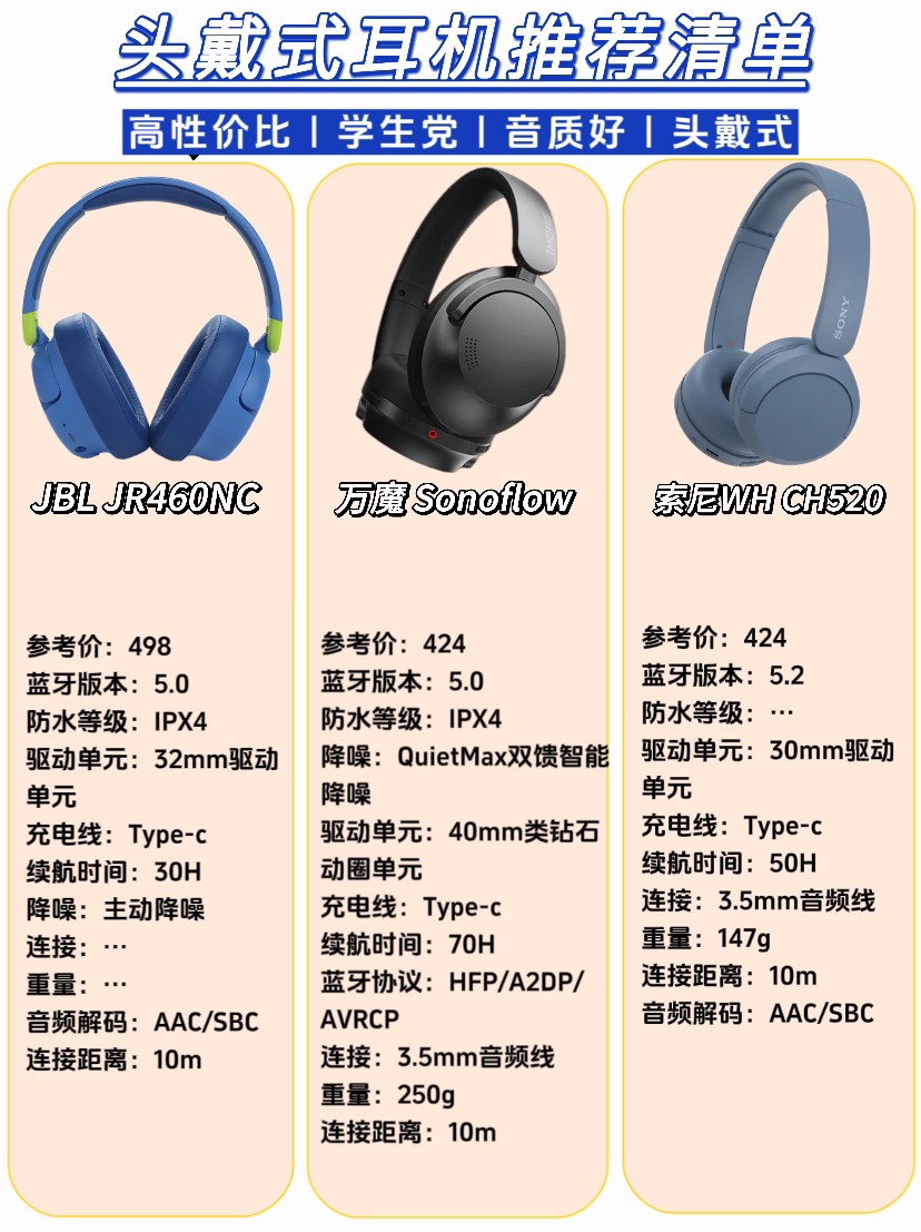 本篇笔记关联了SENNHEISER/森海塞尔 HD 450BT 头戴式 无线 耳机 包耳式 低噪 主动降噪 蓝牙 高保真 高音质 封闭 折叠 黑色、JBL JR 460NC 头戴式 蓝牙 耳机 大耳包 主动降噪 沉浸式 听音乐 网课 学习 护耳 蓝色、1More/万魔 SonoFlow HC905 头戴式无线蓝牙耳机 主动降噪 双金标认证 相似 超强音质 超长续航 HIFI 通话 黑色等商品,为用户提供真实的使用体验和购买参考。