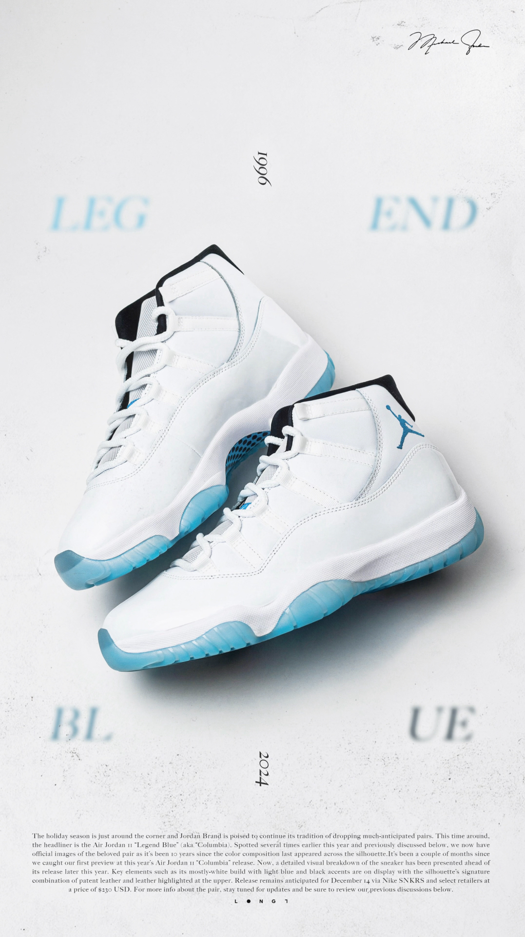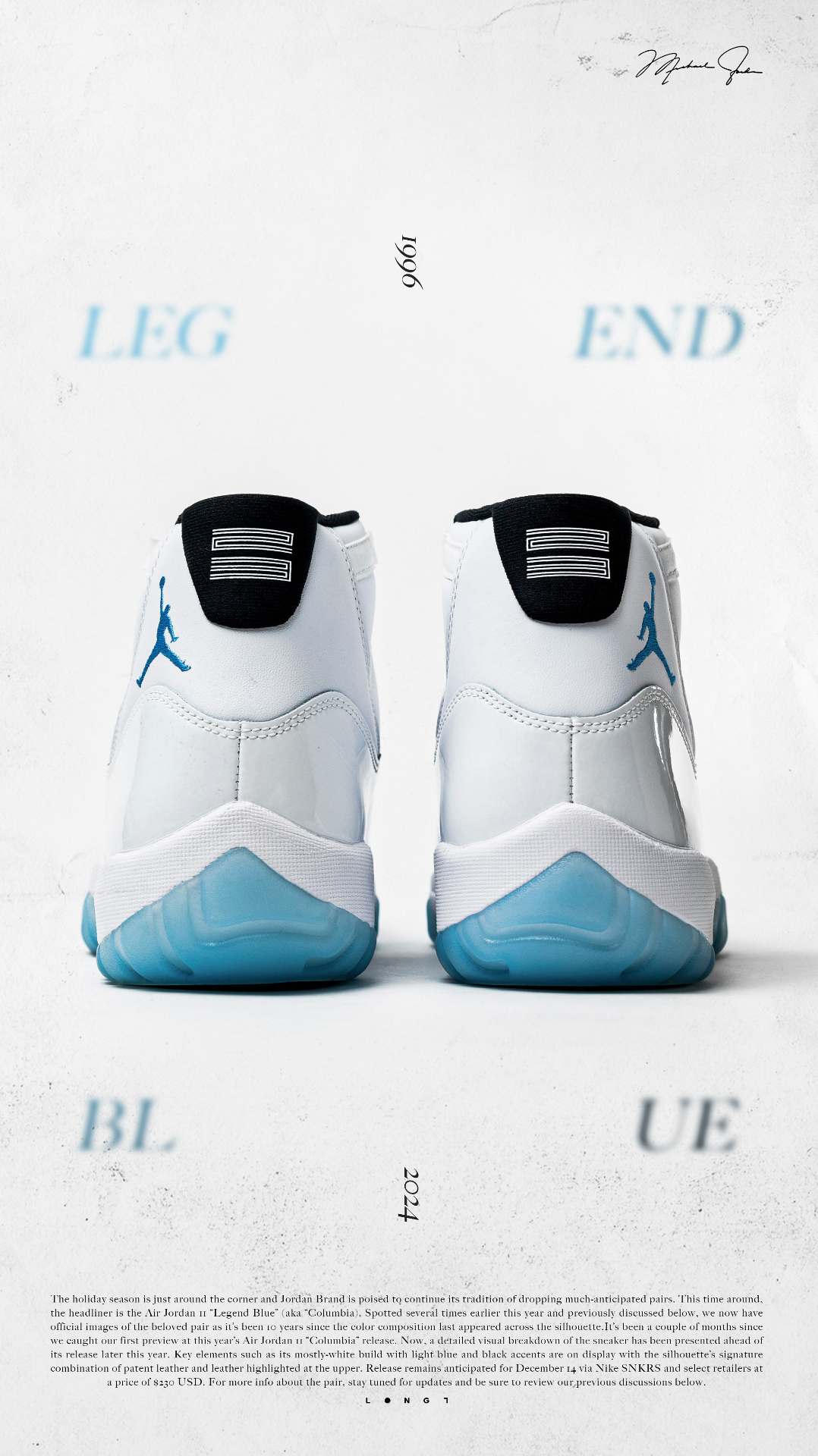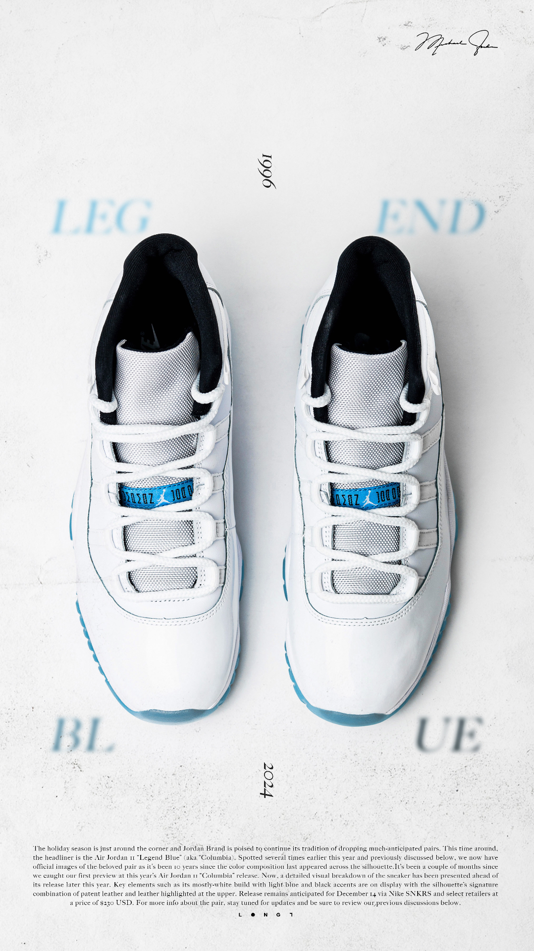 💦直面传奇💦 👟:Air Jordan 11 “Legend Blue” Michael Jordan于1996年圣安东尼奥全明星正赛上脚的“Columbia ”配色再次迎来复刻,鞋型依旧延承近年来的元年版本,通体雪白的鞋身搭配那一抹挥之不去的哥伦比亚蓝,助力MJ在那一年再次捧起全明星正赛MVP,并最终于当赛季取得了72胜10负的傲人战绩以及复出后的第一枚总冠军戒指,用实力诠释了不是每种蓝色都...