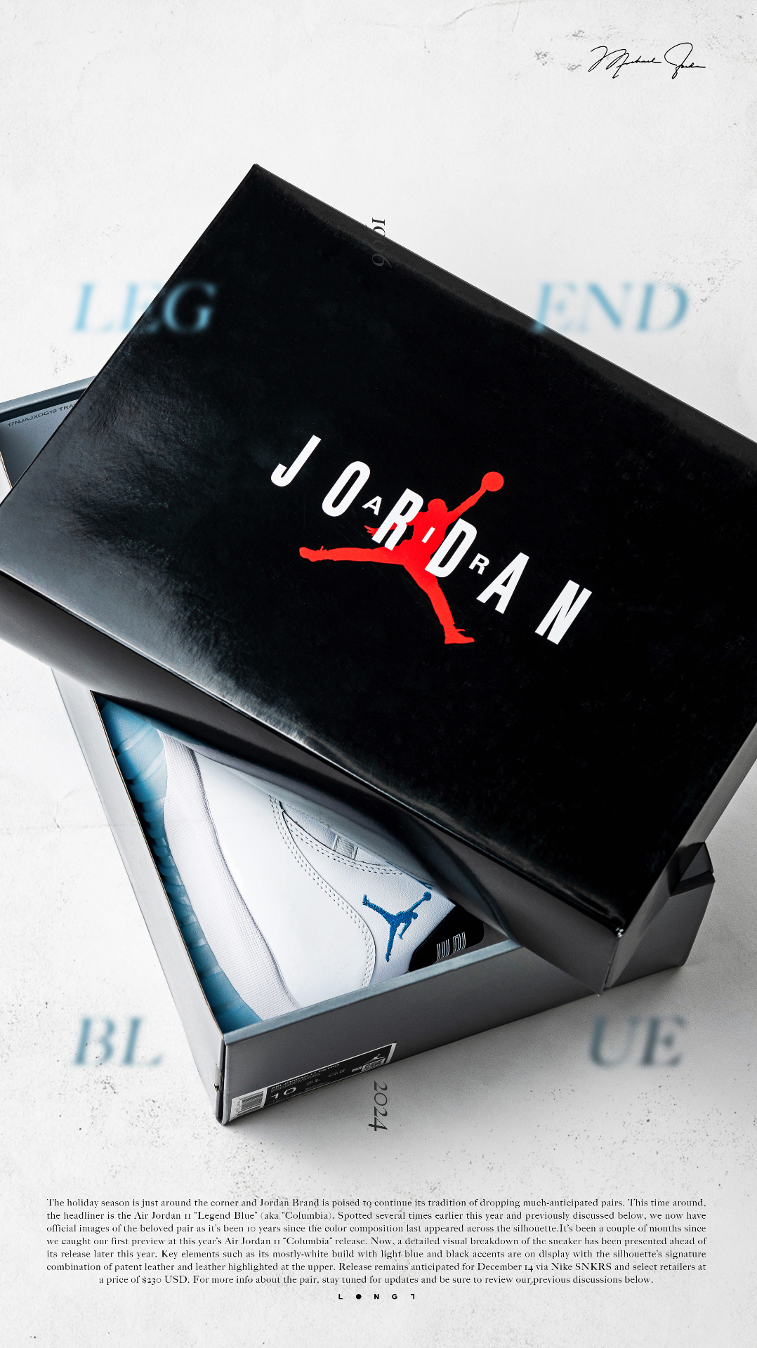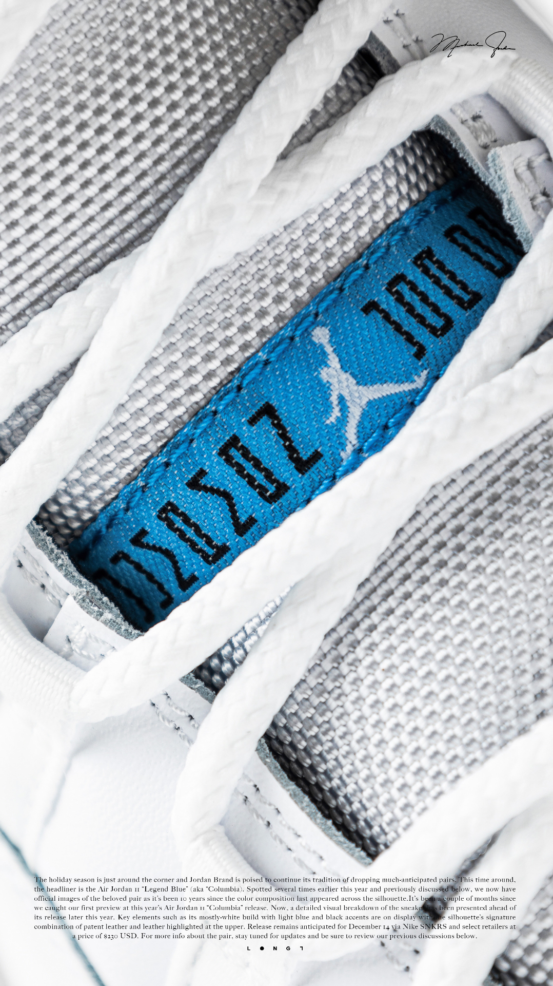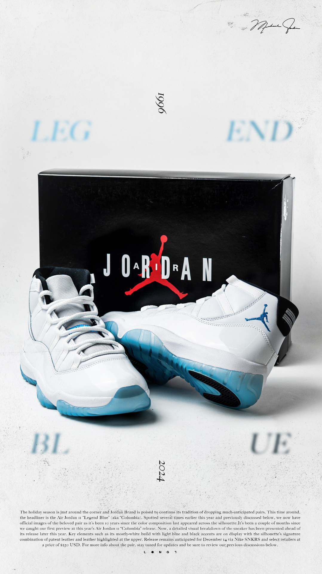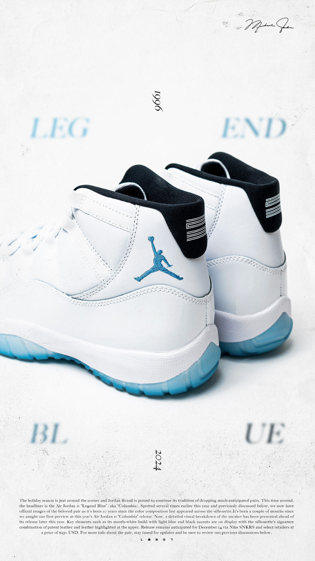 💦直面传奇💦 👟:Air Jordan 11 “Legend Blue” Michael Jordan于1996年圣安东尼奥全明星正赛上脚的“Columbia ”配色再次迎来复刻,鞋型依旧延承近年来的元年版本,通体雪白的鞋身搭配那一抹挥之不去的哥伦比亚蓝,助力MJ在那一年再次捧起全明星正赛MVP,并最终于当赛季取得了72胜10负的傲人战绩以及复出后的第一枚总冠军戒指,用实力诠释了不是每种蓝色都...