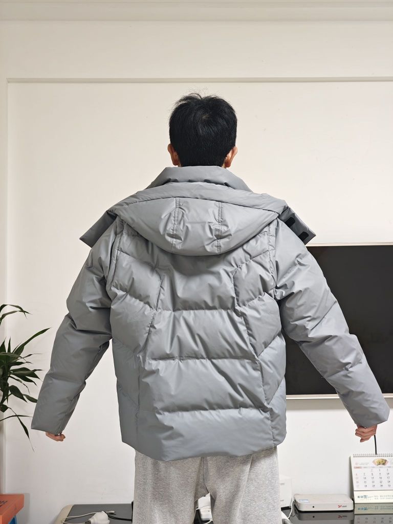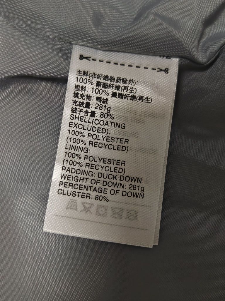 这款羽绒服一眼就相中了,款式太喜欢了, 羽绒服+马甲,刺绣标,灰色恰到好处。 奈何我本人偏瘦,大宽松版型,177,120斤上身S码都显肥。 鸭绒,S码充绒量281克, 绒子含量80%差点意思,这都啥年代了,90%的绒子含量基本都普及了好吧! 要不是相中版型,我都不考虑80绒子含量的。 充绒量比较高,保暖性没的说! 下摆有抽绳,口袋无拉链。 吊牌我拍了,这款是雪中飞代工的。