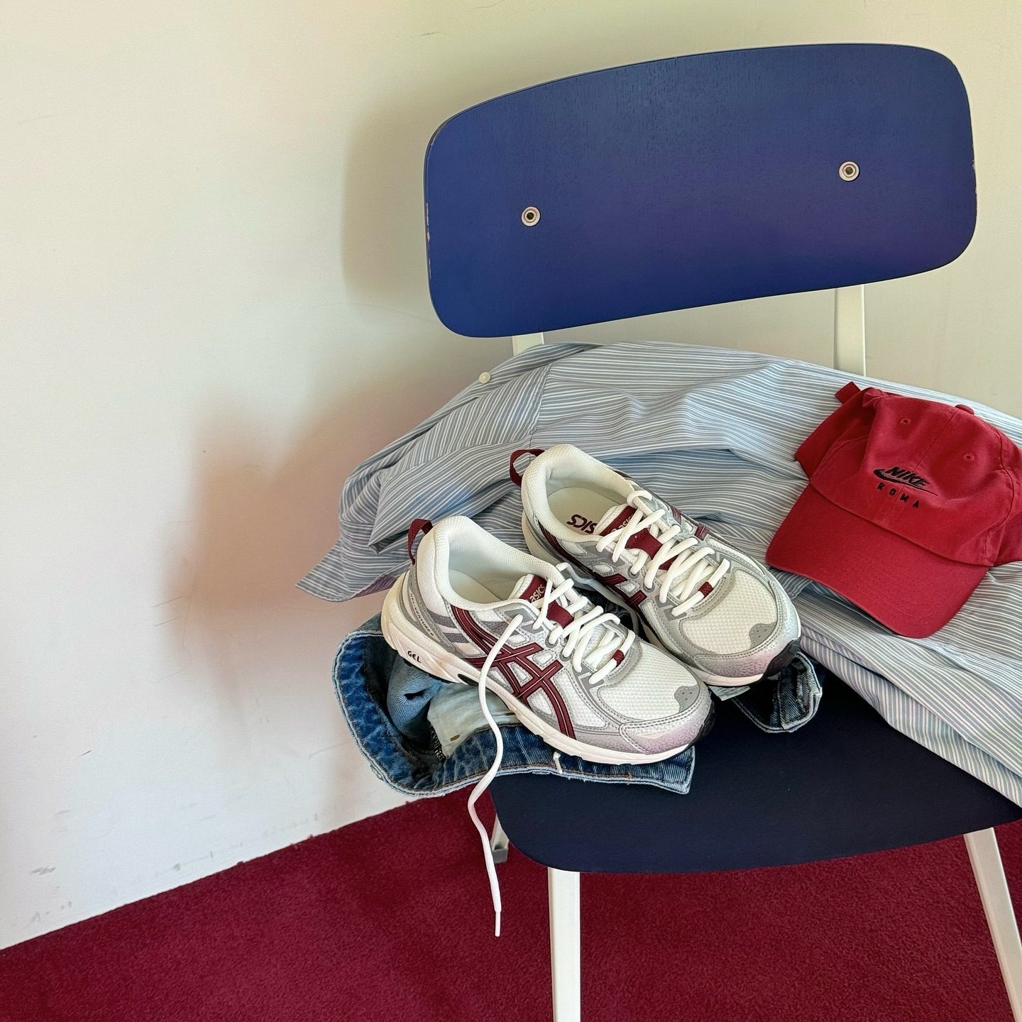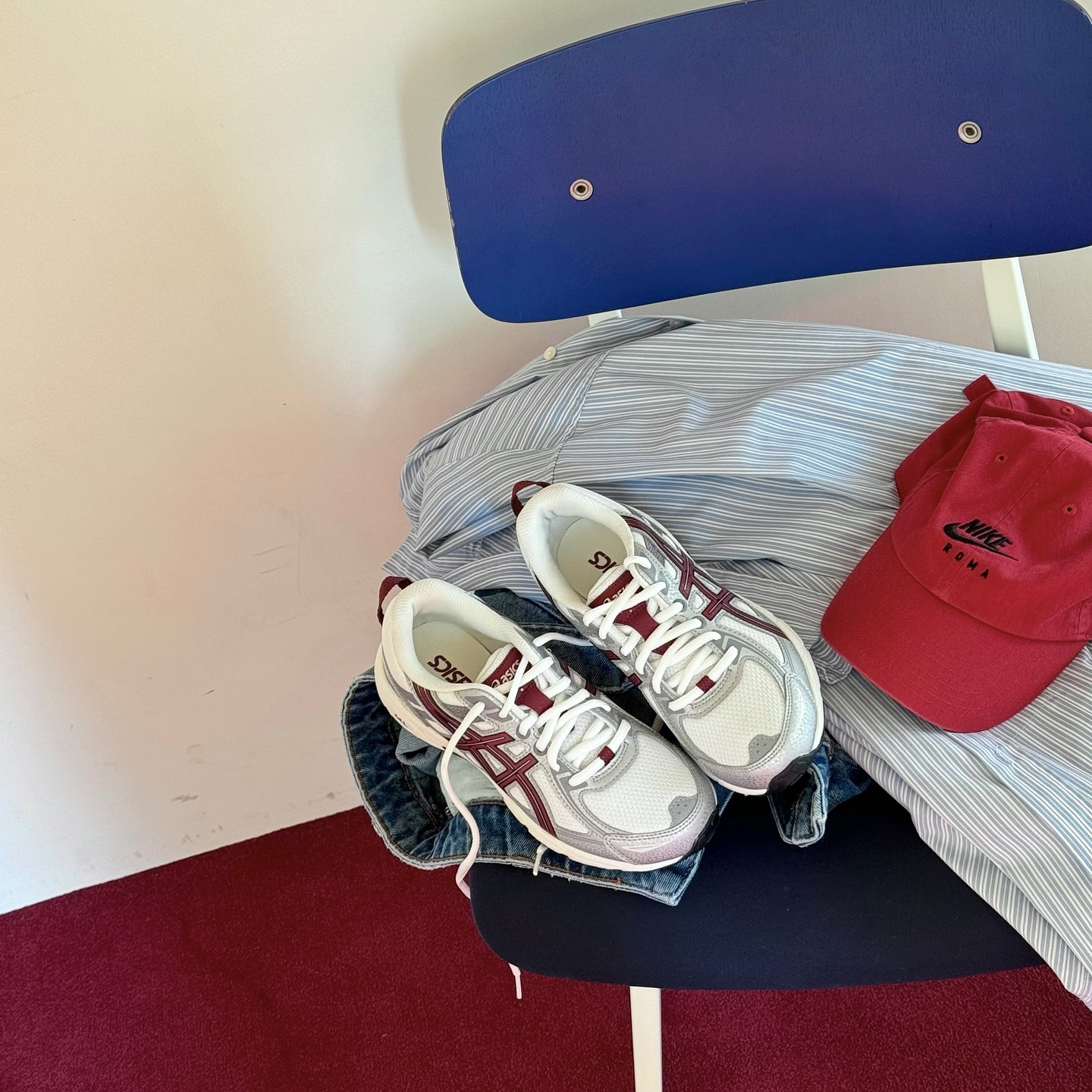 亚瑟士的新款,真的太可了! 银白加上暗红色的线条,复古运动风,配上牛仔裤,直接帅晕!