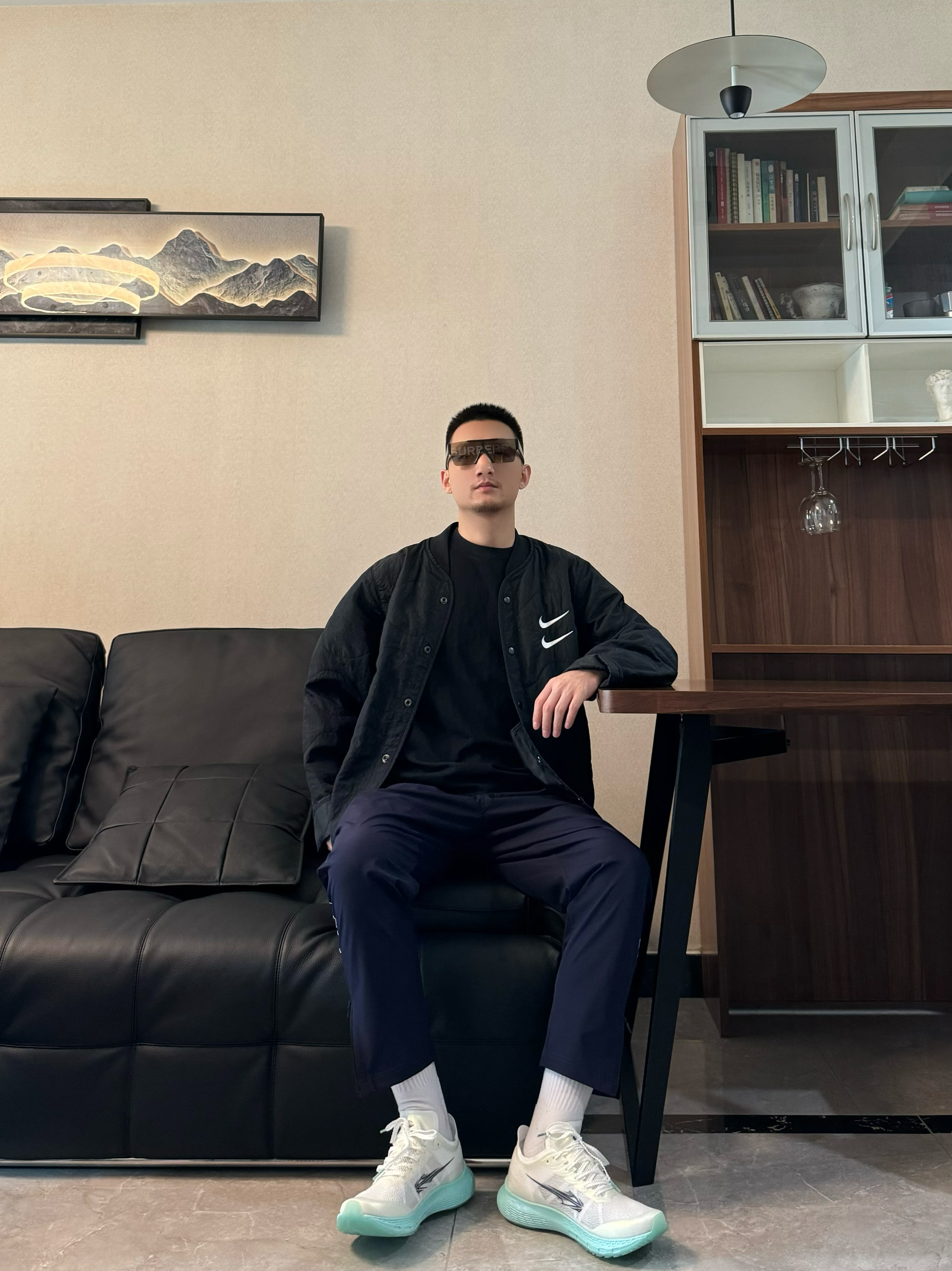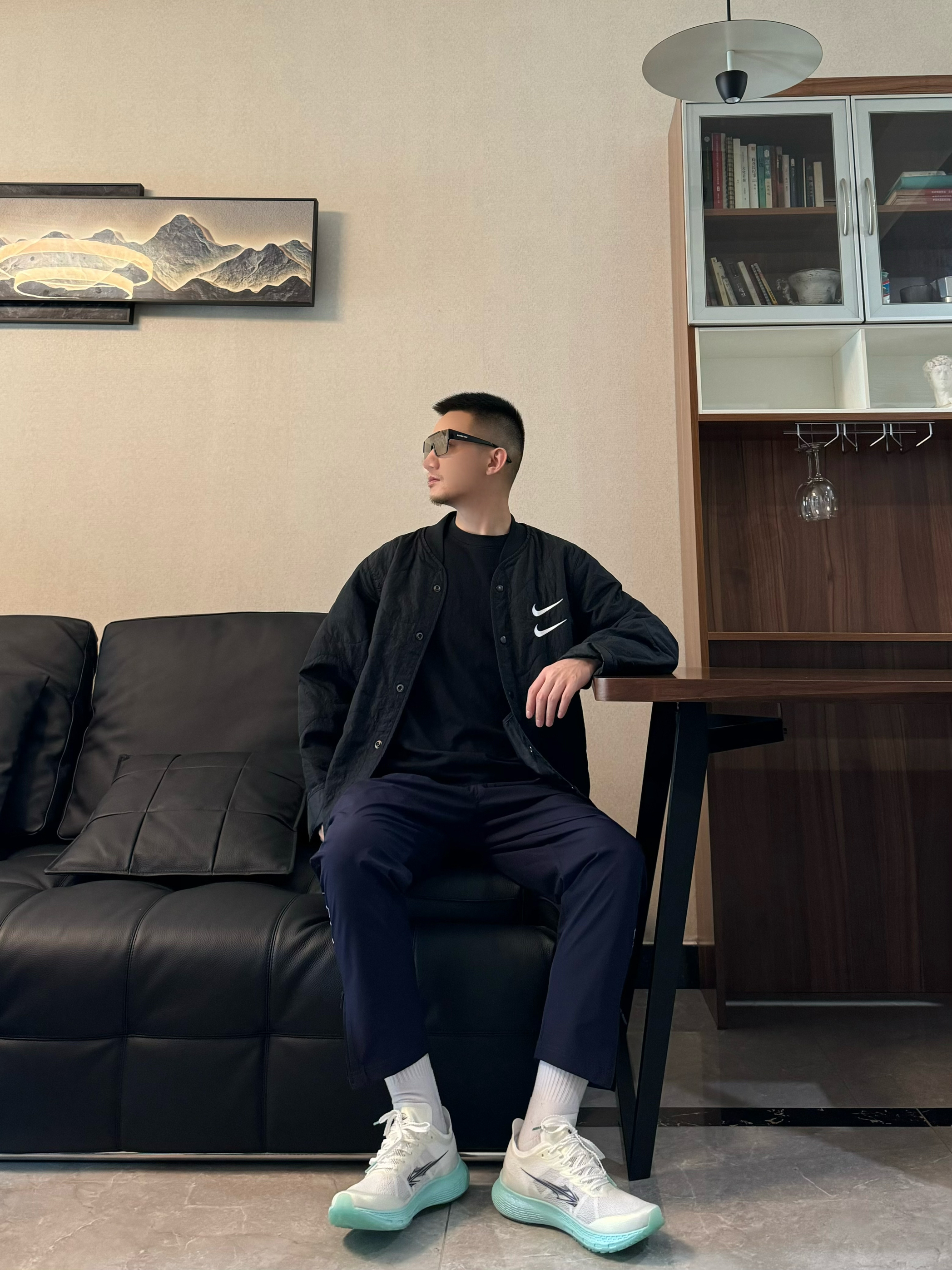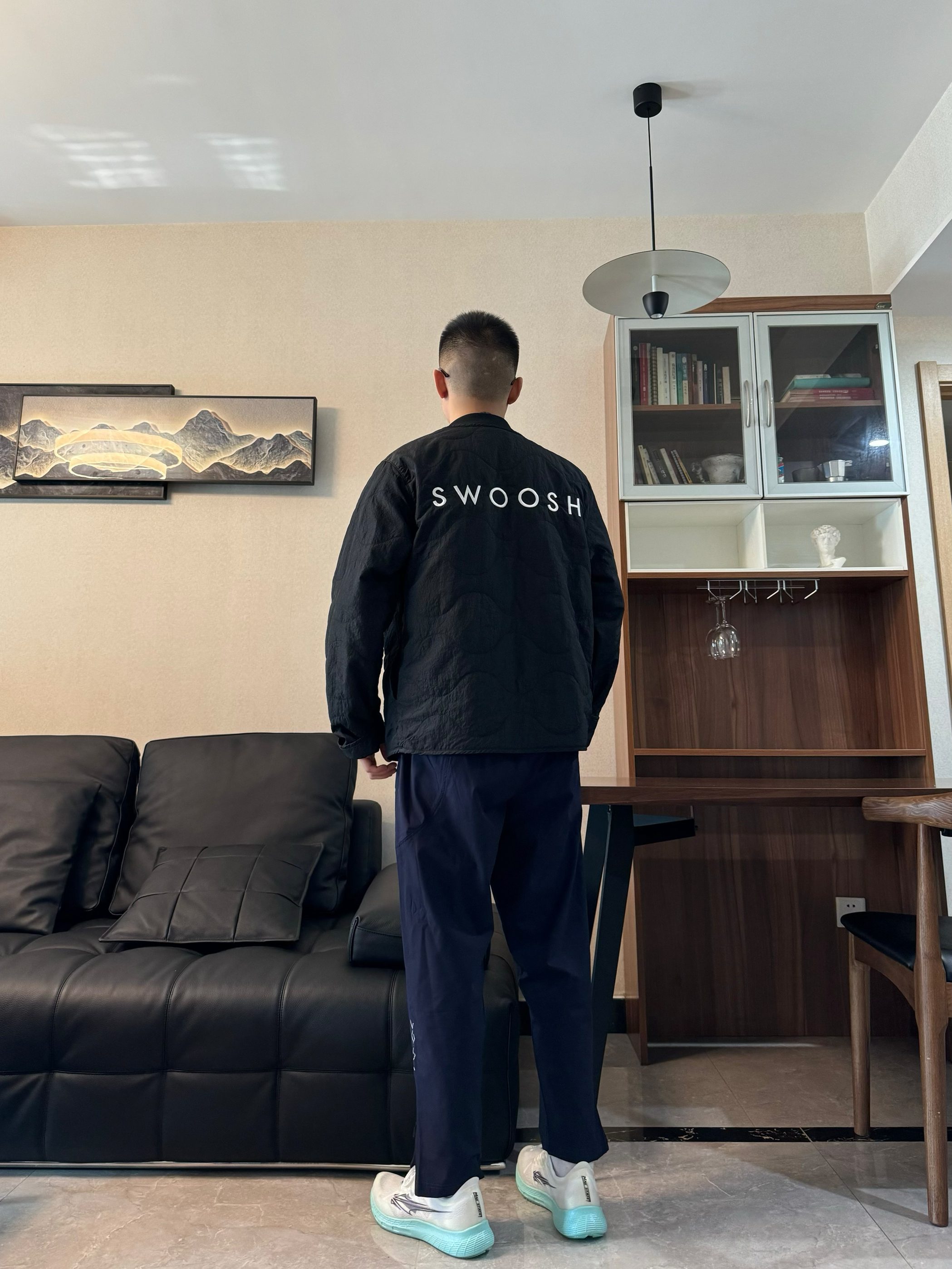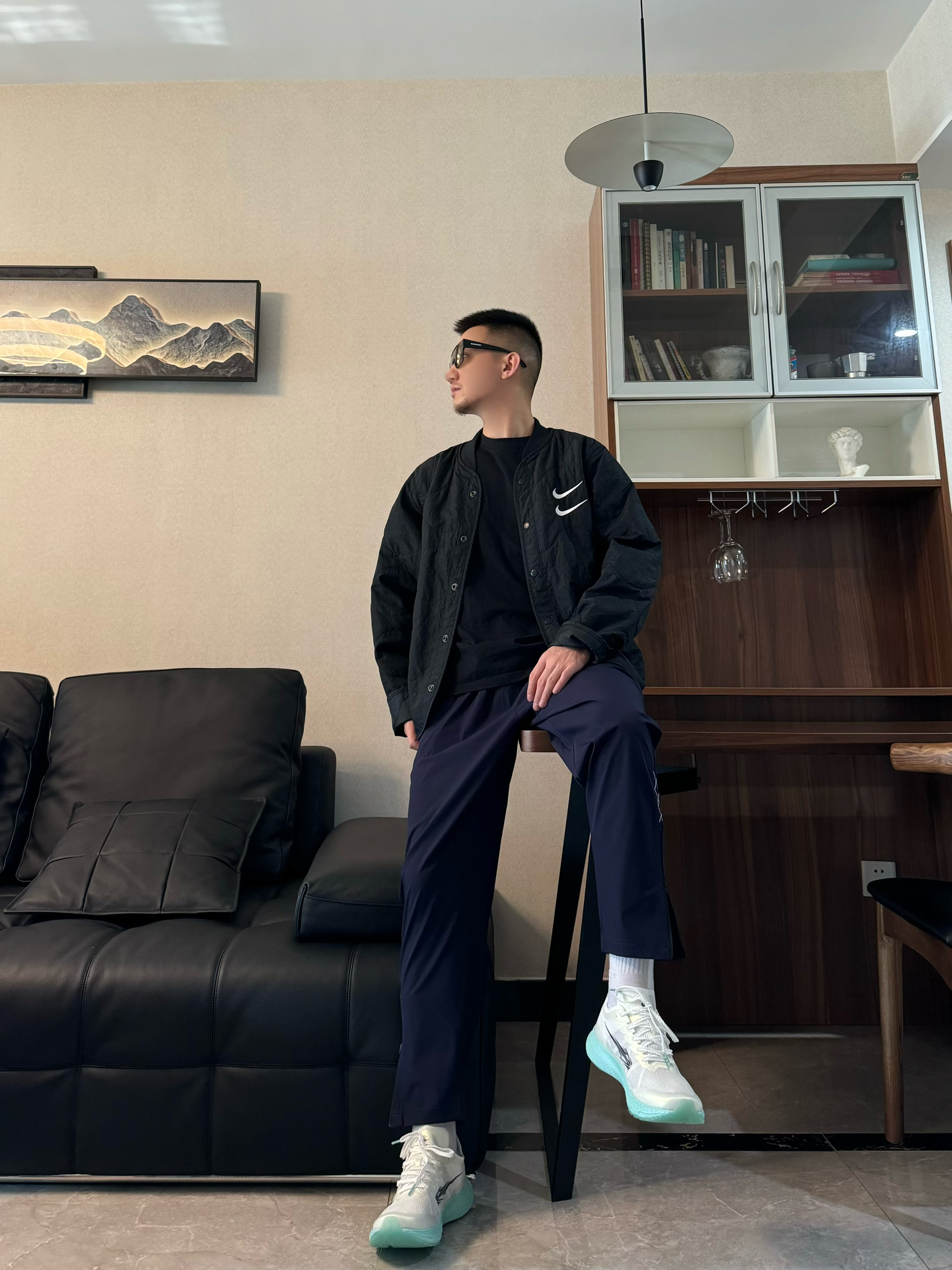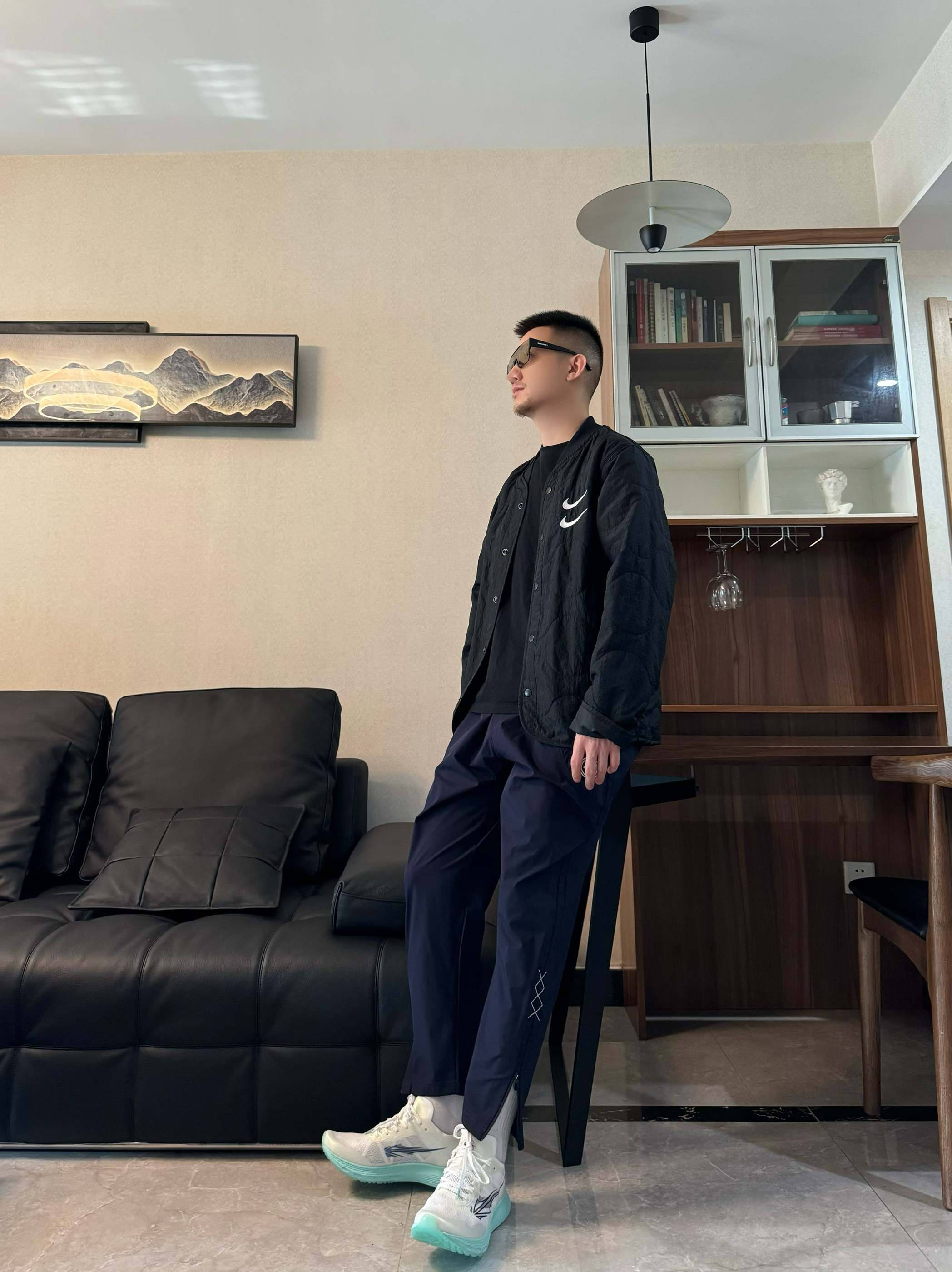 上身黑色夹层棉夹克外套 纯色配上撞色的刺绣logo 整个简约又有质感 帅气十足! 下身来一条黑色运动裤 束脚拉链设计 干净又时尚 再搭配一双跑步鞋 脚感柔软轻便 全掌碳板设计 支撑杆和回弹力都很在线 日常运动跑步休闲都很适配哦 轻松出门啦~