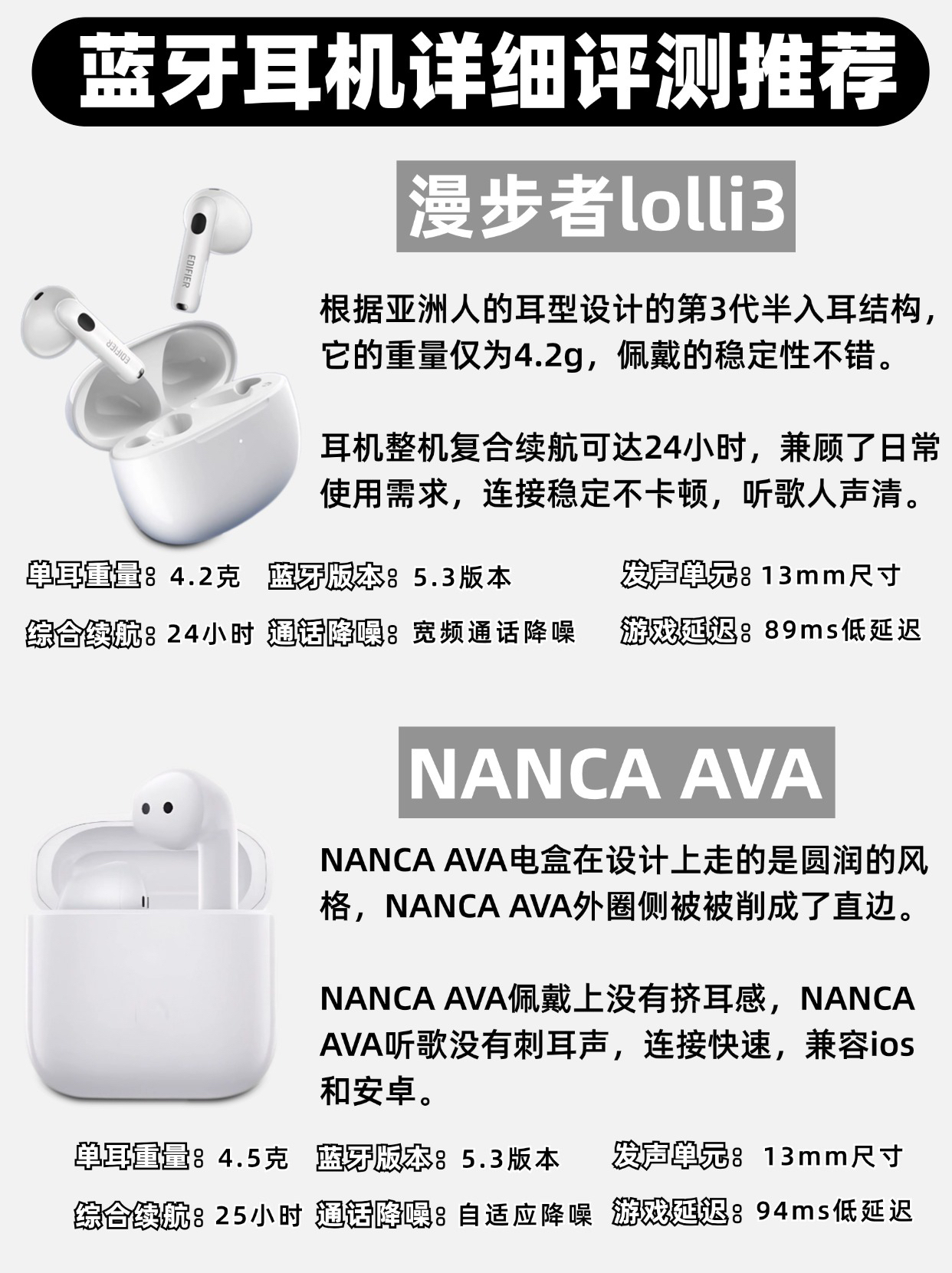 本篇笔记关联了Edifier/漫步者 LOLLI3 ANC 半入耳式 蓝牙 耳机 真无线 自适应 主动降噪 运动 舒适 跑步 云白色、iQOO TWS Air Pro 入耳式 蓝牙 耳机 真无线 主动降噪 声效舒适 跑步 运动 超长续航 星砖白、XISEM/西圣 AVA2 半入耳式无线蓝牙耳机 超长续航 超轻盈 高音质 白色等商品,为用户提供真实的使用体验和购买参考。