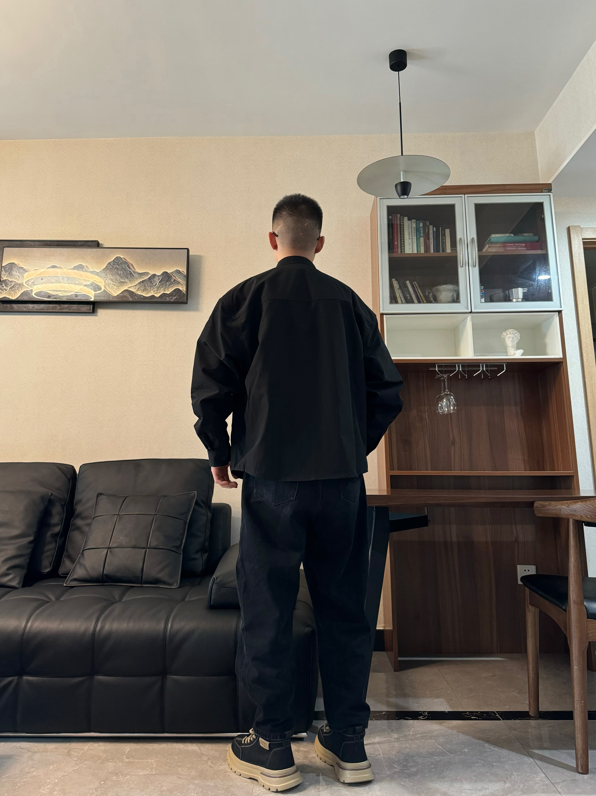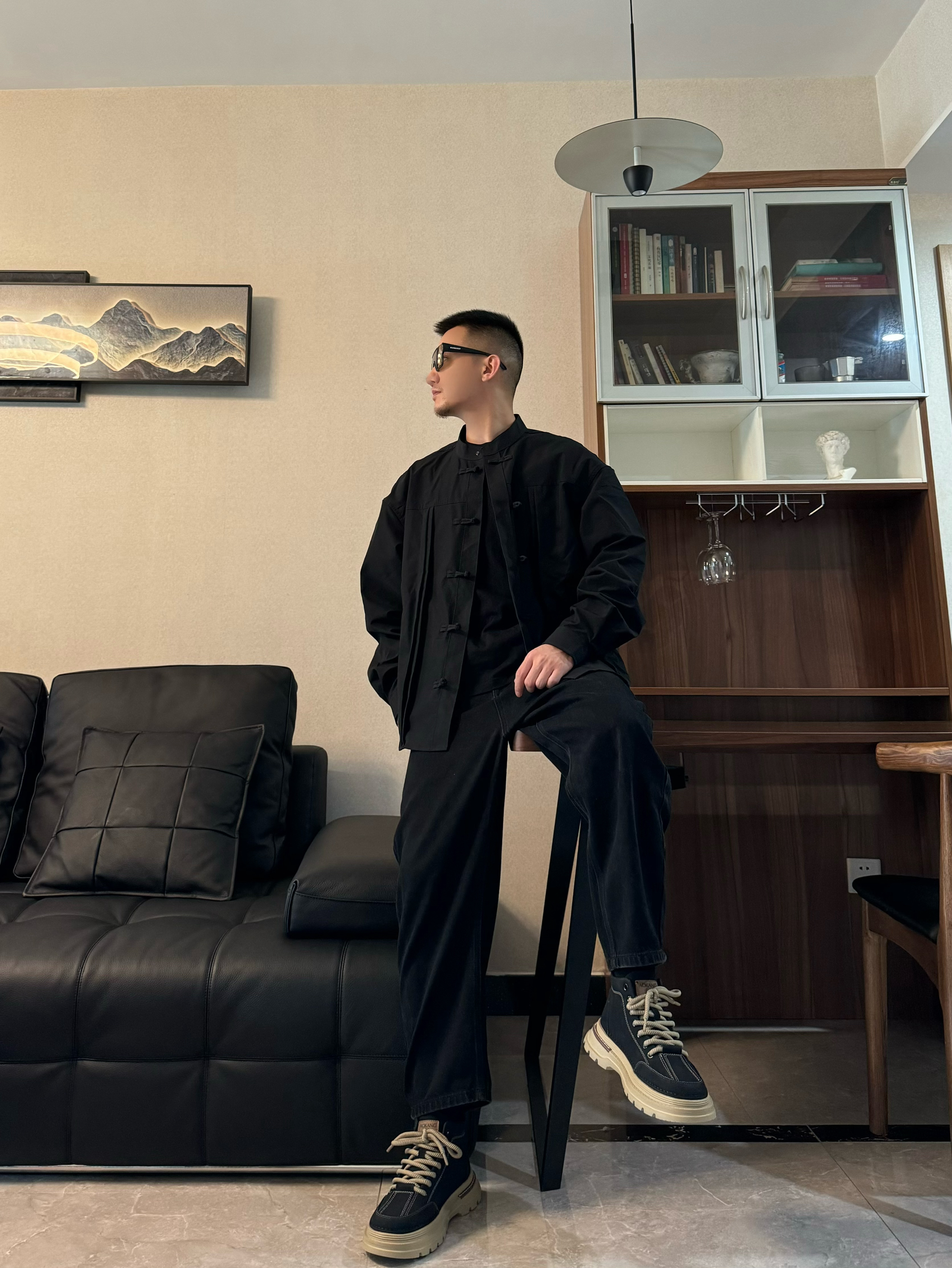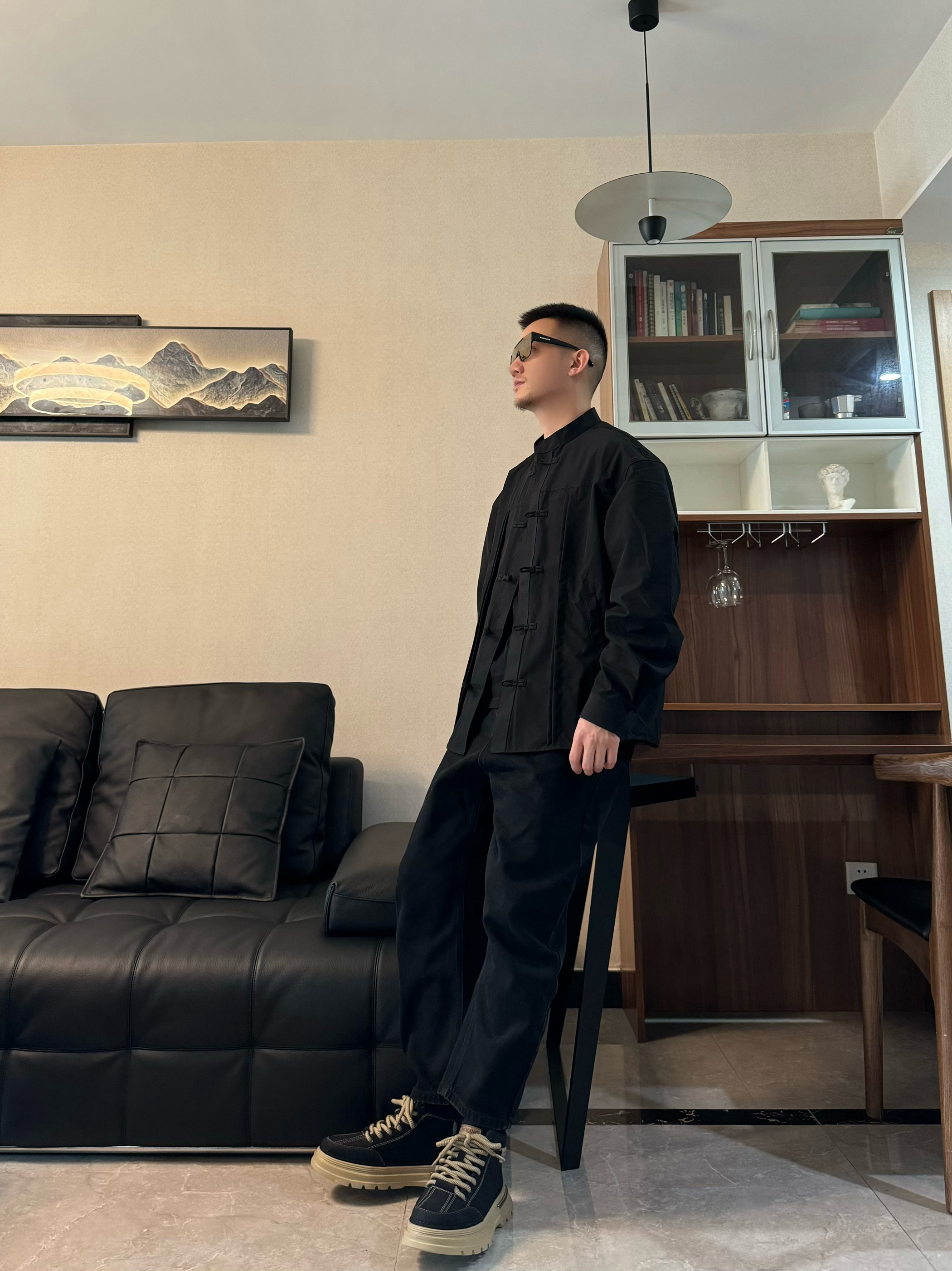 穿多了运动装 偶尔也要换换风格吧~ 上身长袖衬衫外套 中式的设计很有范儿 内搭一件黑色打底 高级感一下子就来了~ 下身来一条黑色休闲裤 直筒显高显瘦 再搭配一双复古沙漠靴 整体很有质感 脚感柔软轻便 小厚底增高效果也在线 鞋身鞋底的撞色设计细节感满满 正装还是通勤都是可以轻松驾驭的哦!