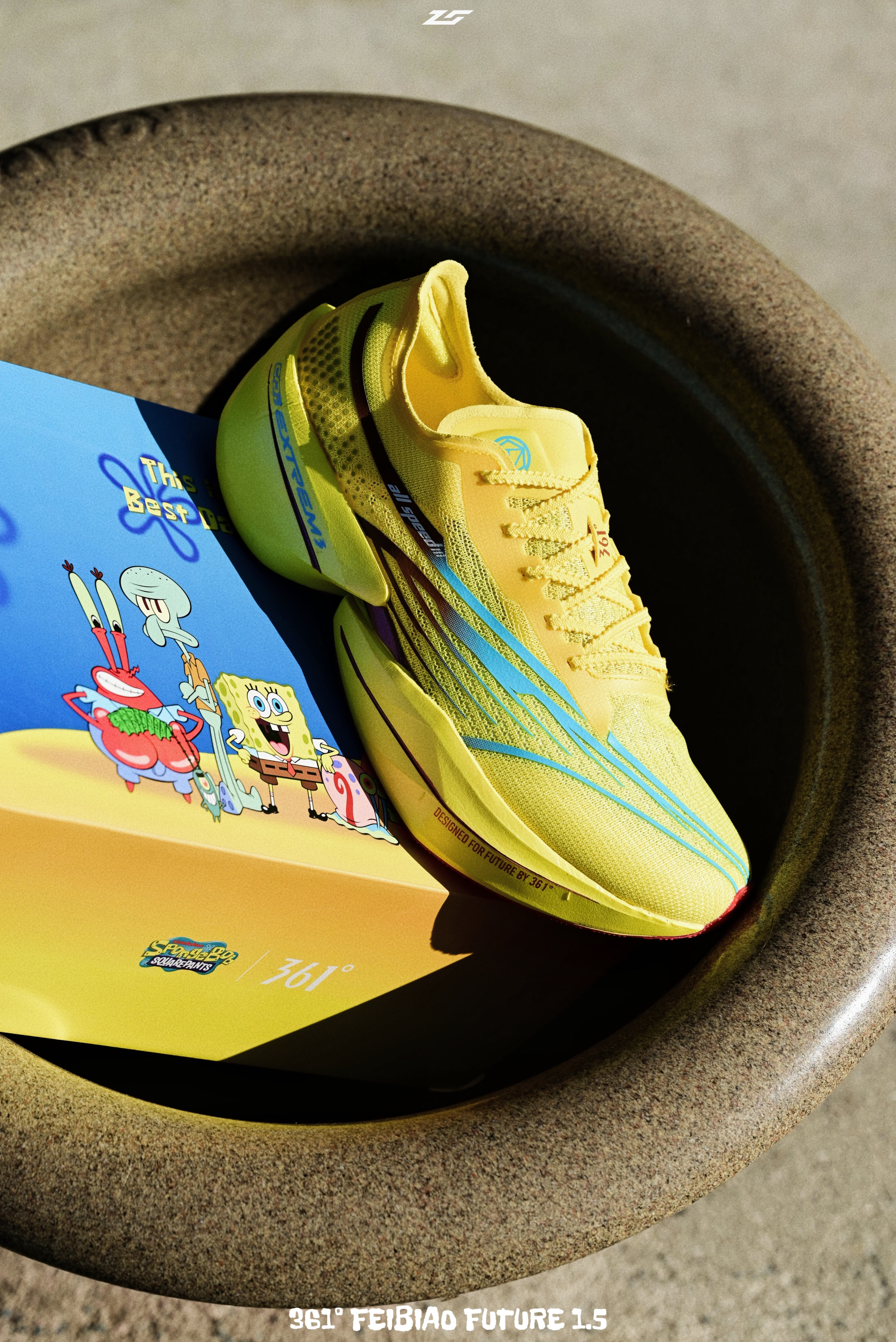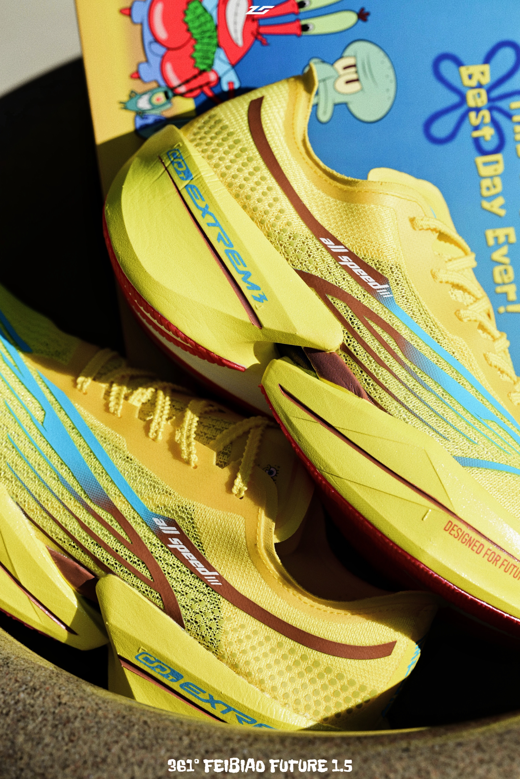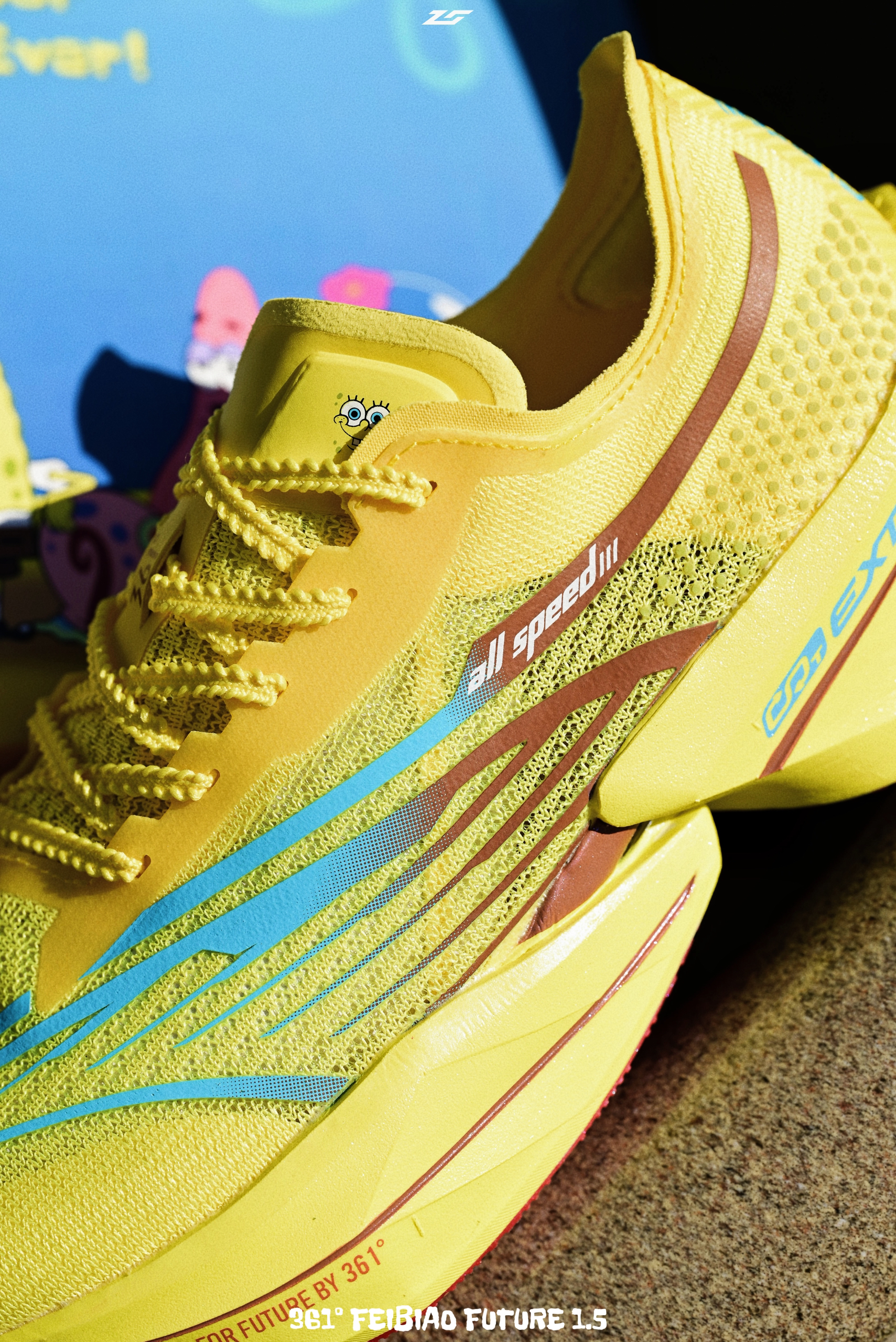 说起361°最让人印象深刻的联名鞋款,肯定少不了海绵宝宝的身影,从实战鞋到这双顶碳跑鞋飞飚Future1.5,每一双都蛮有诚意的。 从鞋盒到鞋身,满满的海绵宝宝设计元素,如果只入一双联名,我建议还是海绵宝宝角色,一样扎眼的外观,但更有辨识度。 1.5改动了鞋面,从1的袜套设计改成了正常的分离鞋舌设计,更适合大部分人。 中底还是粗胚发泡+刚性十足的大碳板,价格不算贵,但是要量力而行,门槛还是偏高的。